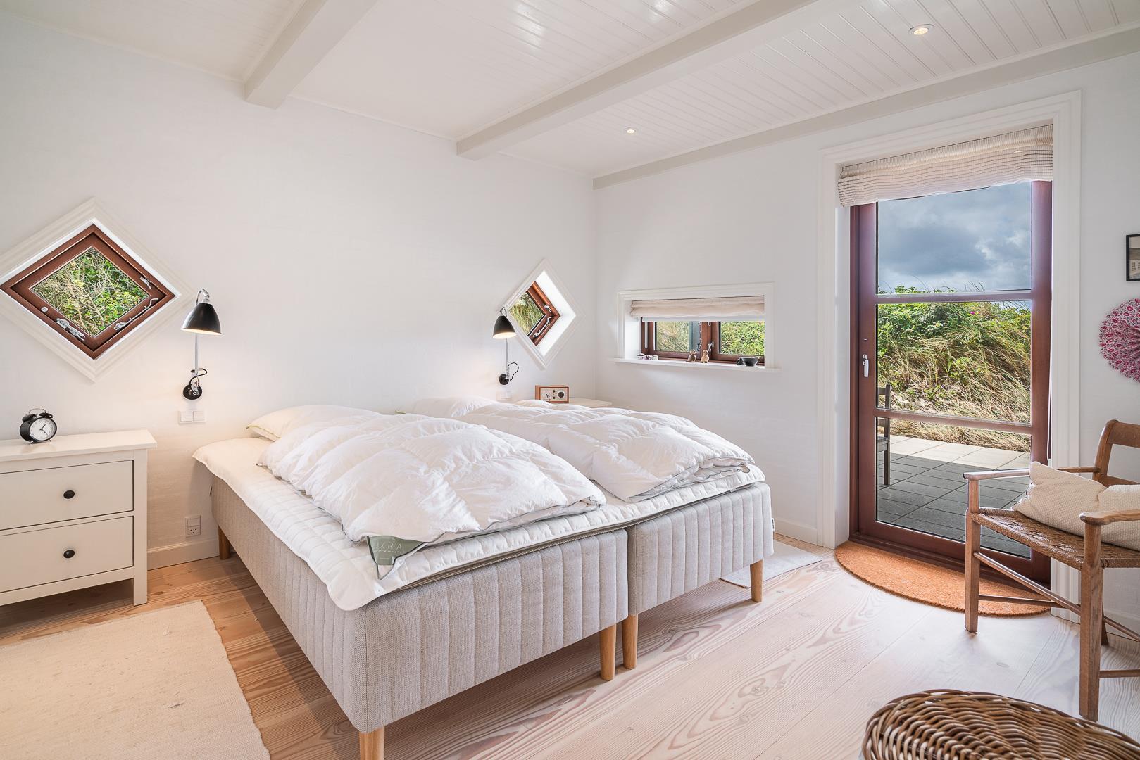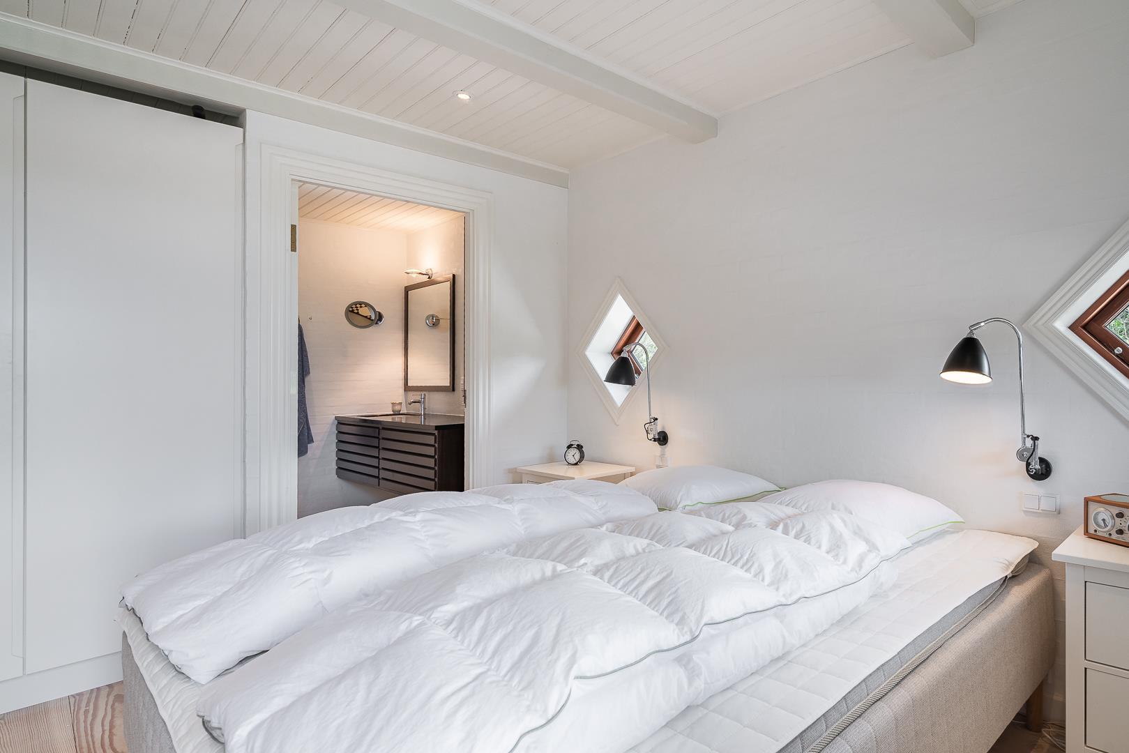 Der er plads til 5 personer, så man kan fordele sige i 3 dobbeltværelser, hvoraf det ene har direkte indgang fra det store soverum. I husets bryggers finder I både vaskemaskine og tørretumbler.