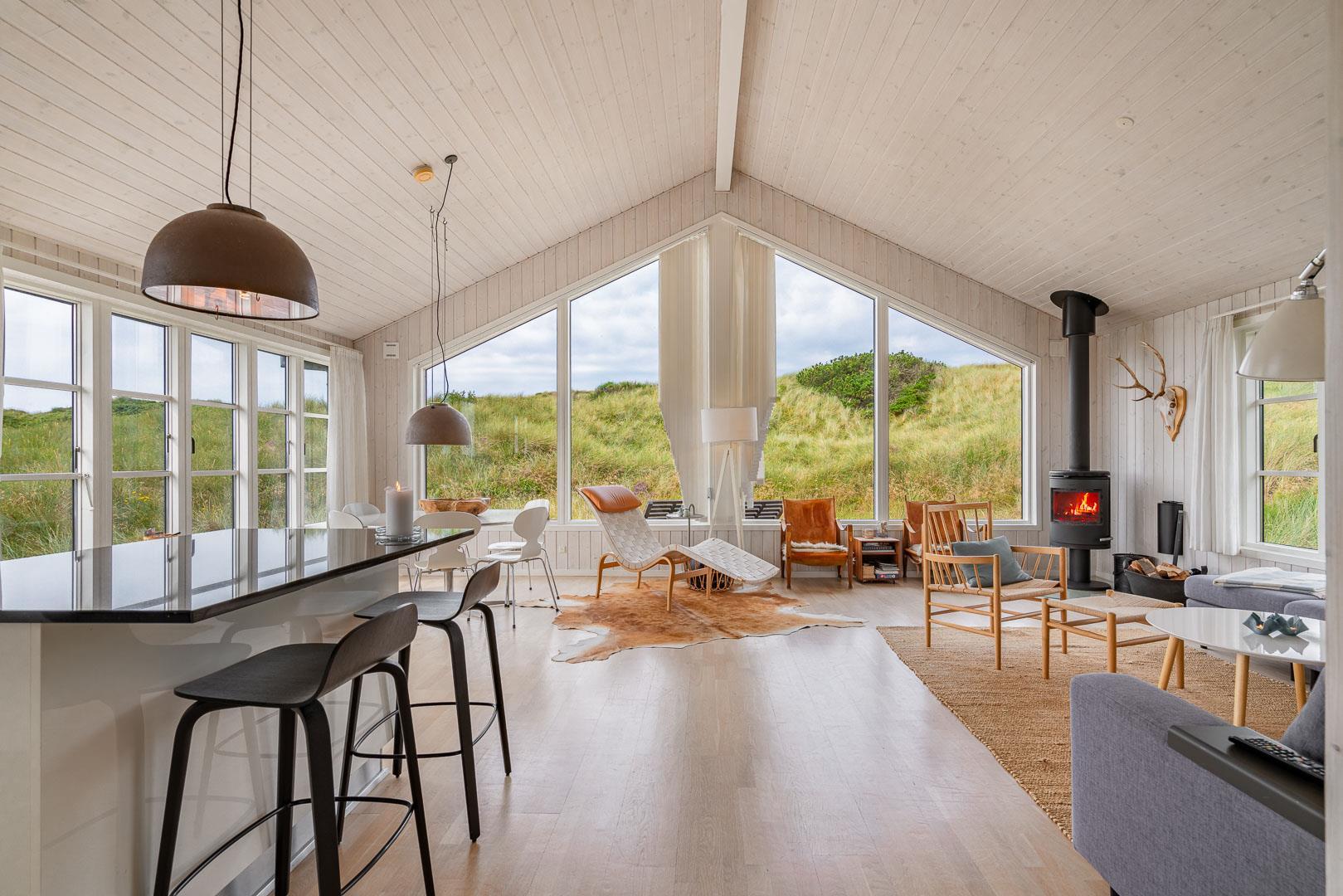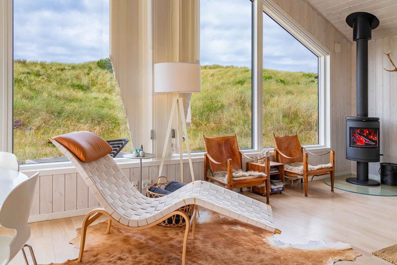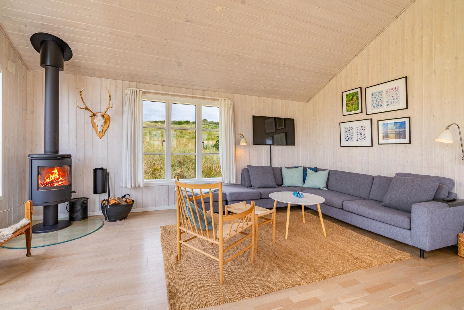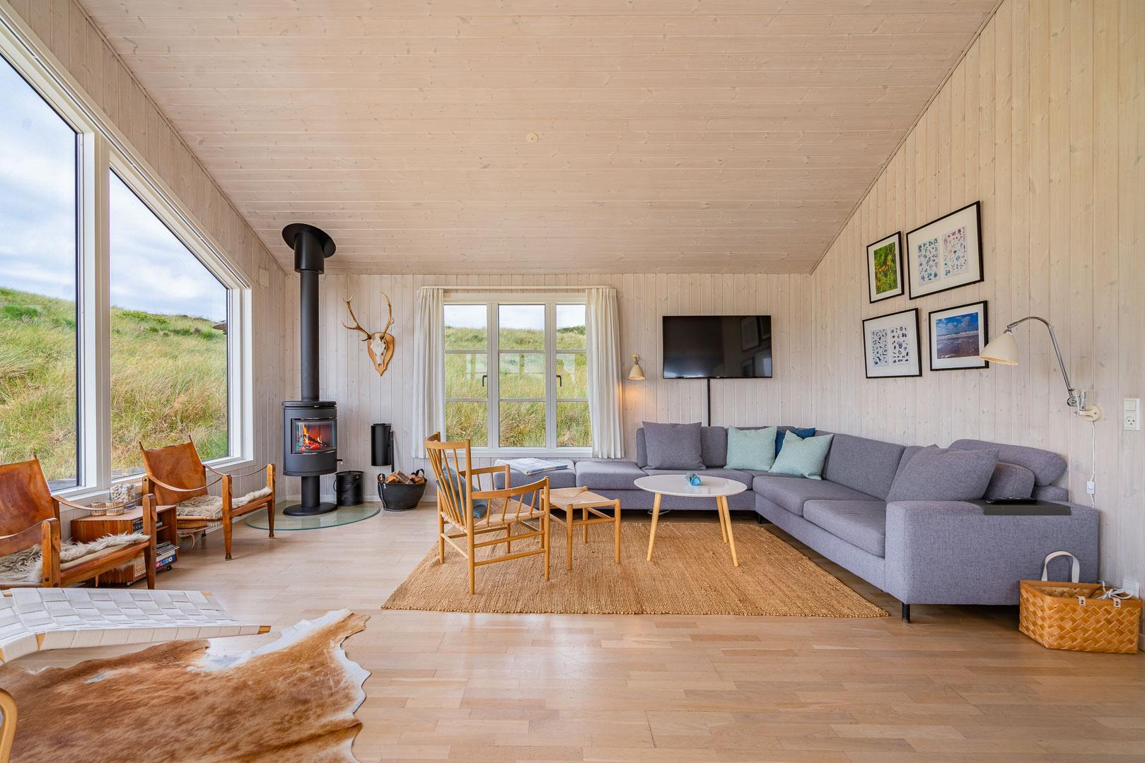 Når du træder gennem entreen og helt ind i sommerhuset, bydes du velkommen i en helt fantastisk lys og rummelig stue. Naturens farver danner et smukt bagtæppe i det flotte rum, som er indrettet med møbler og interiør i afdæmpede nuancer og personlige kunstgenstande på væggene.