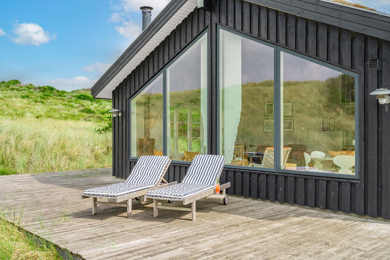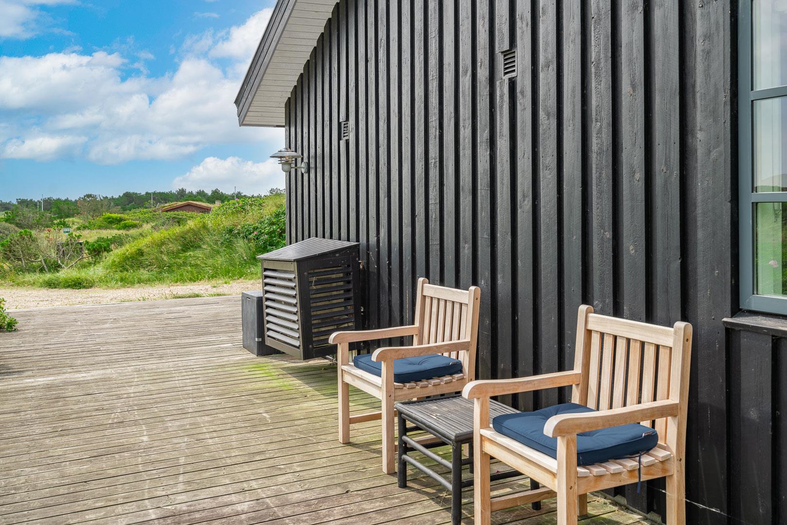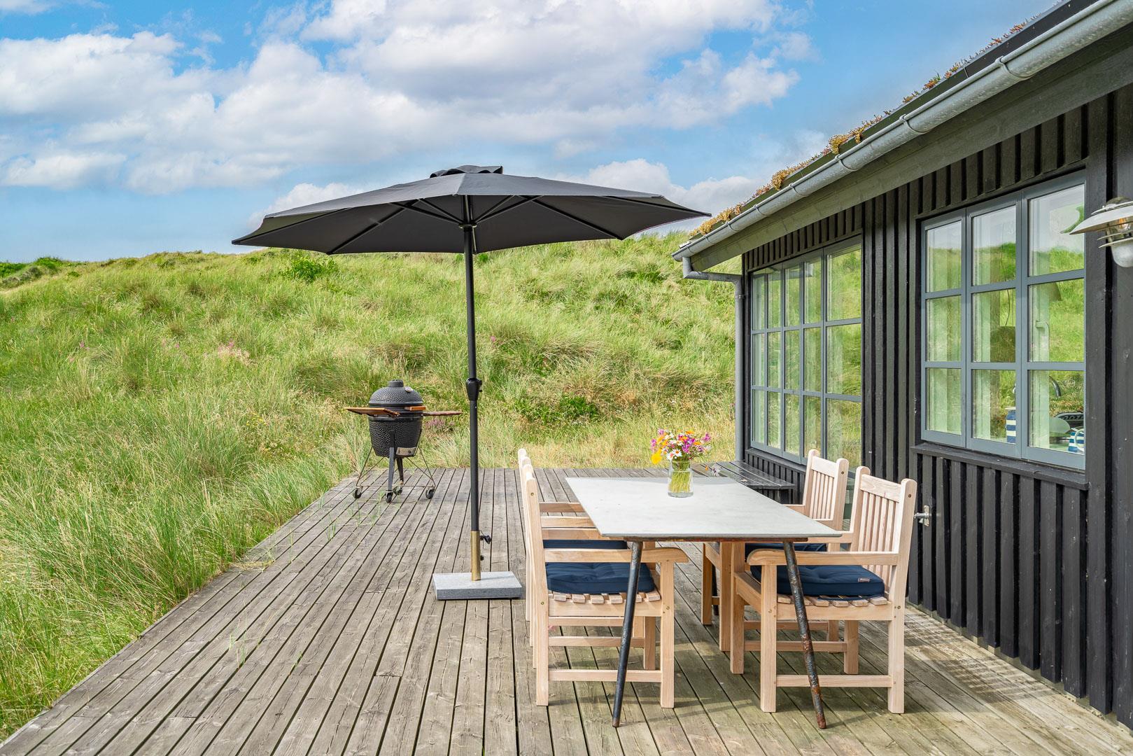 Når vejret er til det, kan I gå gennem stuens glasdør og videre ud på træterrassen, som smyger sig hele vejen rundt om huset. Her er det muligt både at finde en solstråle til morgenens pocherede æg, til den lette frokostsalat og til middagen om aftenen.