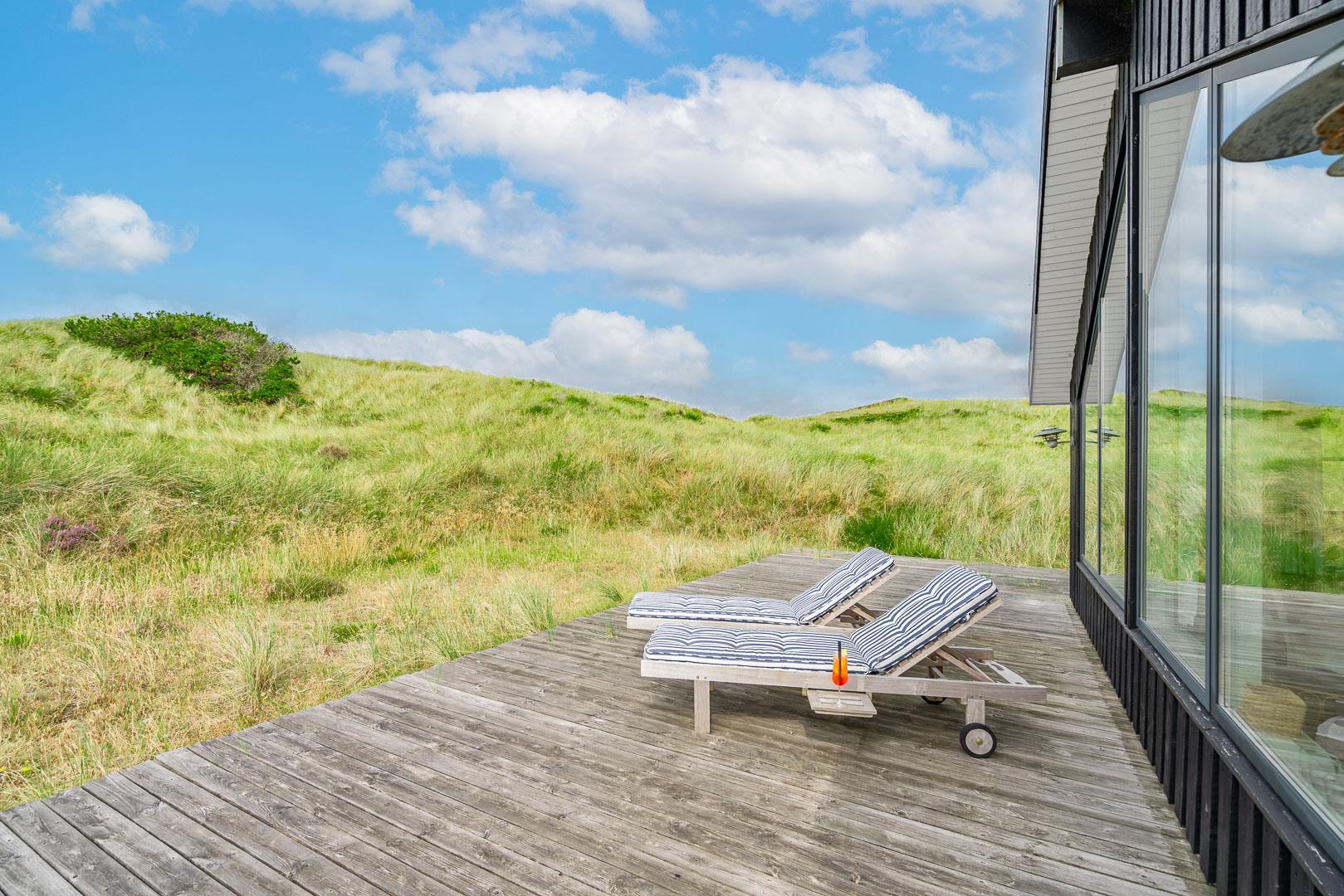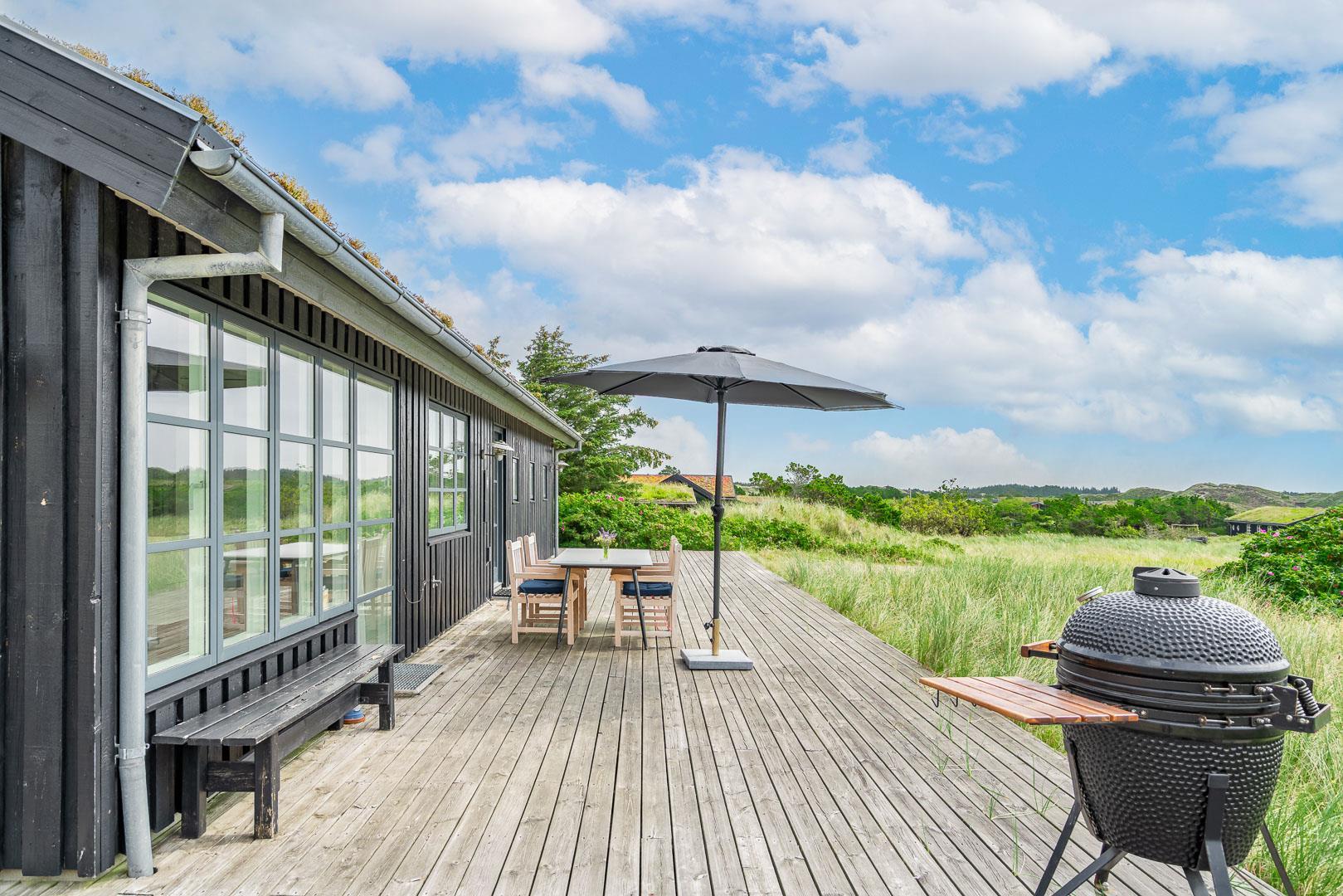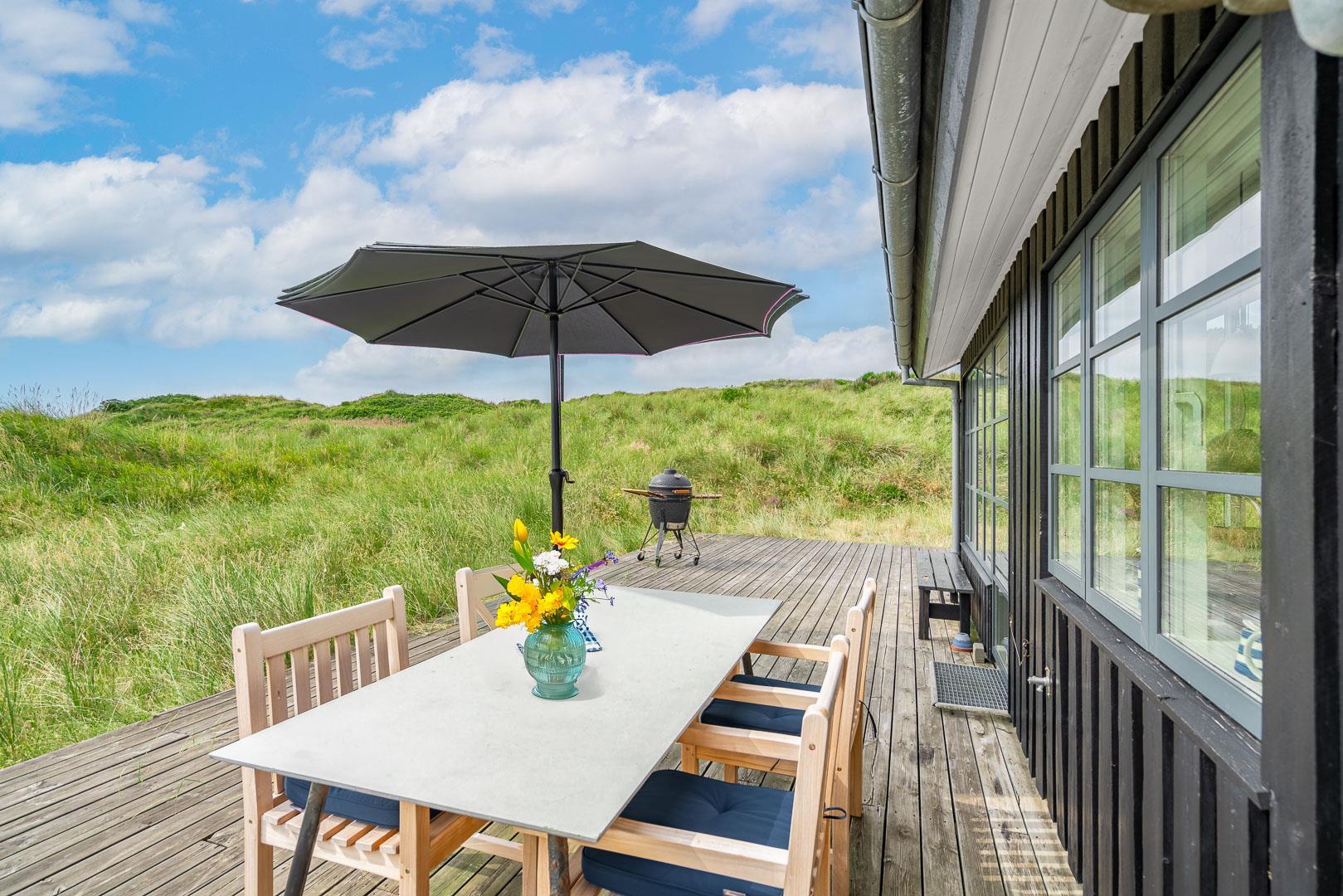 Når vejret er til det, kan I gå gennem stuens glasdør og videre ud på træterrassen, som smyger sig hele vejen rundt om huset. Her er det muligt både at finde en solstråle til morgenens pocherede æg, til den lette frokostsalat og til middagen om aftenen.