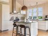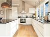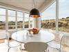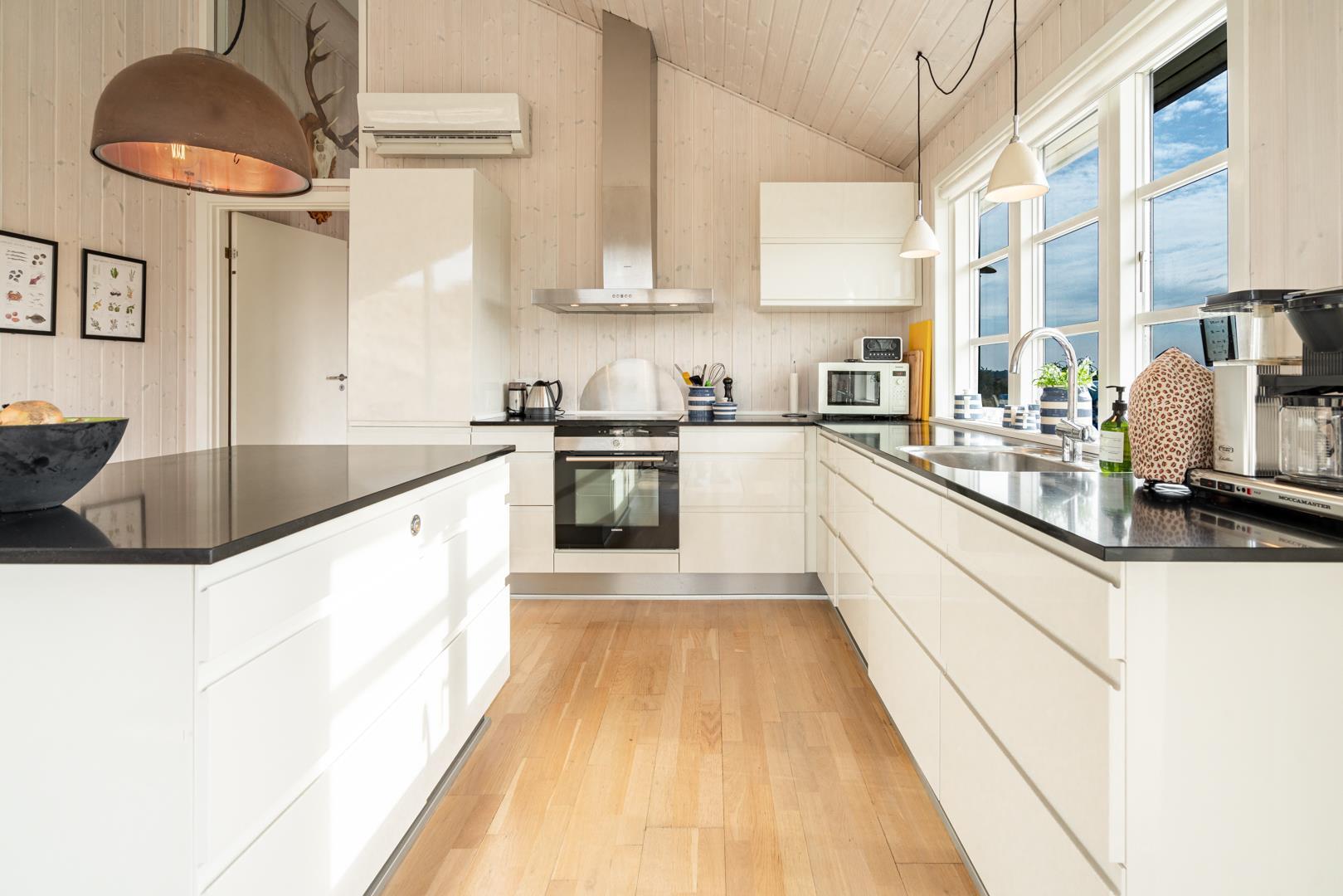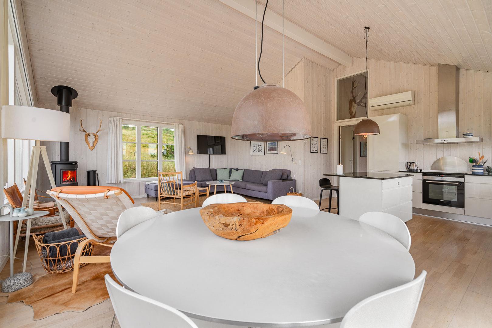 Køkkenet er integreret i stuen, så den gode samtale kan fortsætte, når det er tid til at forberede det næste måltid. Dagens kok kan blot gå i gang ved de blanke bordplader og samtidig være sammen med resten af flokken, der nyder en aperitif ved det runde spisebord eller ved brændeovnen i den lækre sofa.