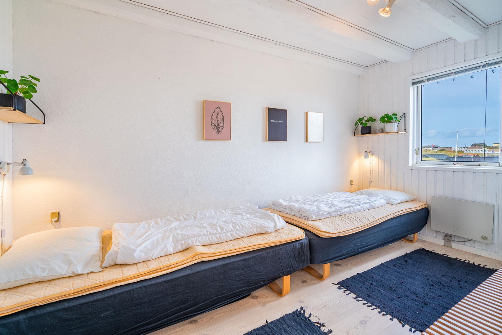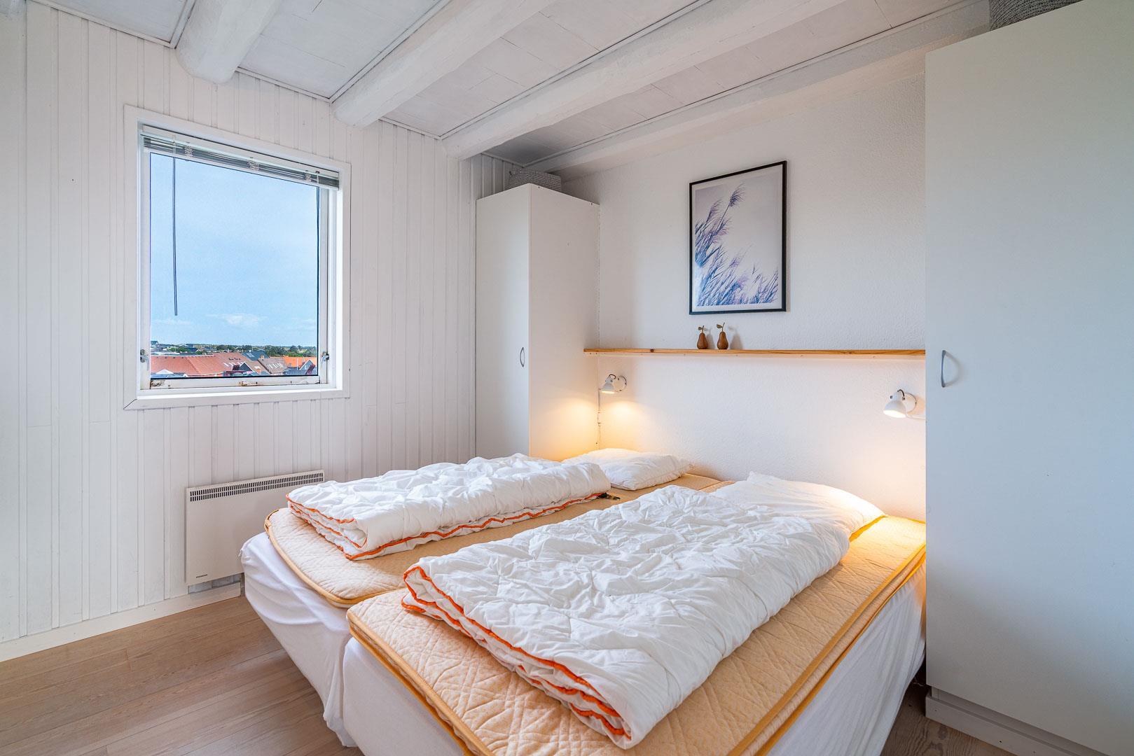 Der er to soveværelser i lejligheden – ét med dobbeltseng (180 x 200 cm) og ét med to enkeltsenge (90 x 200 cm), begge med gode madrasser og et roligt udtryk.