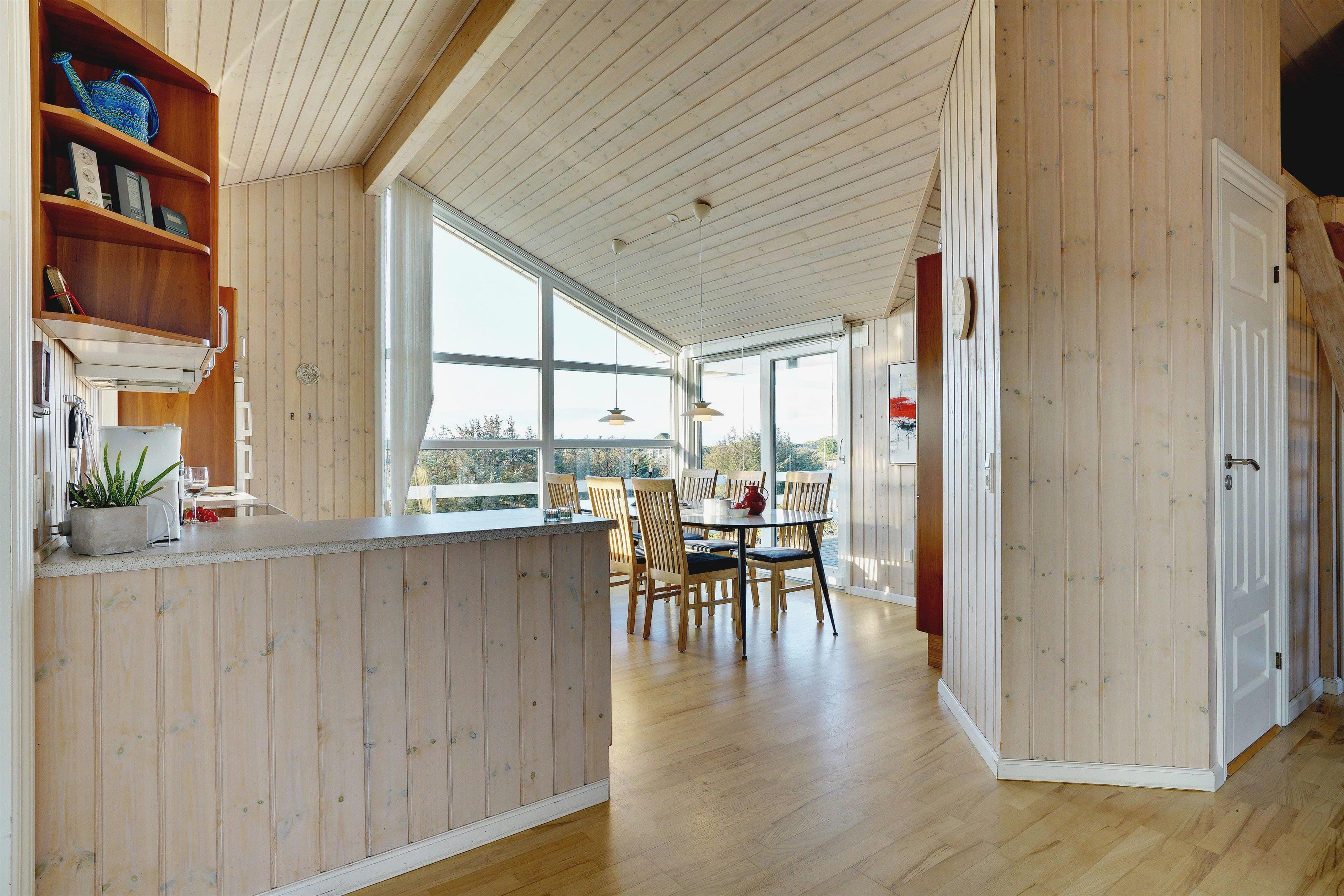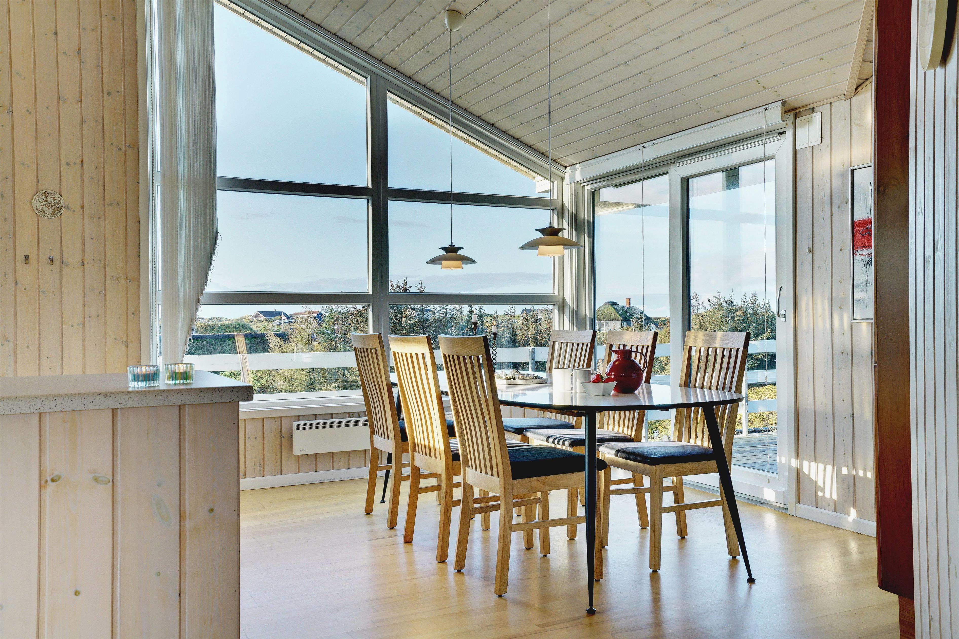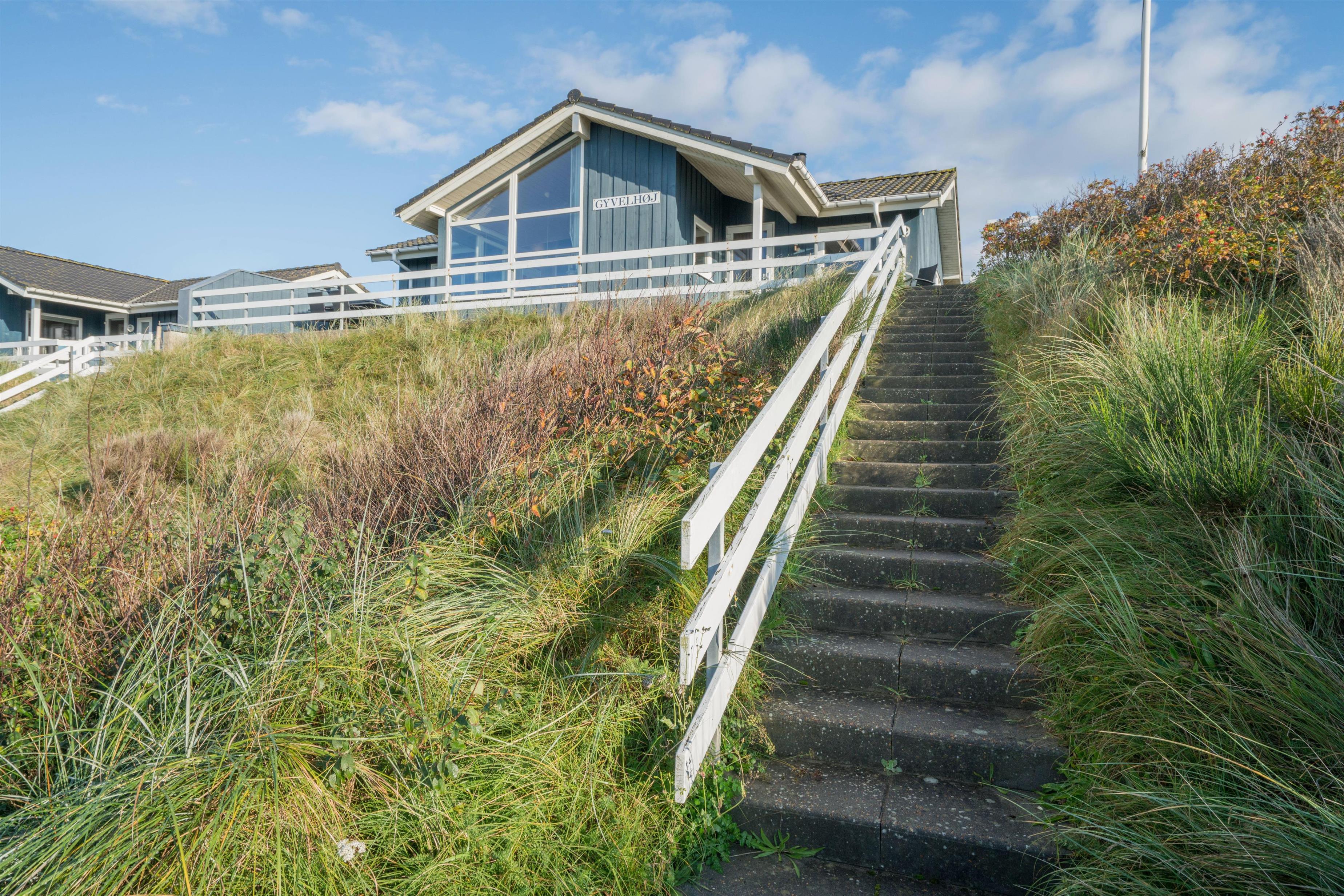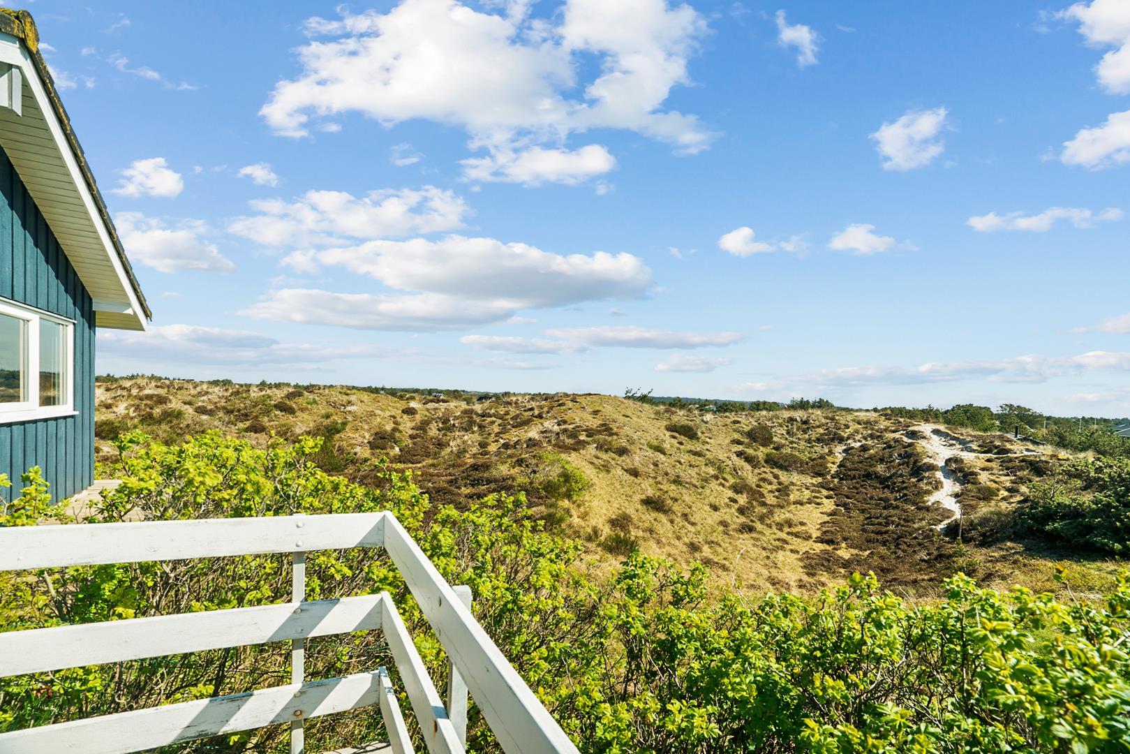 På toppen af en klit, med en pragtfuld udsigt over området, ligger dette skønne og velpassede feriehus. Det veludstyrede køkken ligger i åben forbindelse med stuen, som er indrettet med gode og moderne møbler. Dejligt badeværelse med badekar. Stor hems. På den store træterrasse der omkranser huset kan solen og den flotte udsigt nydes i alle døgnets lyse timer.
