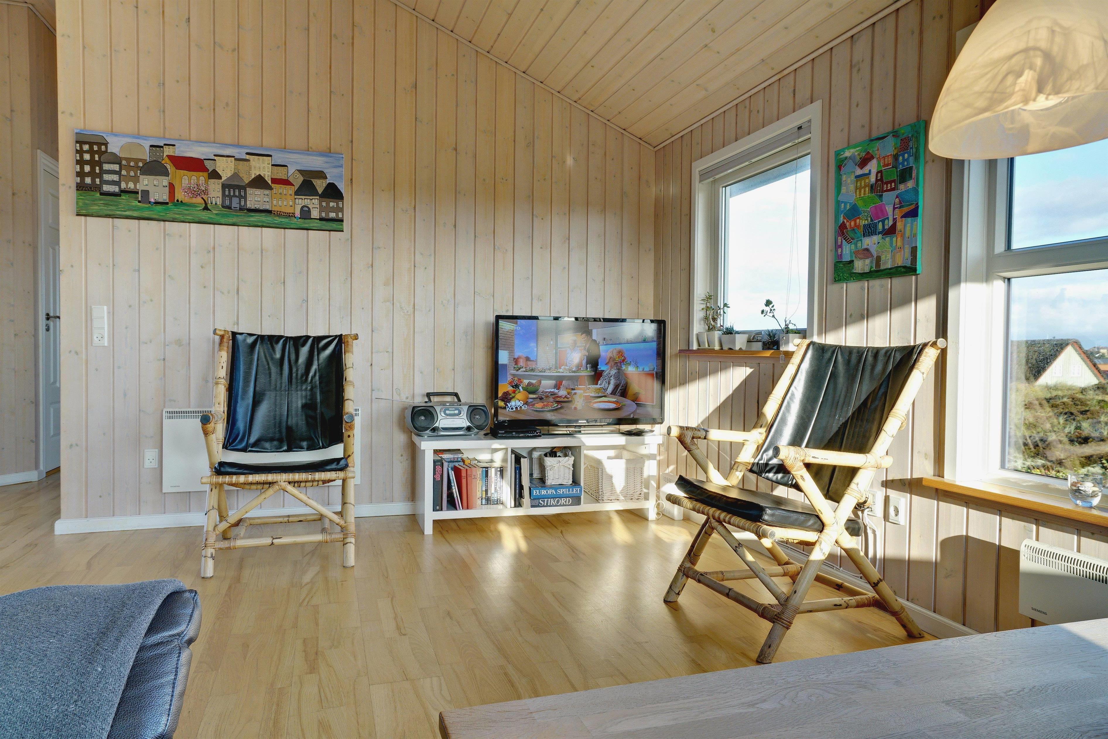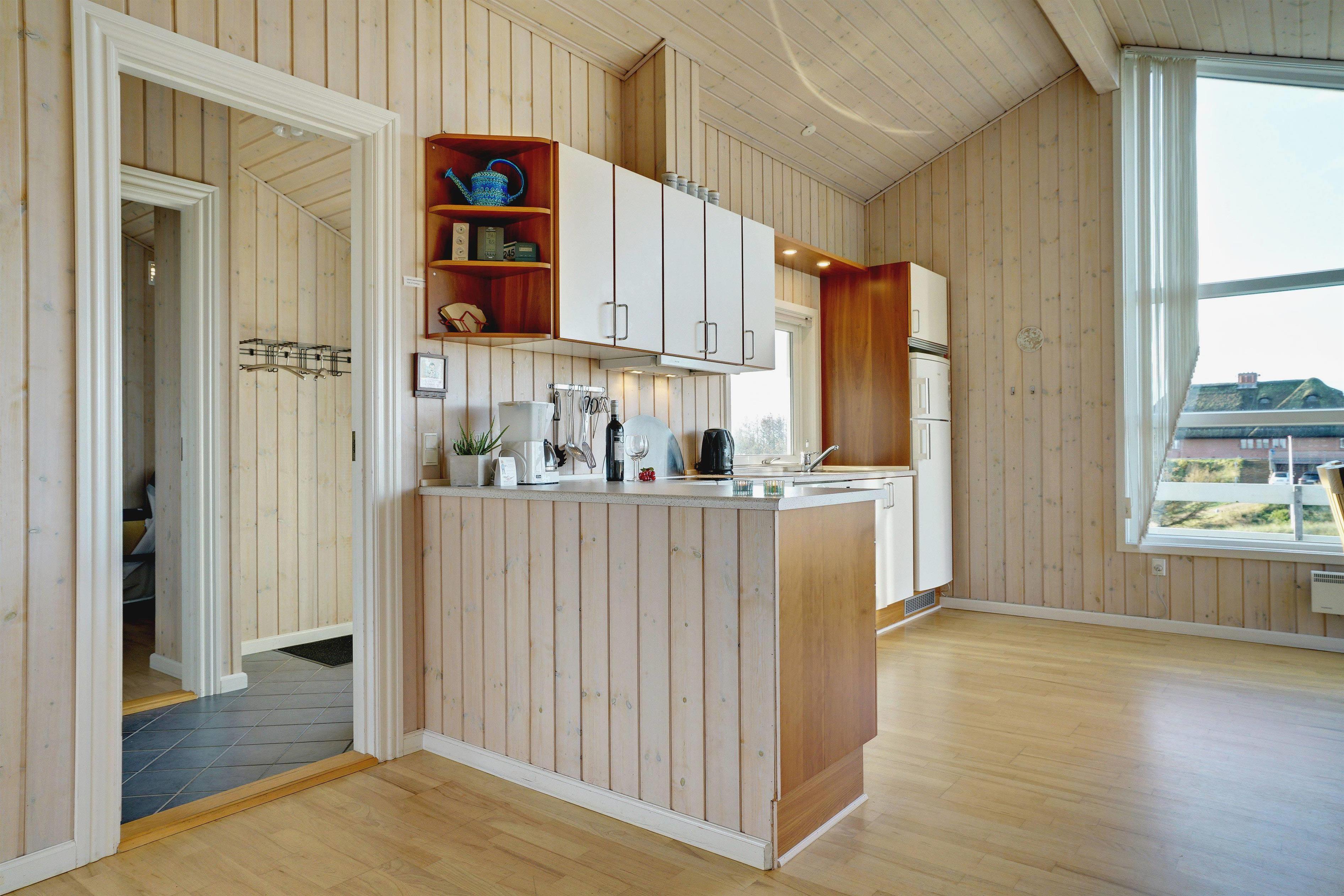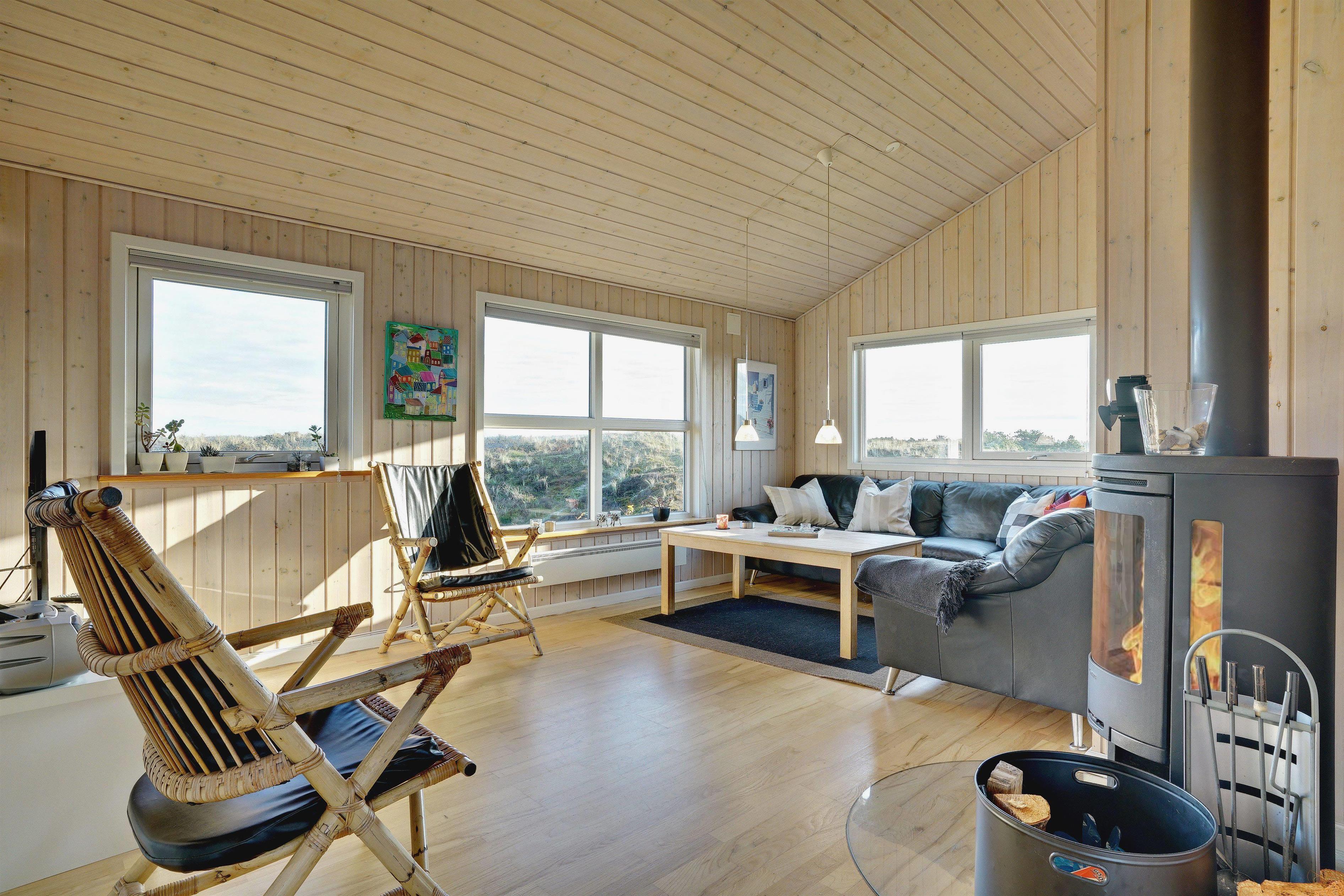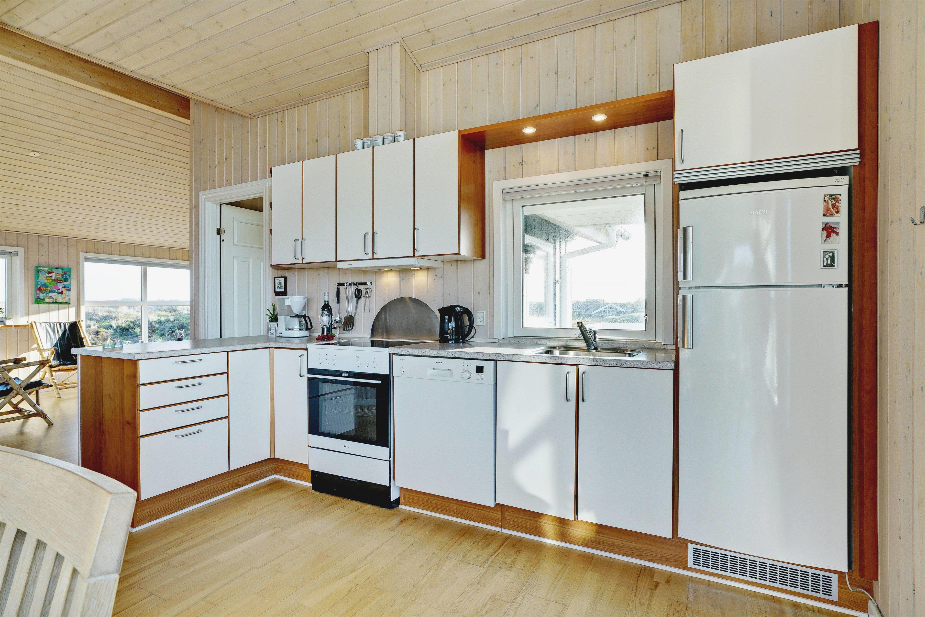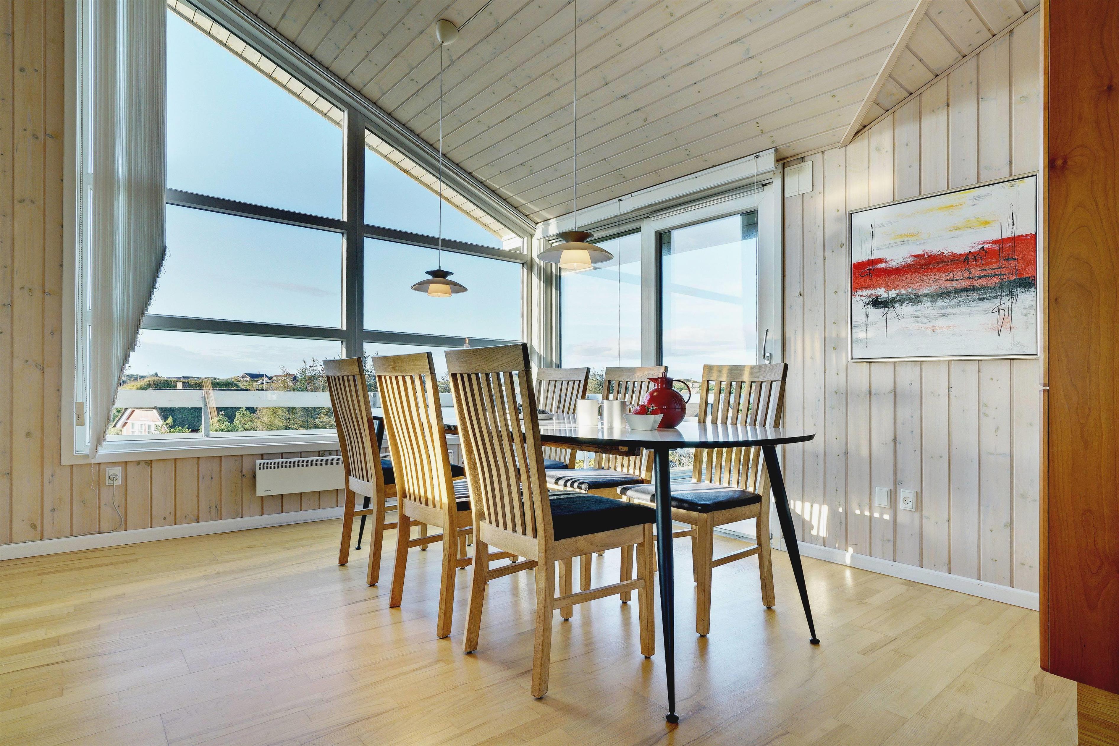 På toppen af en klit, med en pragtfuld udsigt over området, ligger dette skønne og velpassede feriehus. Det veludstyrede køkken ligger i åben forbindelse med stuen, som er indrettet med gode og moderne møbler. Dejligt badeværelse med badekar. Stor hems. På den store træterrasse der omkranser huset kan solen og den flotte udsigt nydes i alle døgnets lyse timer.