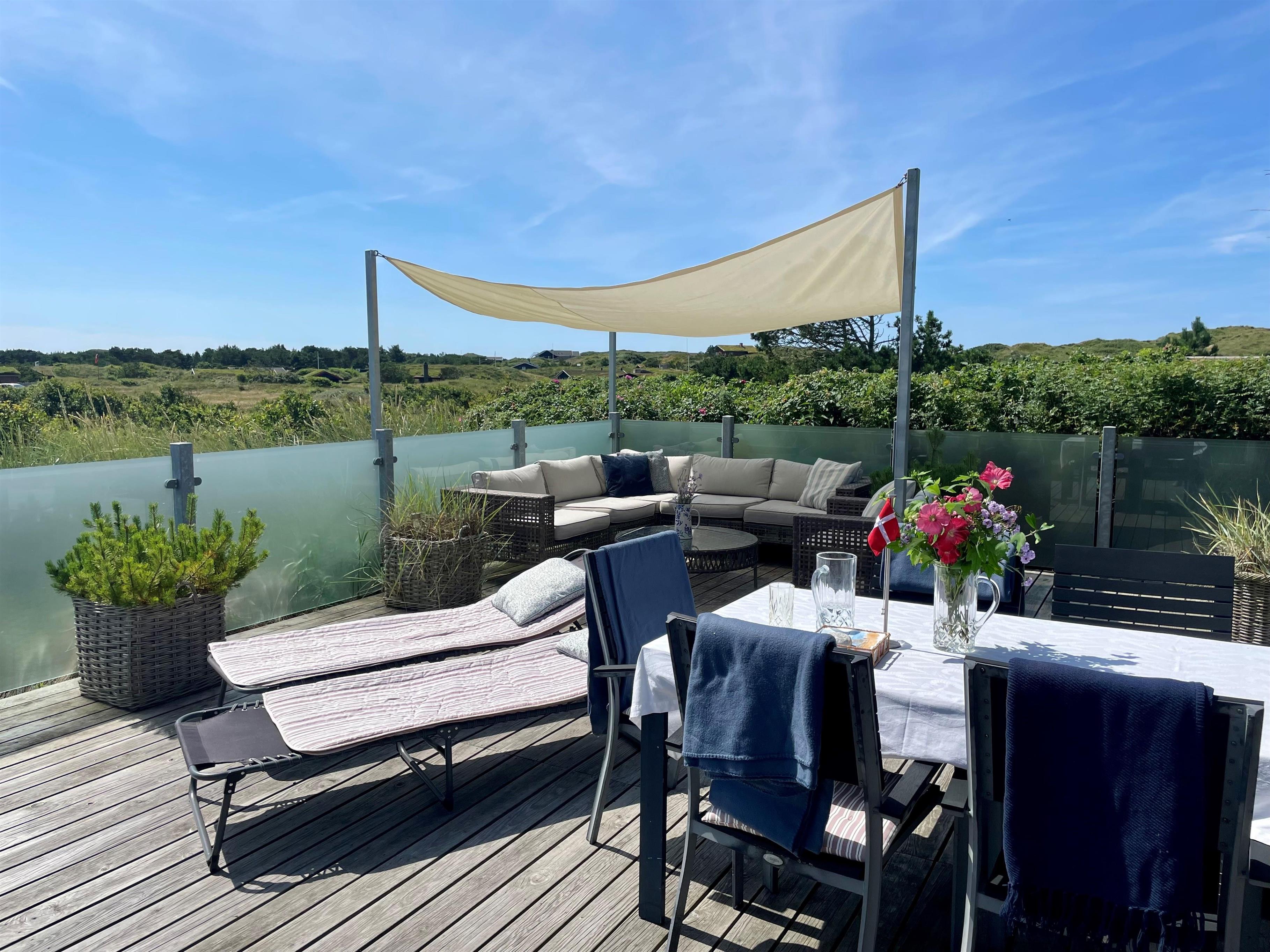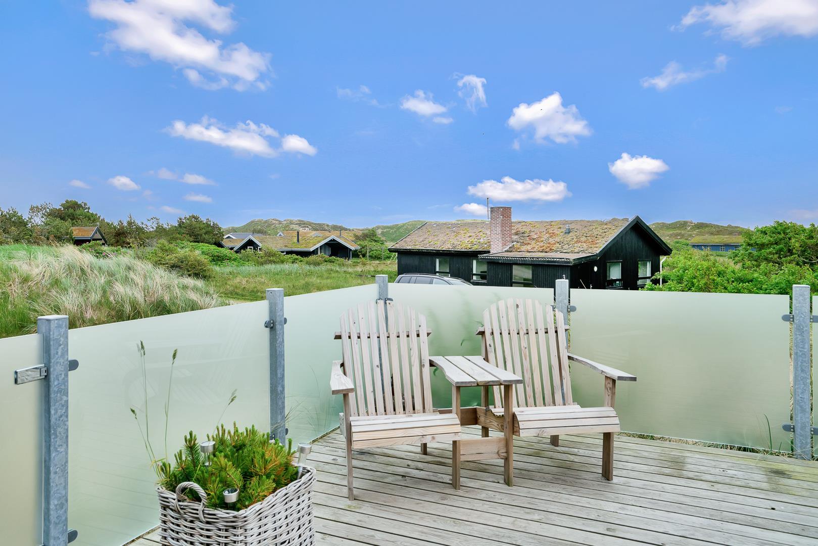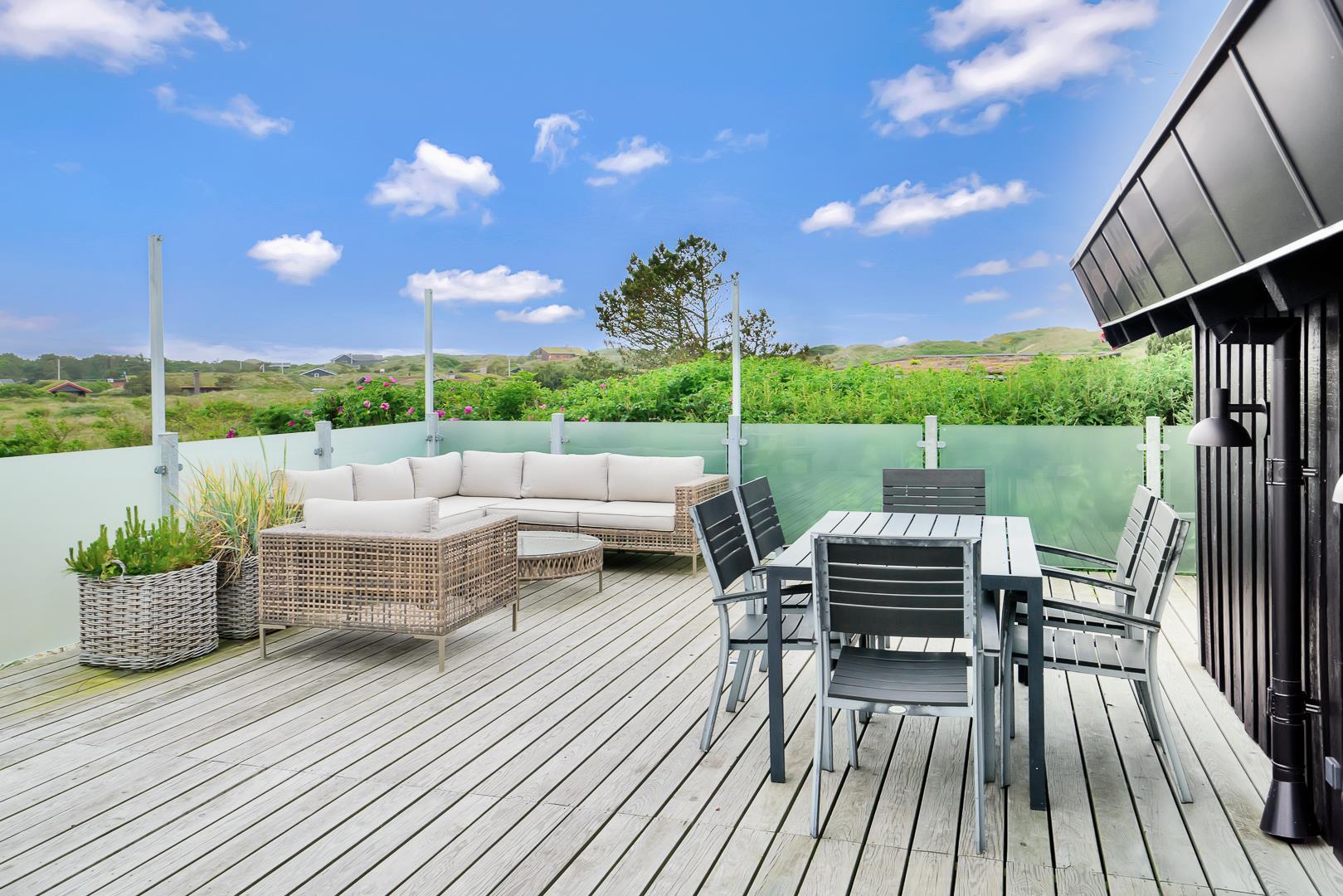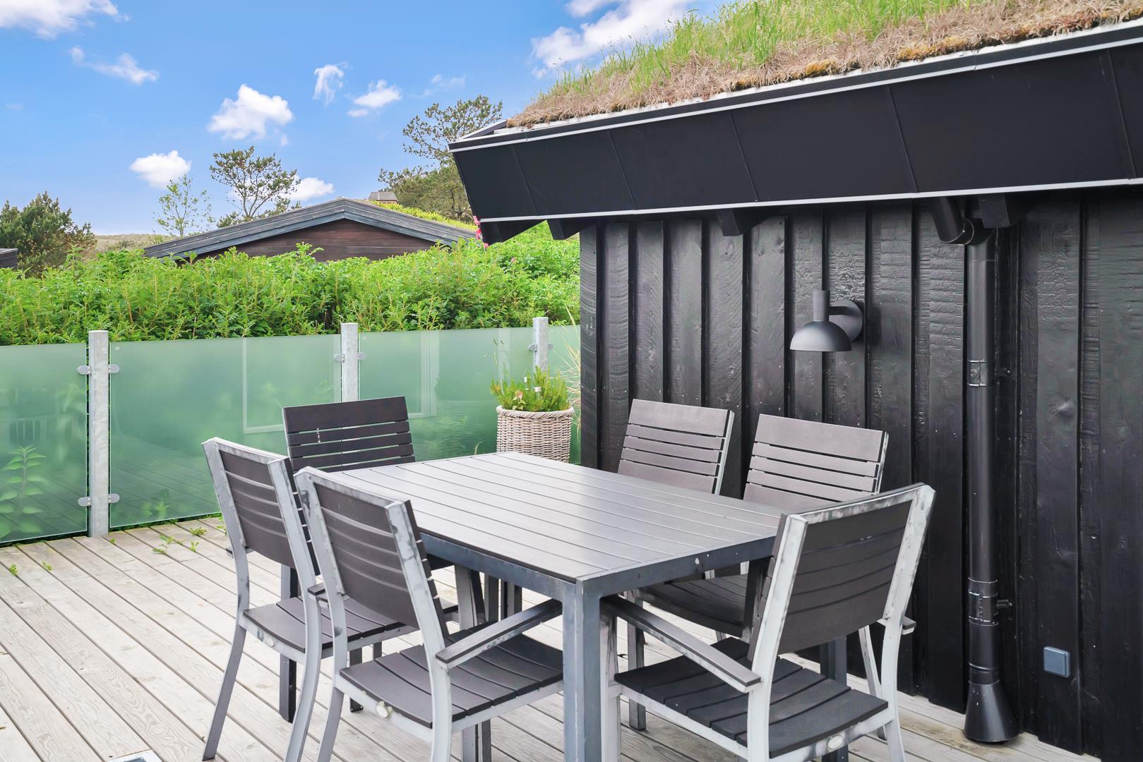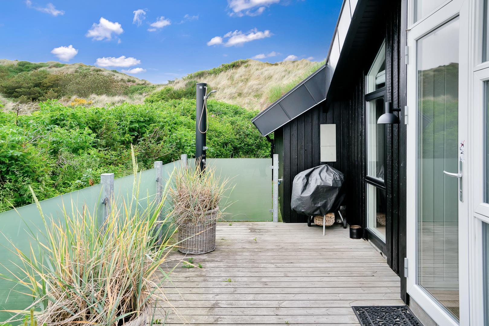 Udendørs venter en stor, læfuld træterrasse, hvor I kan nyde solen hele dagen og lade blikket vandre ud over det smukke landskab. Her er masser af plads til både grillhygge, afslapning og udeliv.