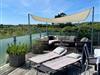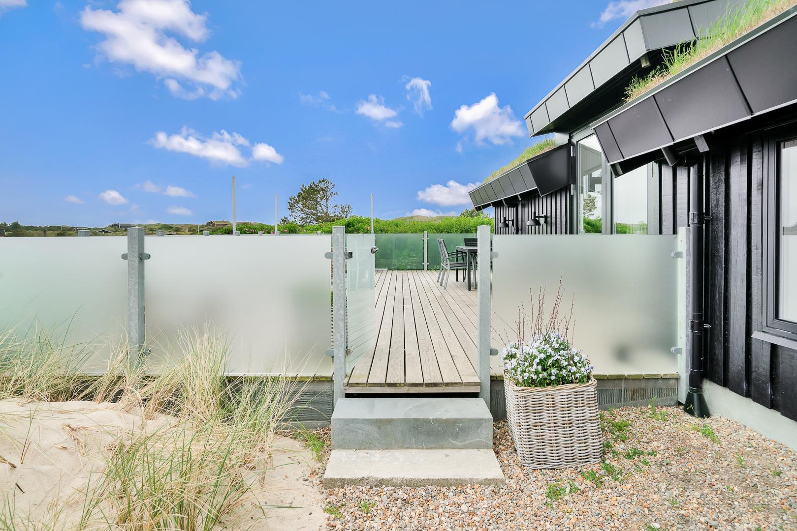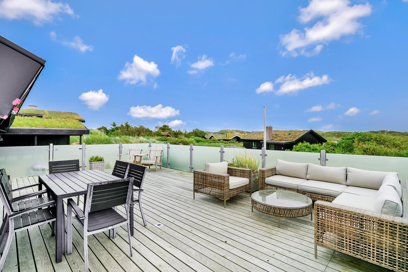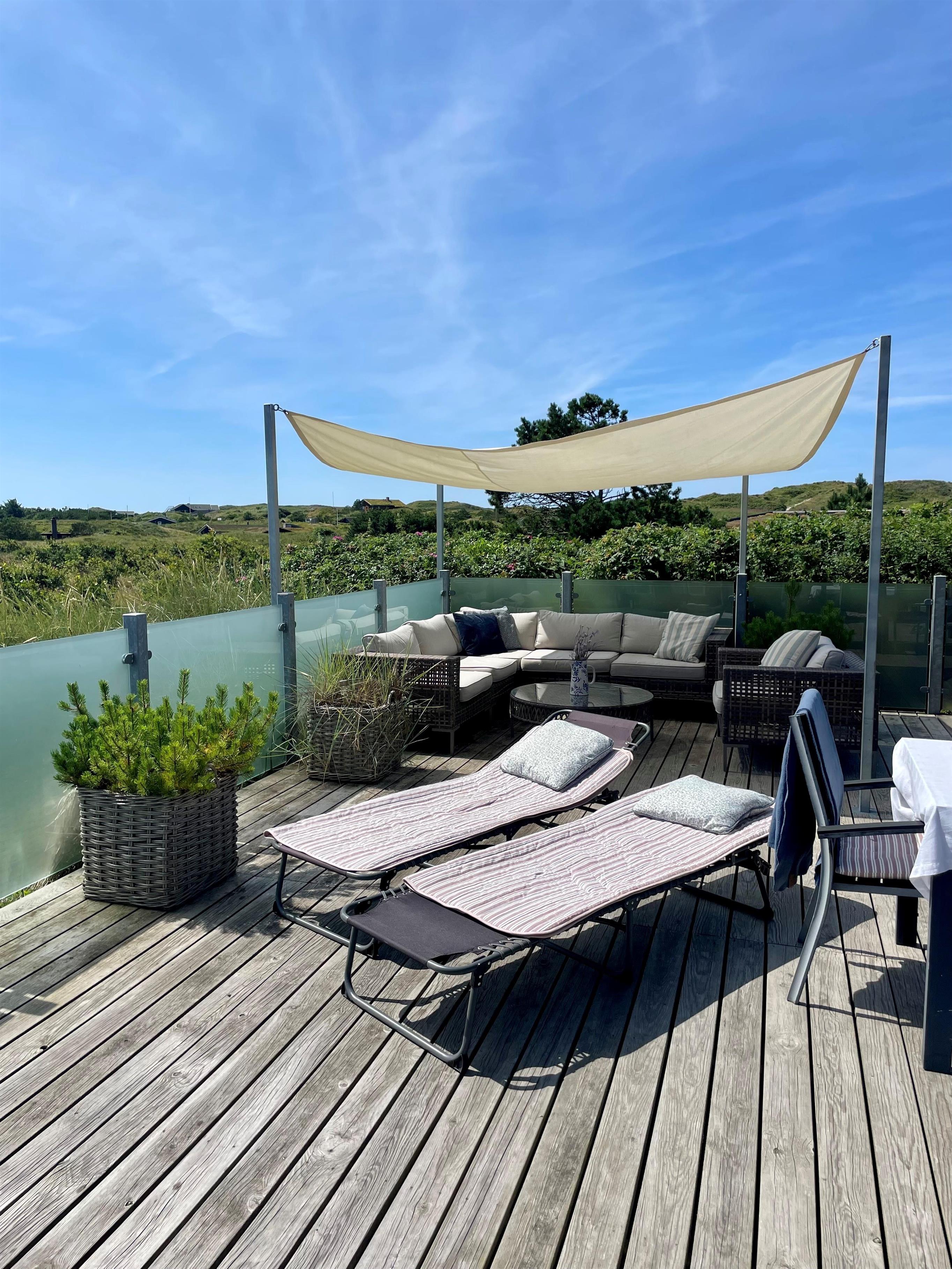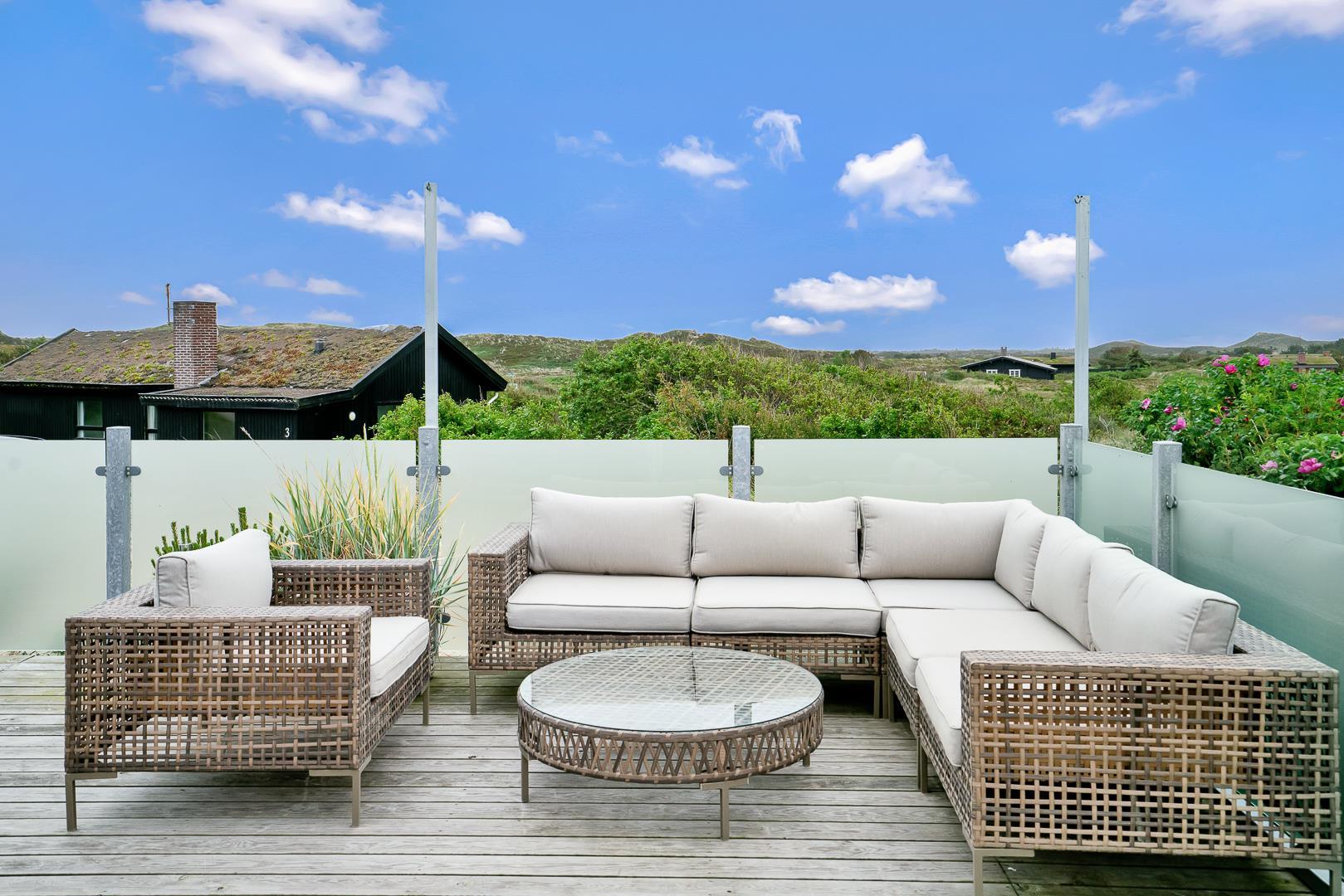 Udendørs venter en stor, læfuld træterrasse, hvor I kan nyde solen hele dagen og lade blikket vandre ud over det smukke landskab. Her er masser af plads til både grillhygge, afslapning og udeliv.