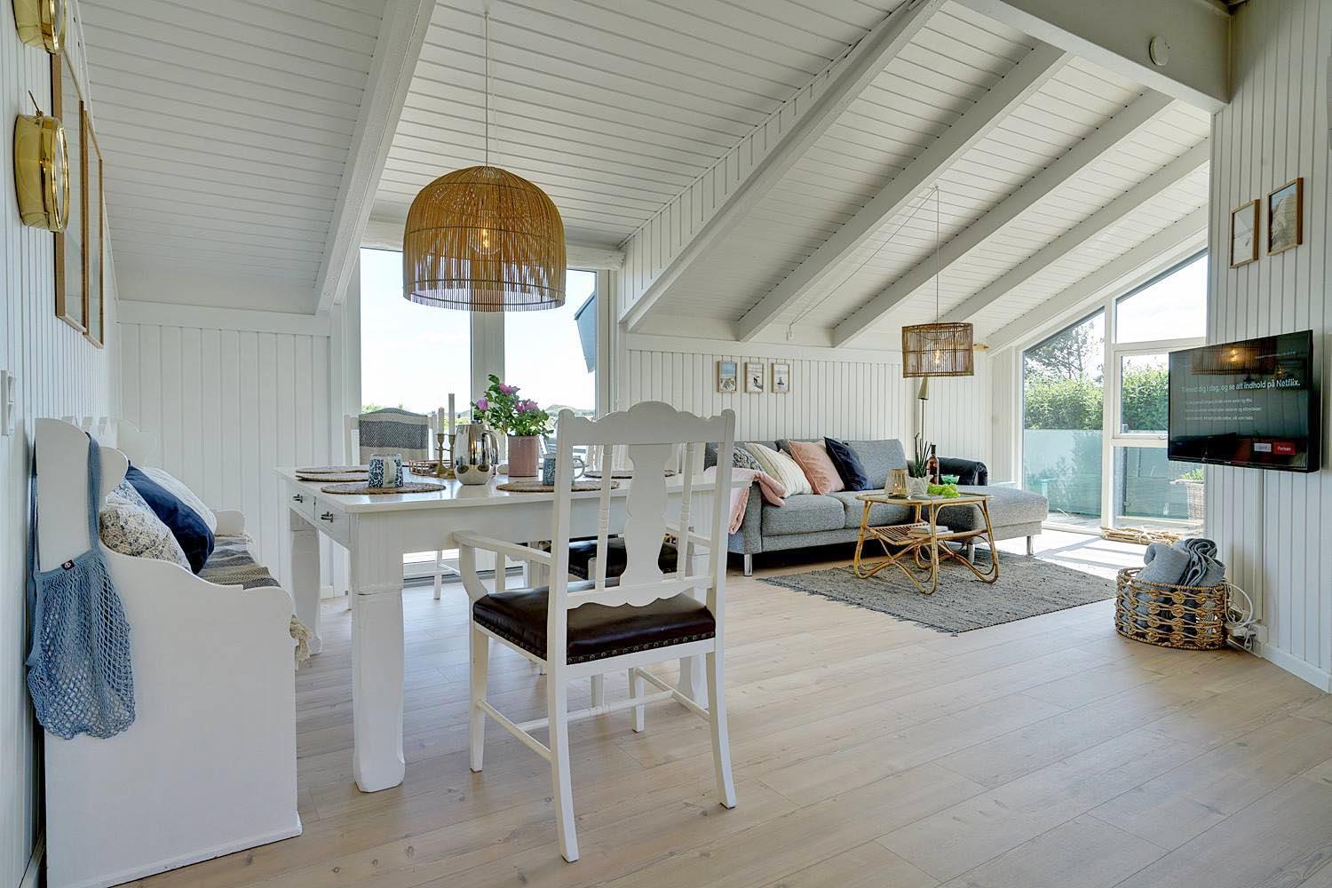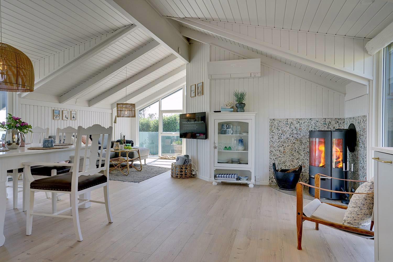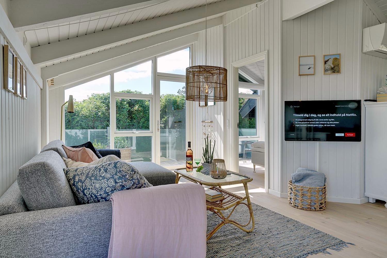 Indretningen er stilfuld med sans for detaljer, og samtidig præget af en varm og personlig atmosfære, hvor I straks føler jer hjemme. De store vinduer og lyse rum skaber en skøn ramme om afslapning og hyggelige timer, både sommer og vinter.