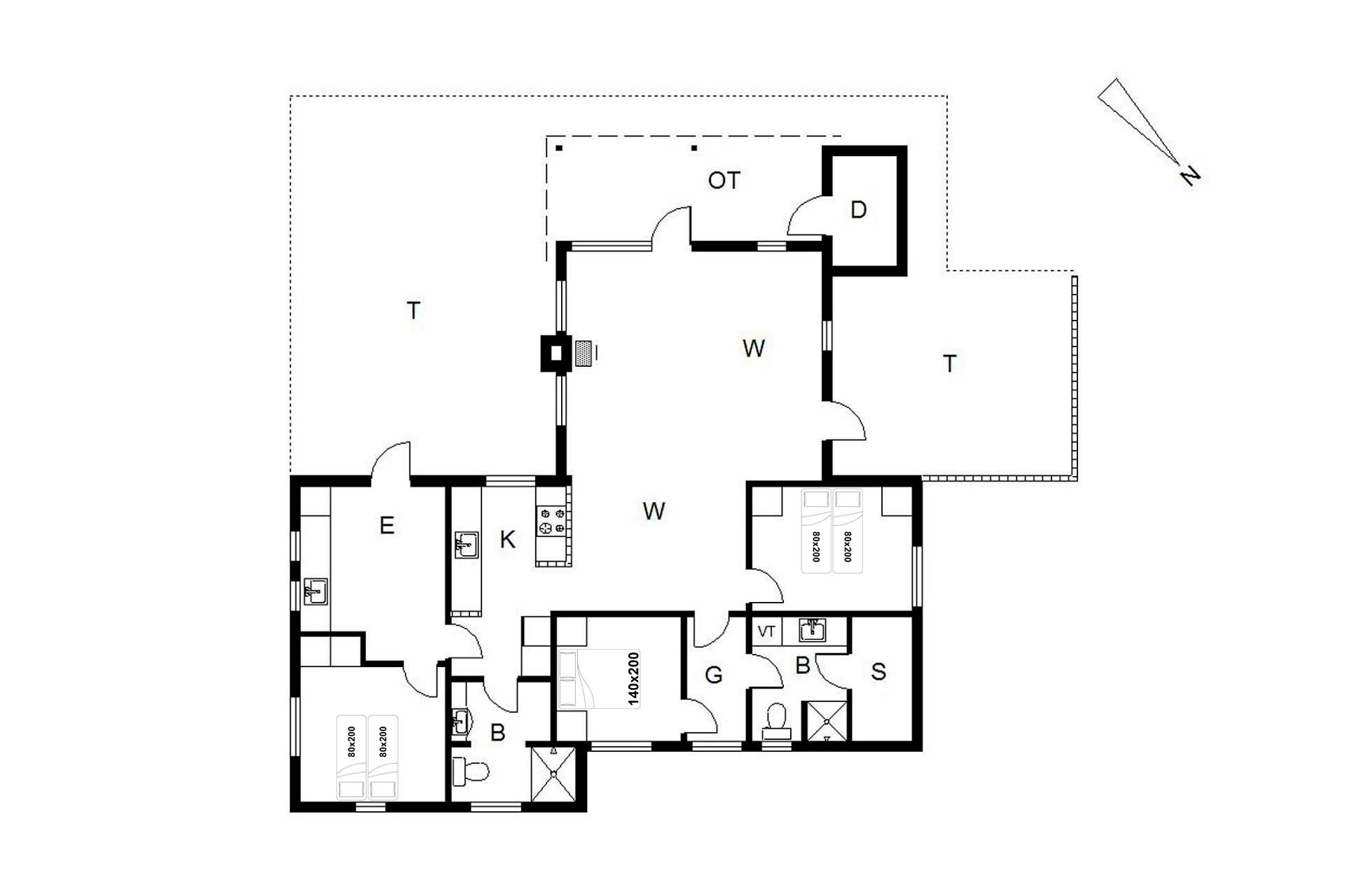 Sengestørrelse: 2 dobbeltsenge med 2 madrasser 80 x 200 cm + 1 dobbeltseng 140 x 200 cm.