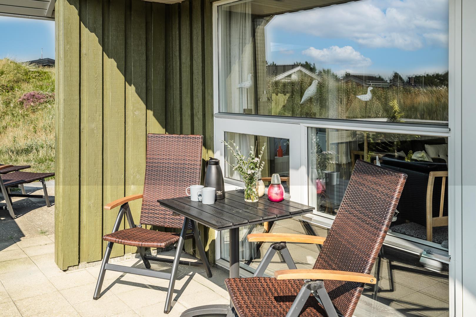 Lyst og velholdt feriehus med sauna og lukket terrasse i rolige Henne Strand omgivelser.