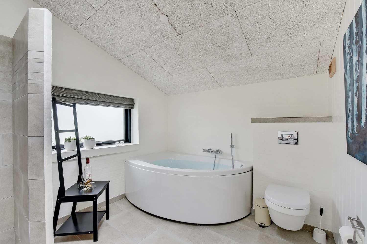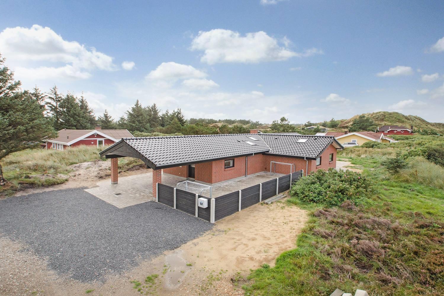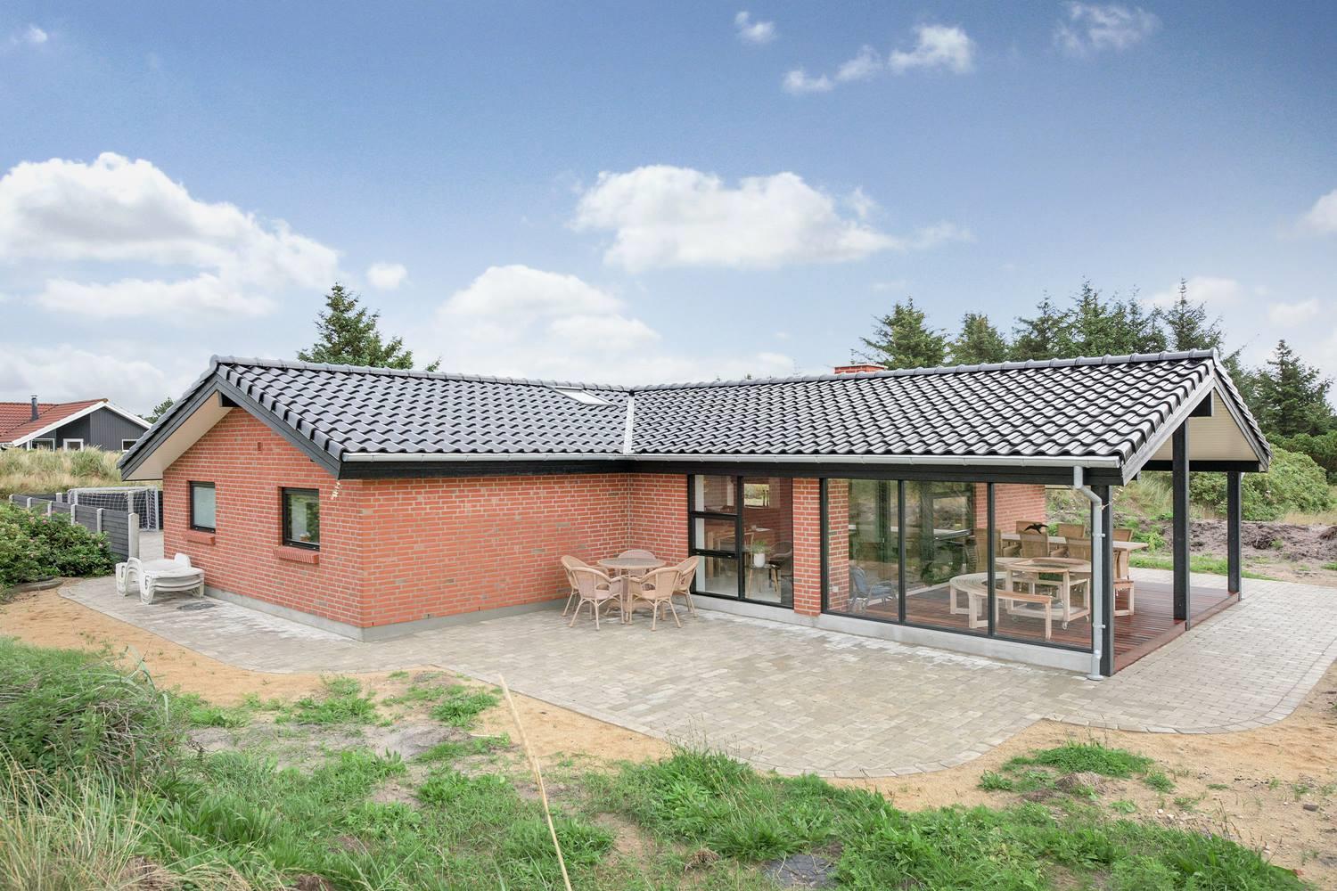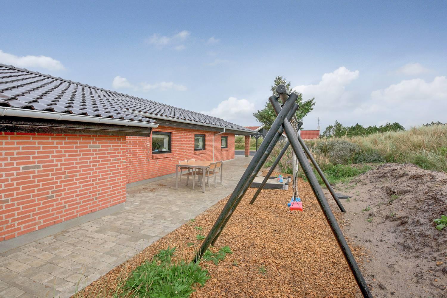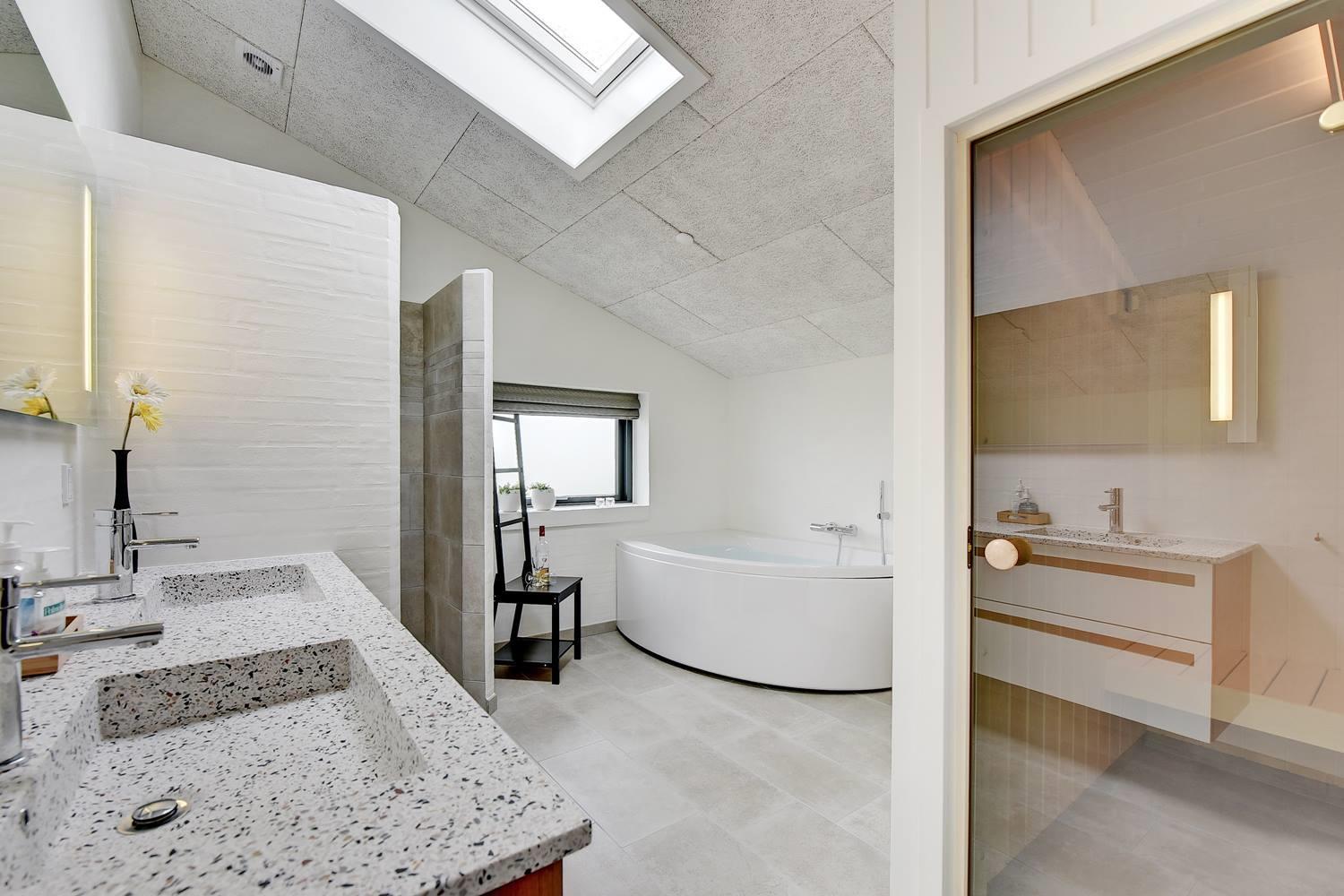 Feriehuset har 2 flotte badeværelser med bruser og gulvvarme, det ene råder over sauna og badekar. Fra stuen er der udgang til stor overdækket træterrasse, samt fliseterrasse der fordeler sig på 3 sider på huset således man kan nyde solen hele dagen. 4 gode soverum. samt alkove hvor børnene kan hygge sig. Stor entre med vaskemaskine og tørretumbler. Til børnene er der 2 fodboldmål på den ene terrasse, samt gynge og sandkasse. Fremhæves skal også den pragtfulde overdækkede terrasse med terrassevarmere som er med til at forlænge terrassesæsonen og gøre grillaftenen længere. Et "super-hus hvor rammerne er til stede for en rigtig god ferie - hele året. Parkering med autocamper på grunden ikke tilladt. Huset er udstyret med kvalitets Continental senge.