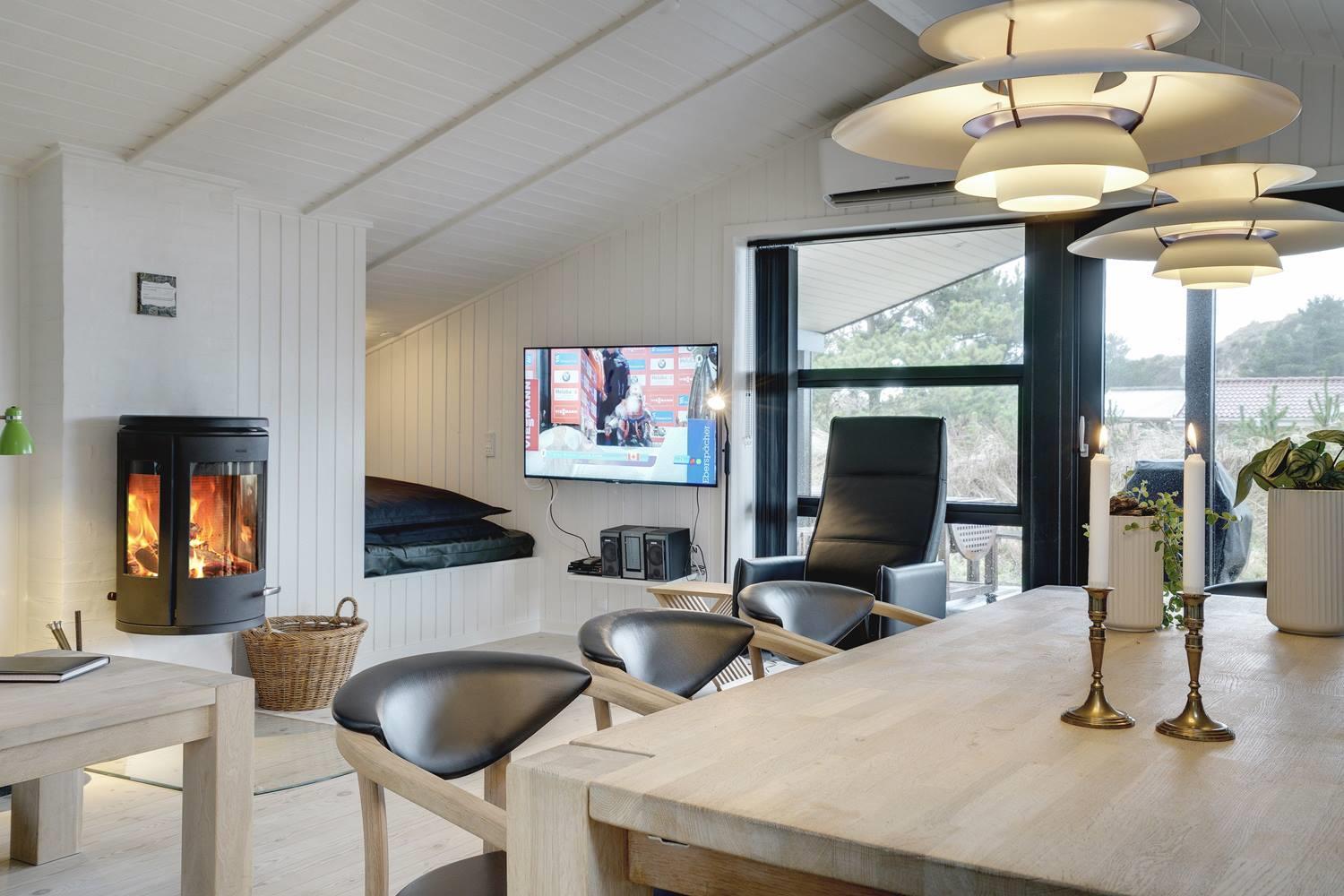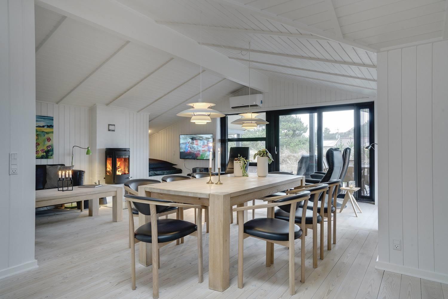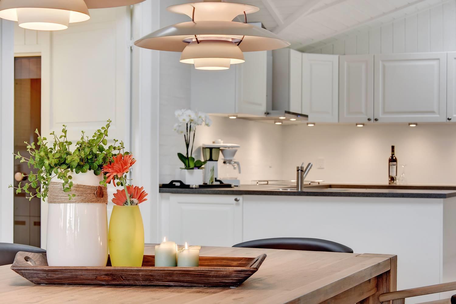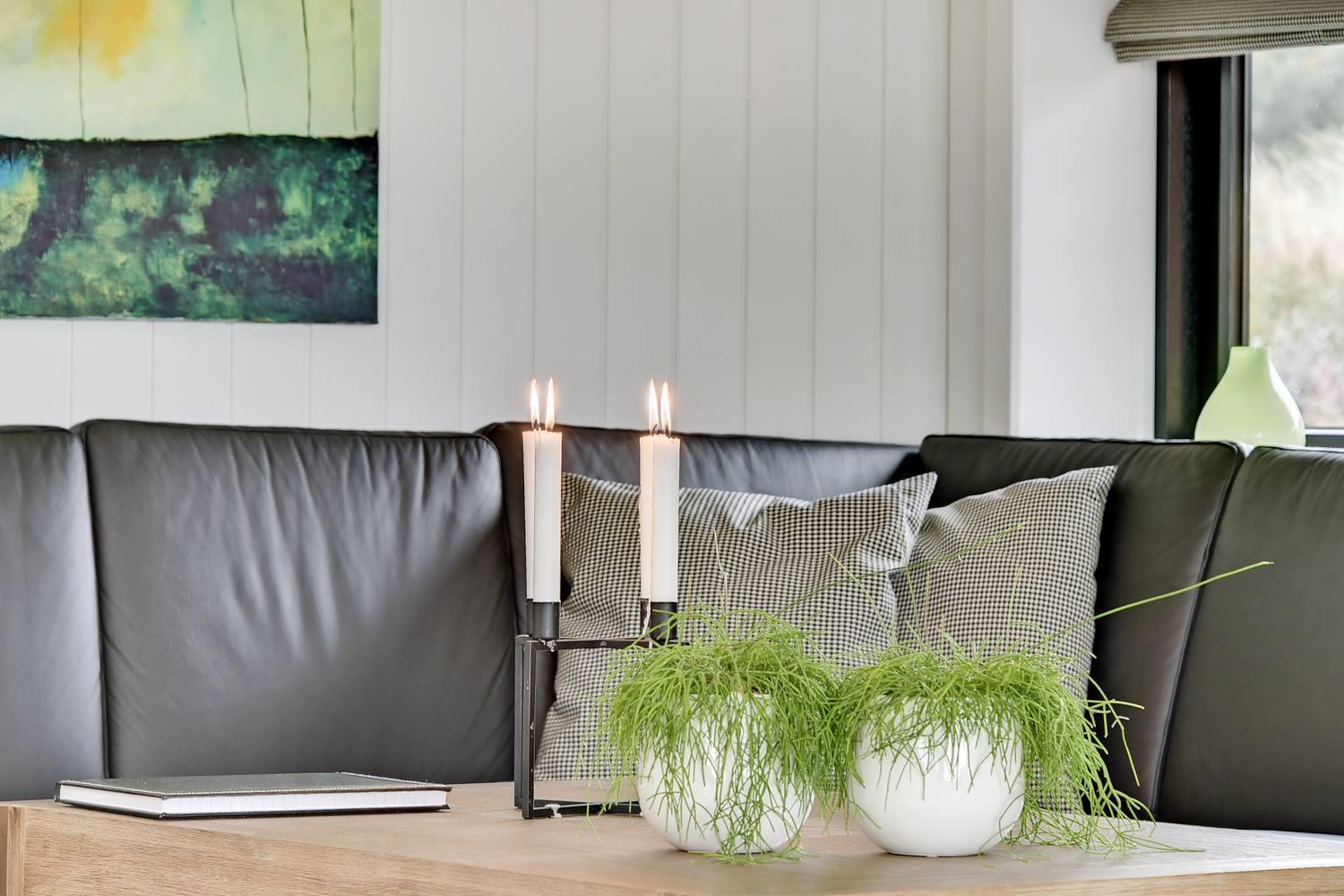 På dejlig naturgrund finder I dette stilfulde indrettede kvalitetsferiehus med carport. Flot og smagfuld møbleret stue i åben forbindelse med lækkert og veludstyret køkken.