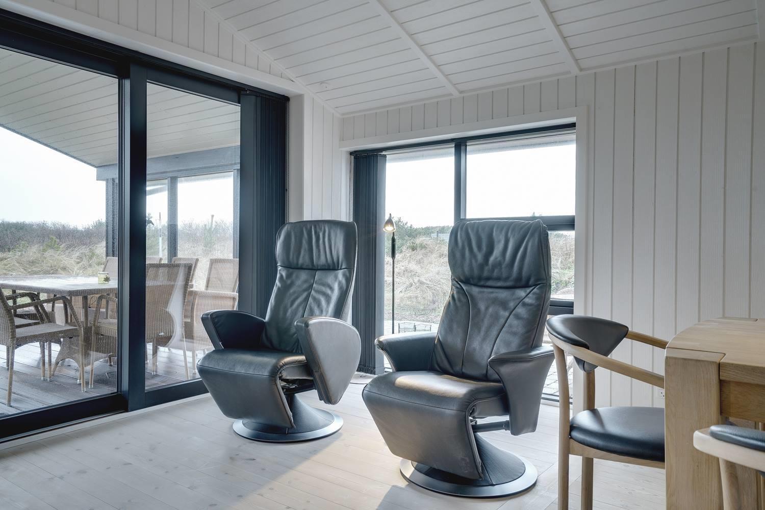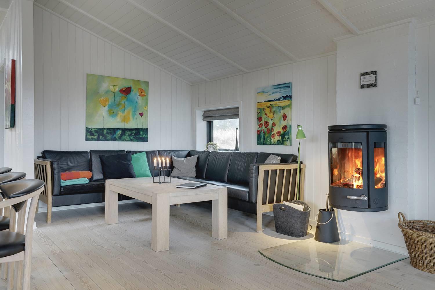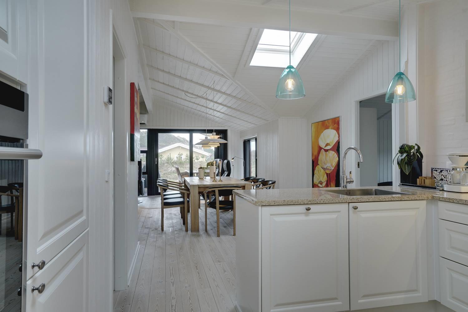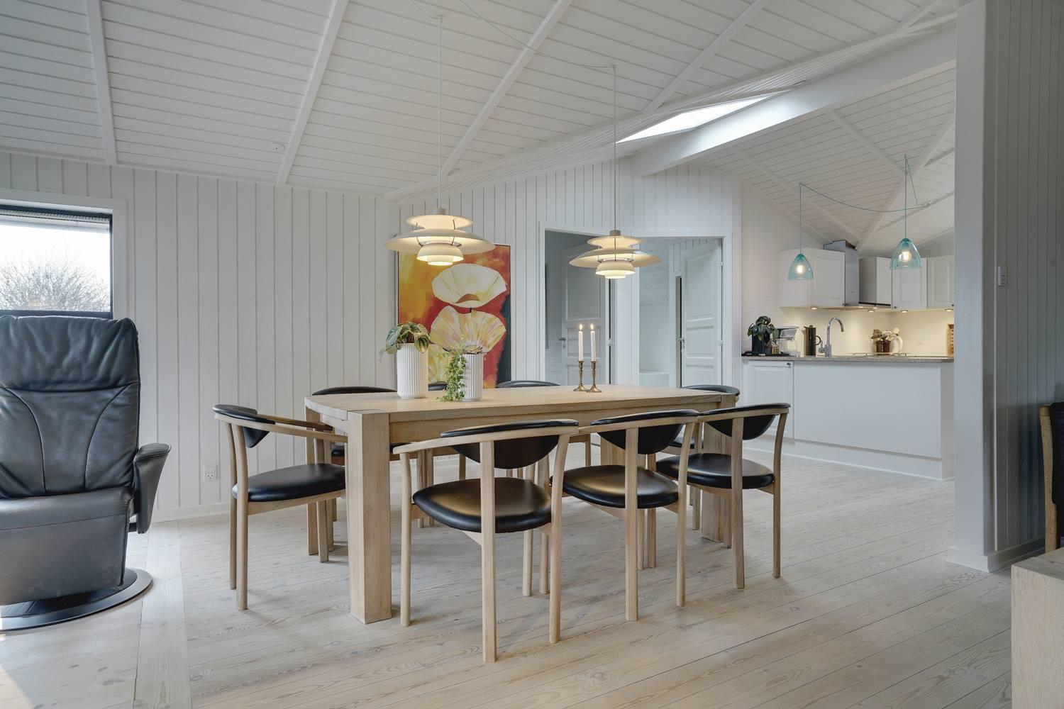 På dejlig naturgrund finder I dette stilfulde indrettede kvalitetsferiehus med carport. Flot og smagfuld møbleret stue i åben forbindelse med lækkert og veludstyret køkken.