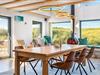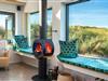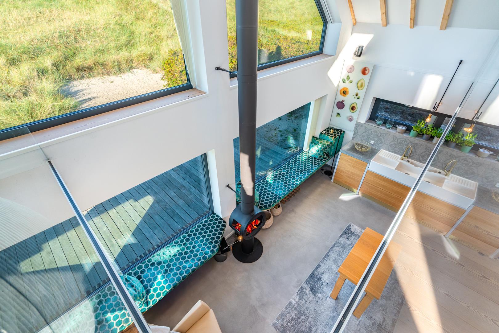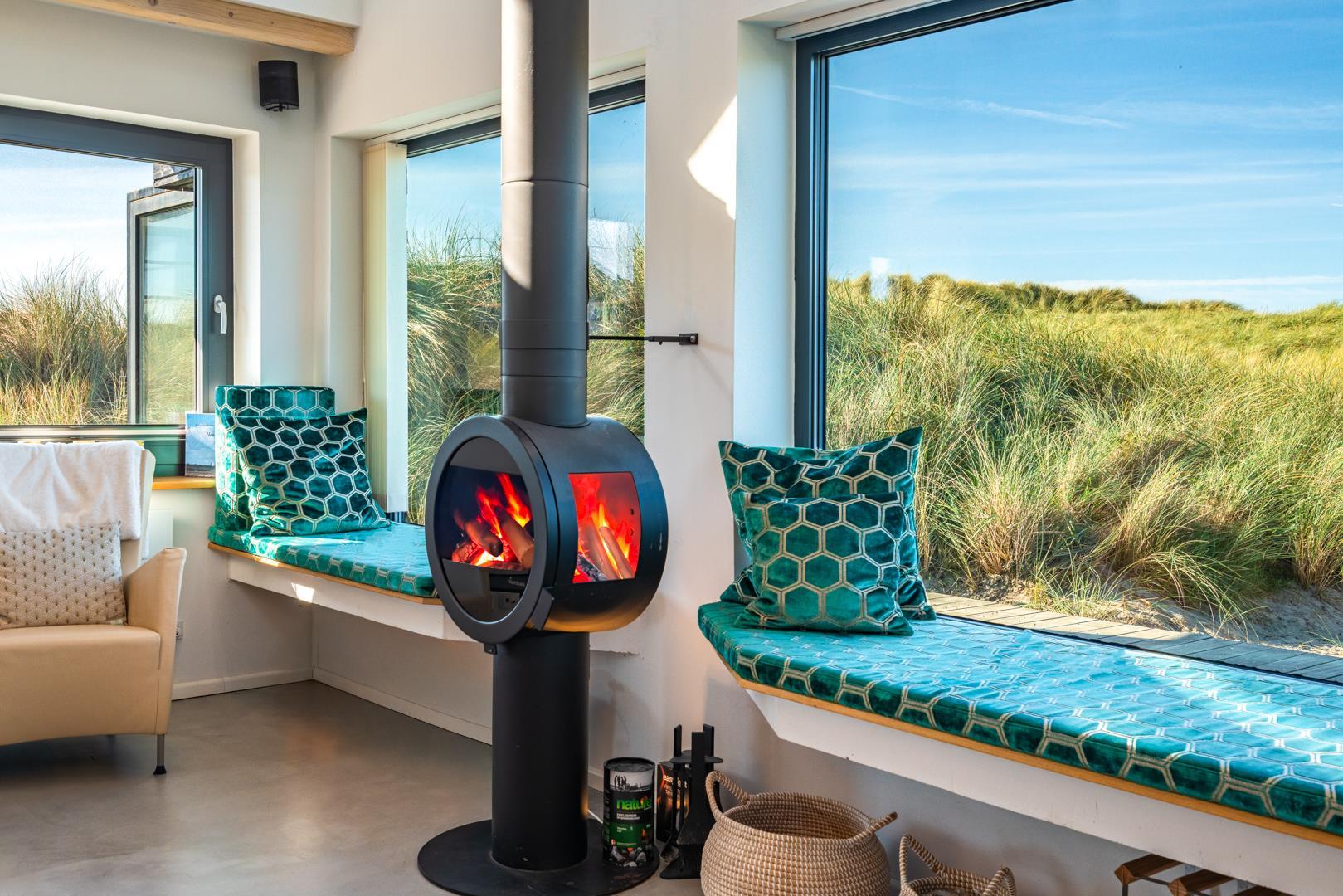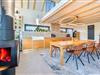Det fuldt udstyrede køkken danner sammen med det store spisebord og det store rum hjertet i huset. Tykke hynder i vindueskarmen inviterer dig til at slappe af. Den stilfulde pejs fremkalder en hyggelig atmosfære og komplementerer de energibesparende infrarøde varmeapparater på kolde dage.