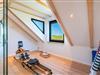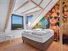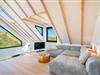 Huset har nu en anden etage, som byder på en fantastisk udsigt over det brede klitlandskab og aftenhimlen. Her finder du et andet soveværelse med en box madrasser, et lille yogarum, et lækkert badeværelse med finsk sauna med udsigt over havet og en infrarød sauna. Loungeområdet ovenpå med sofa og liggestol gør den afslappende ferie perfekt.