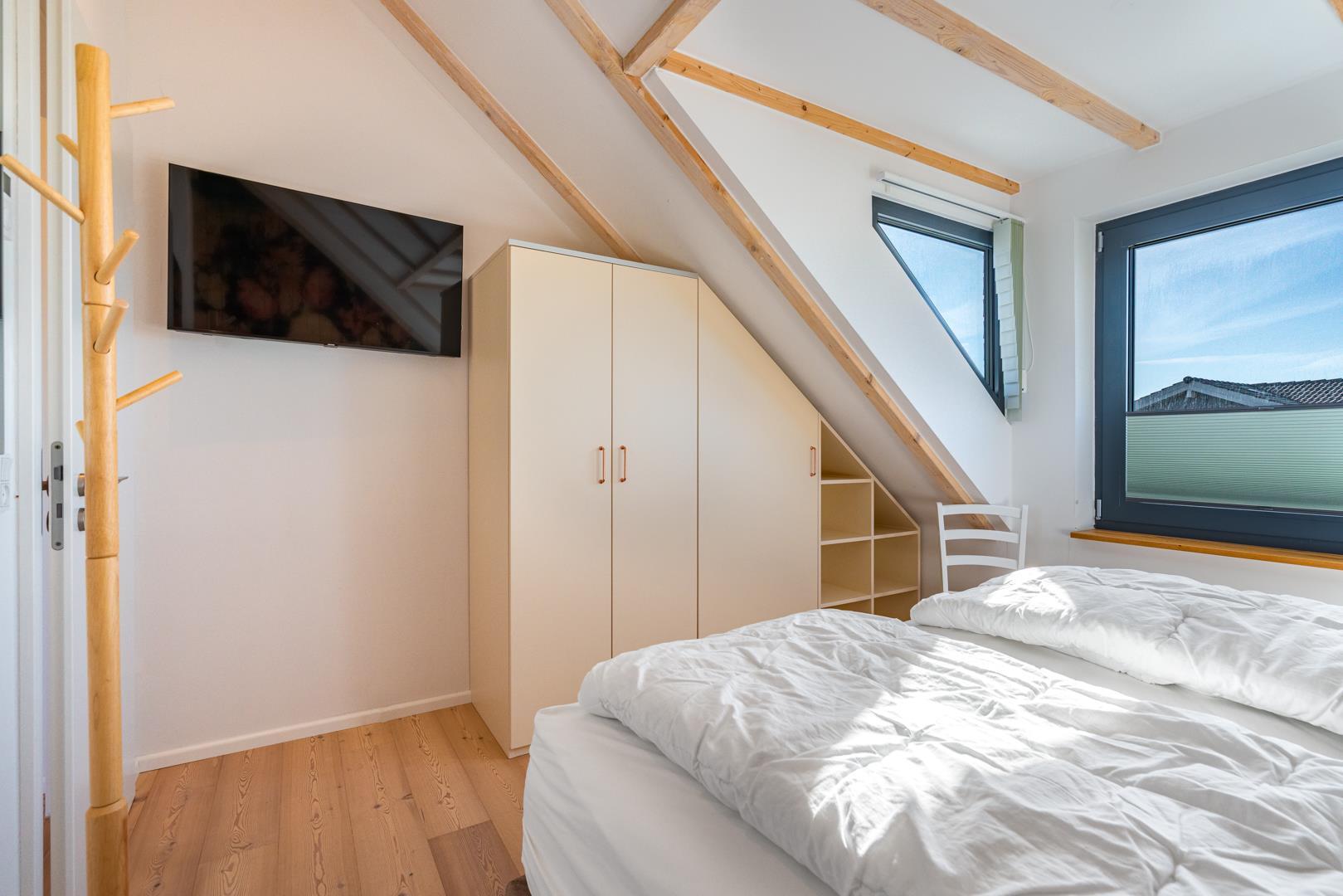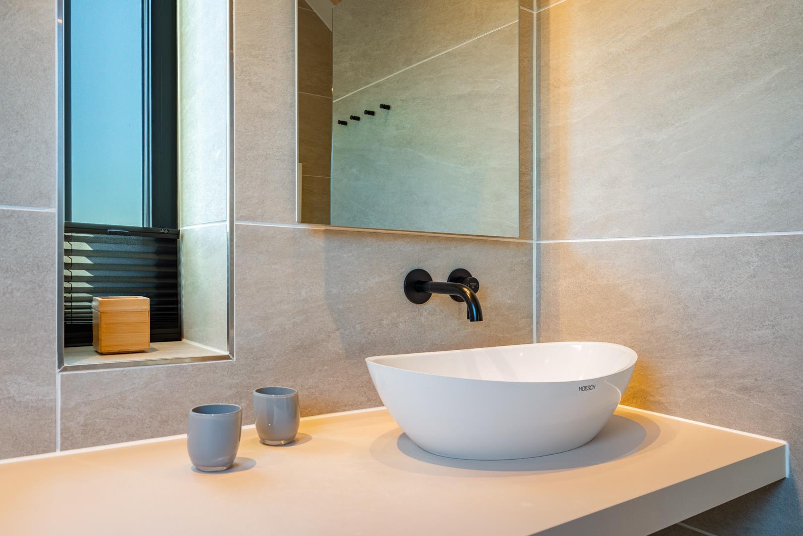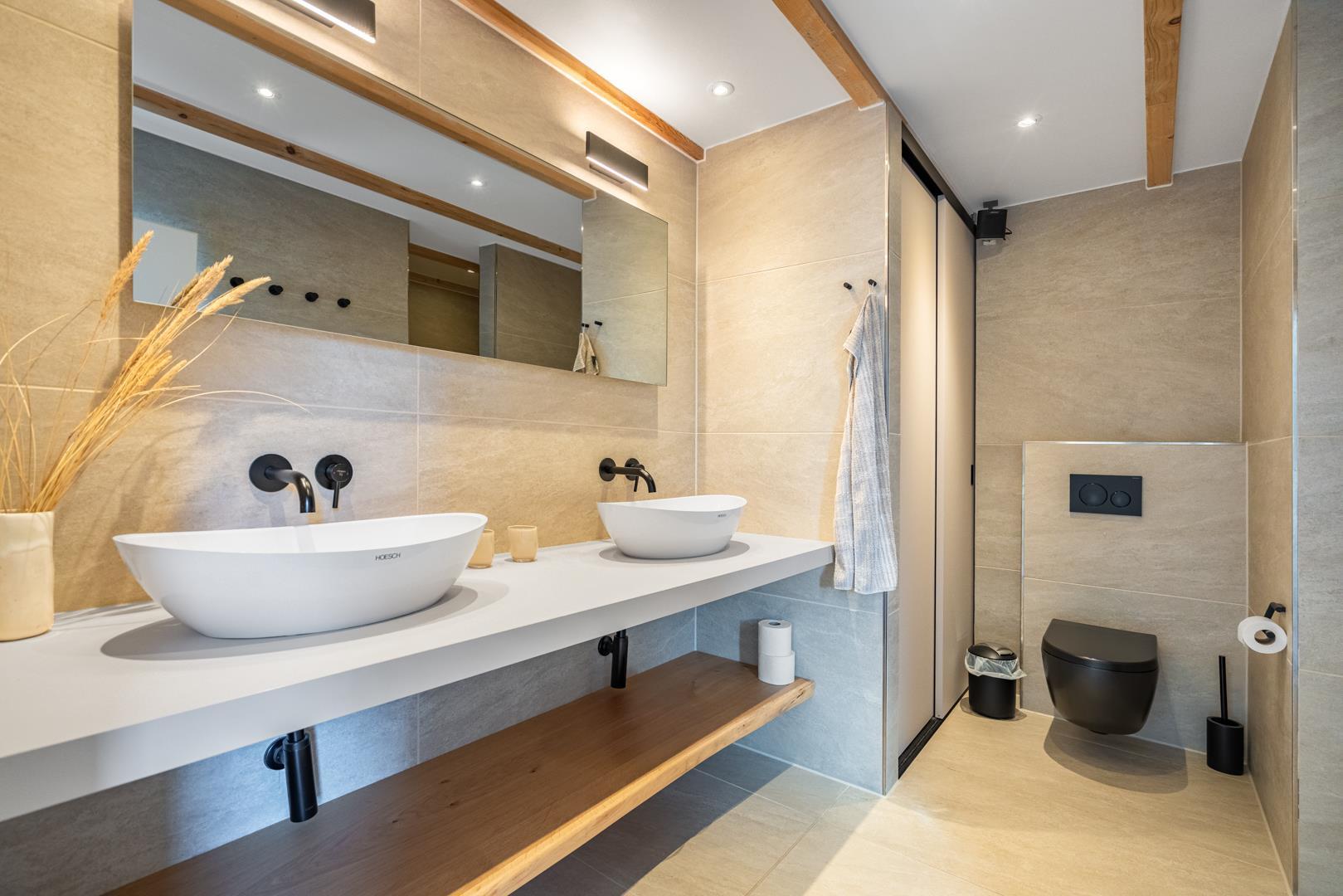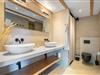 I stueetagen er der 2 soveværelser med komfortable box madrasser og et moderne badeværelse med 2 håndvaske og bruser.