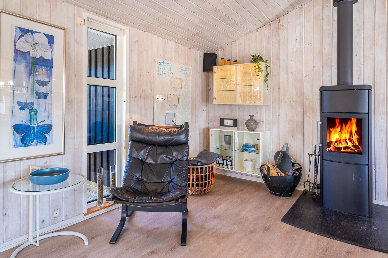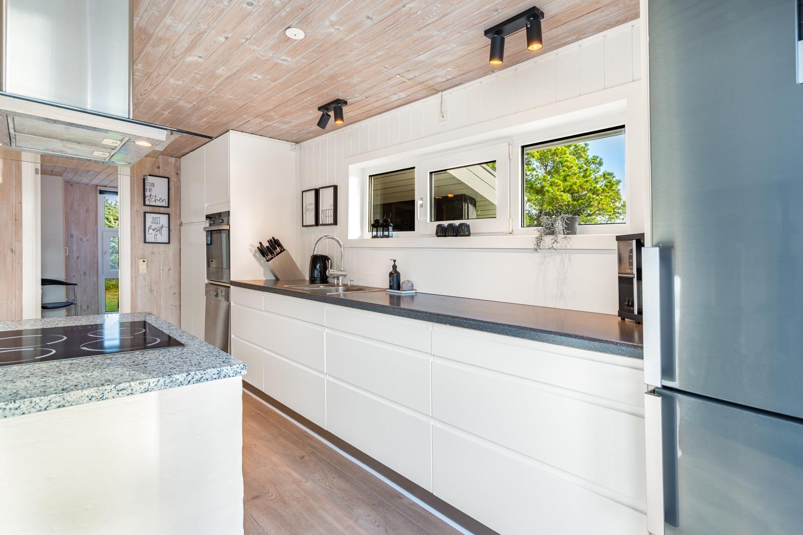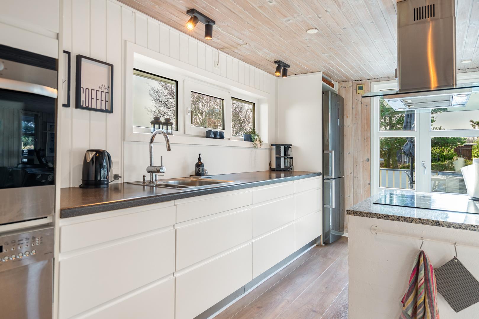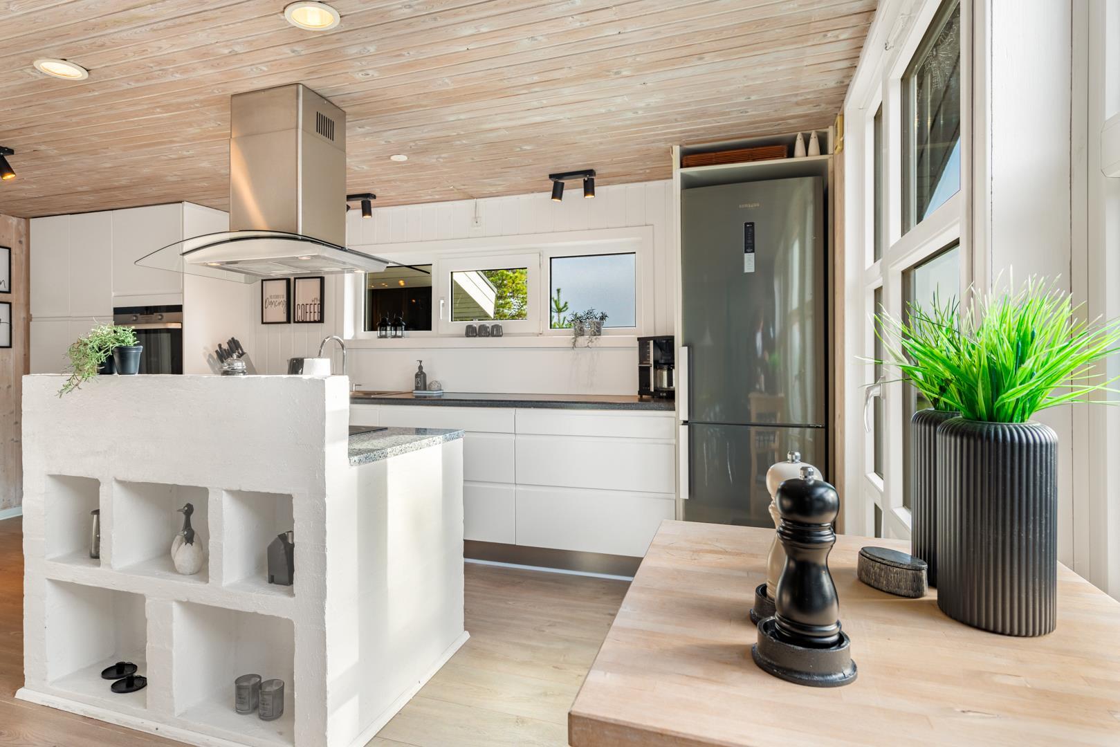 Det lækre åbne køkken, smelter sammen med stuen og danner hjertet af dette sommerhus, hvor madlavning og familieliv forenes i harmoni. Med loft til kip og store vinduespartier badet i naturligt lys, vil du opleve en følelse af rummelighed og velvære, mens du nyder udsigten til den frodige natur omkring dig. I stuen finder du også en brændeovn, der skaber hygge og varme på kølige aftener, og midt i rummet venter en stor spiseplads, hvor hele familien kan samles til gode måltider og hyggeligt samvær.