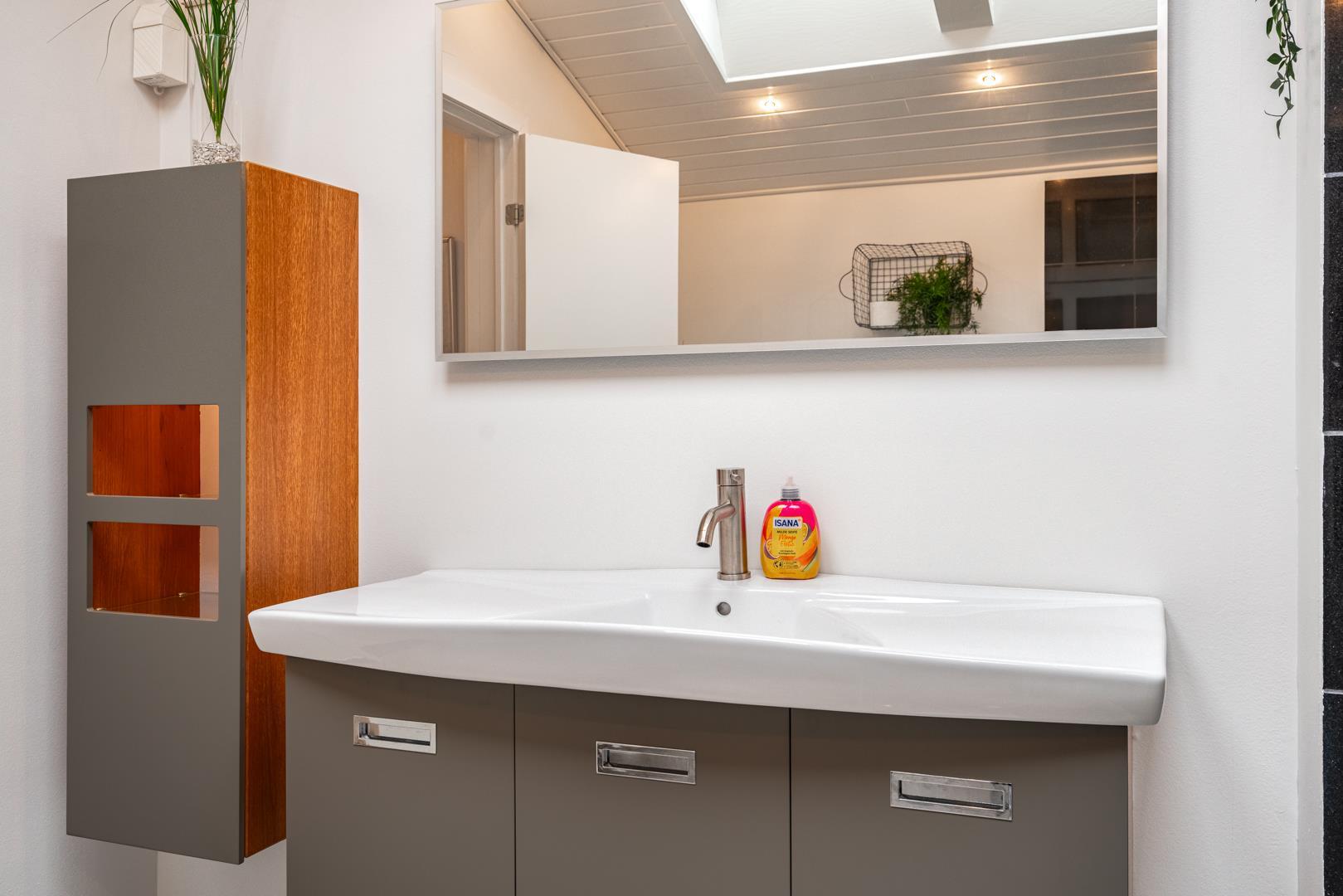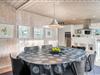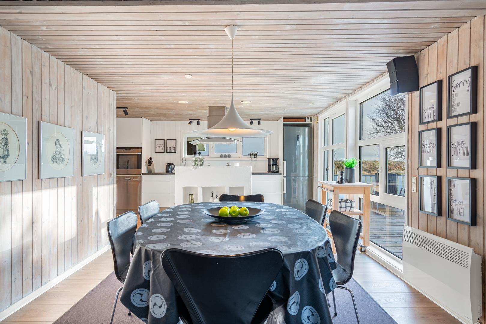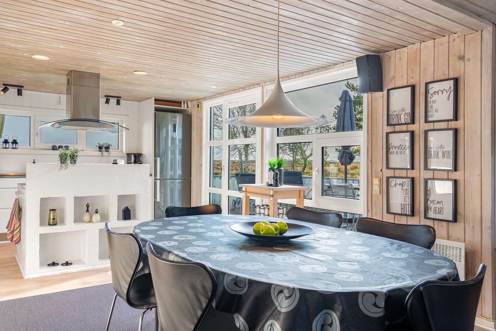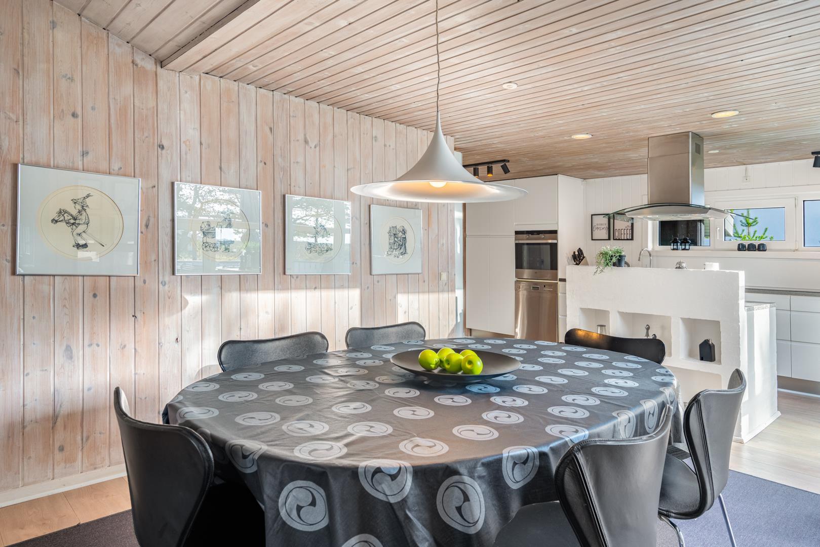 Det lækre åbne køkken, smelter sammen med stuen og danner hjertet af dette sommerhus, hvor madlavning og familieliv forenes i harmoni. Med loft til kip og store vinduespartier badet i naturligt lys, vil du opleve en følelse af rummelighed og velvære, mens du nyder udsigten til den frodige natur omkring dig. I stuen finder du også en brændeovn, der skaber hygge og varme på kølige aftener, og midt i rummet venter en stor spiseplads, hvor hele familien kan samles til gode måltider og hyggeligt samvær.