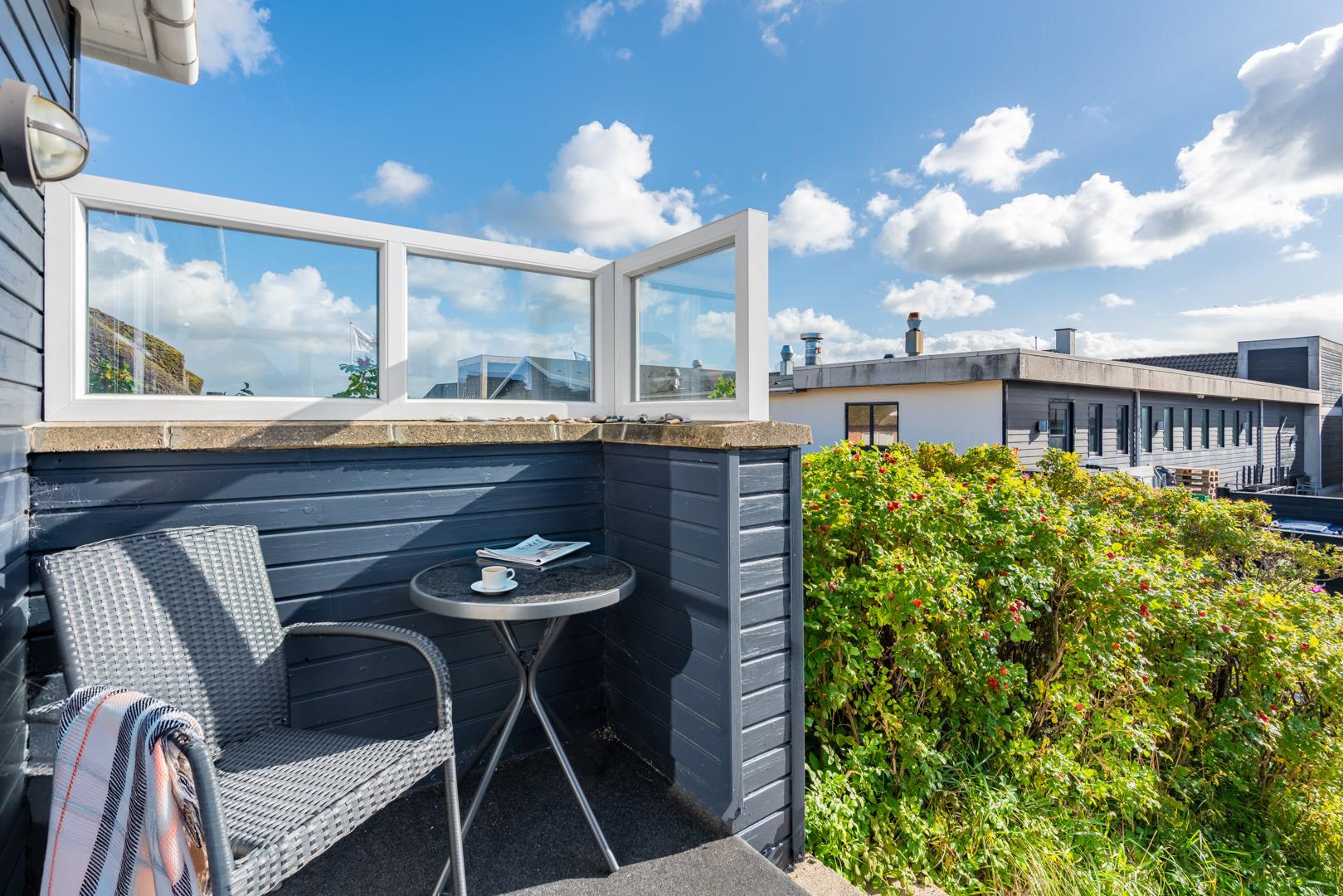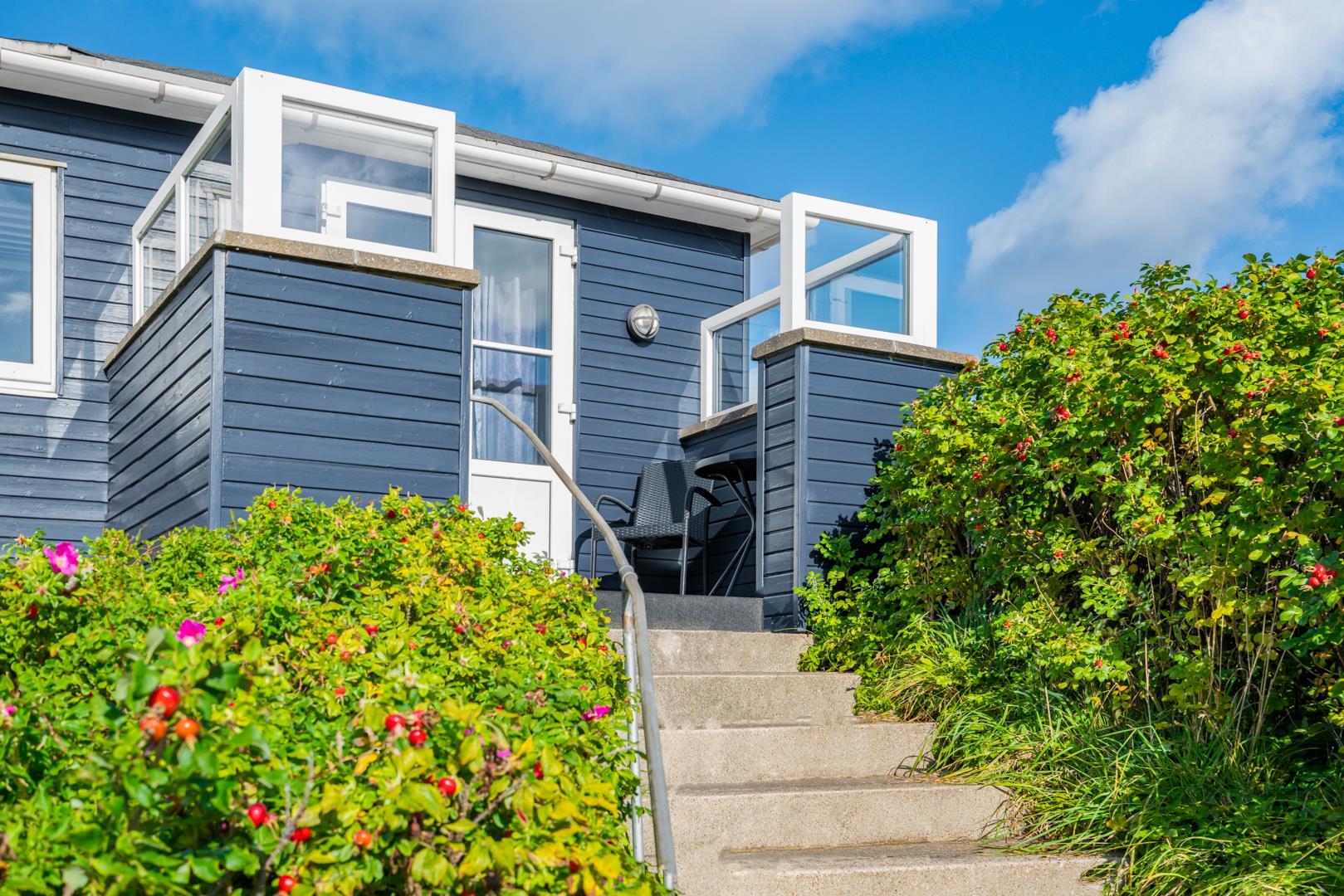 Grunden har en lille græsplæne omkranset af Rosa Rogusa. Der er to hyggelige terrasser, en vestvendt gårdhave og en terrasse mod øst til morgensolen. Her er der Havemøbler og webergrill til fri afbenyttelse.