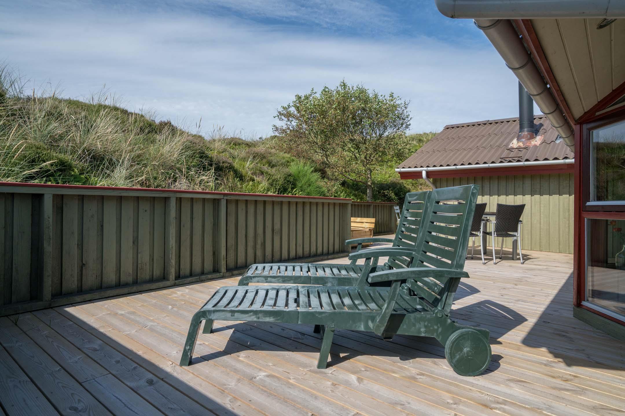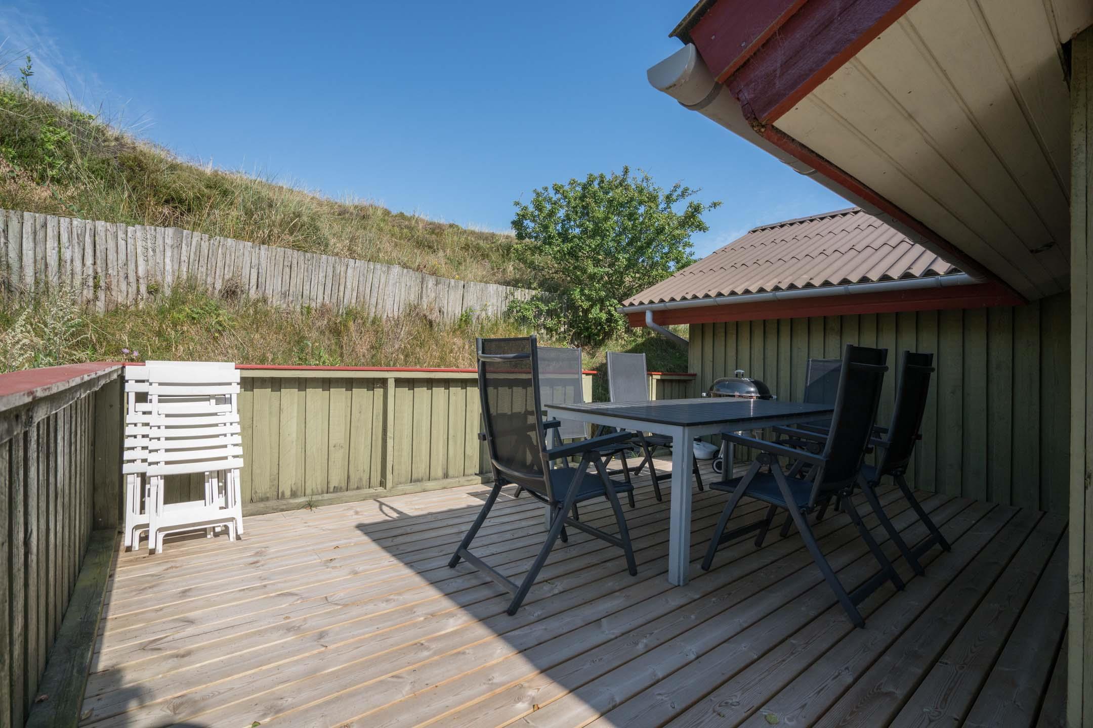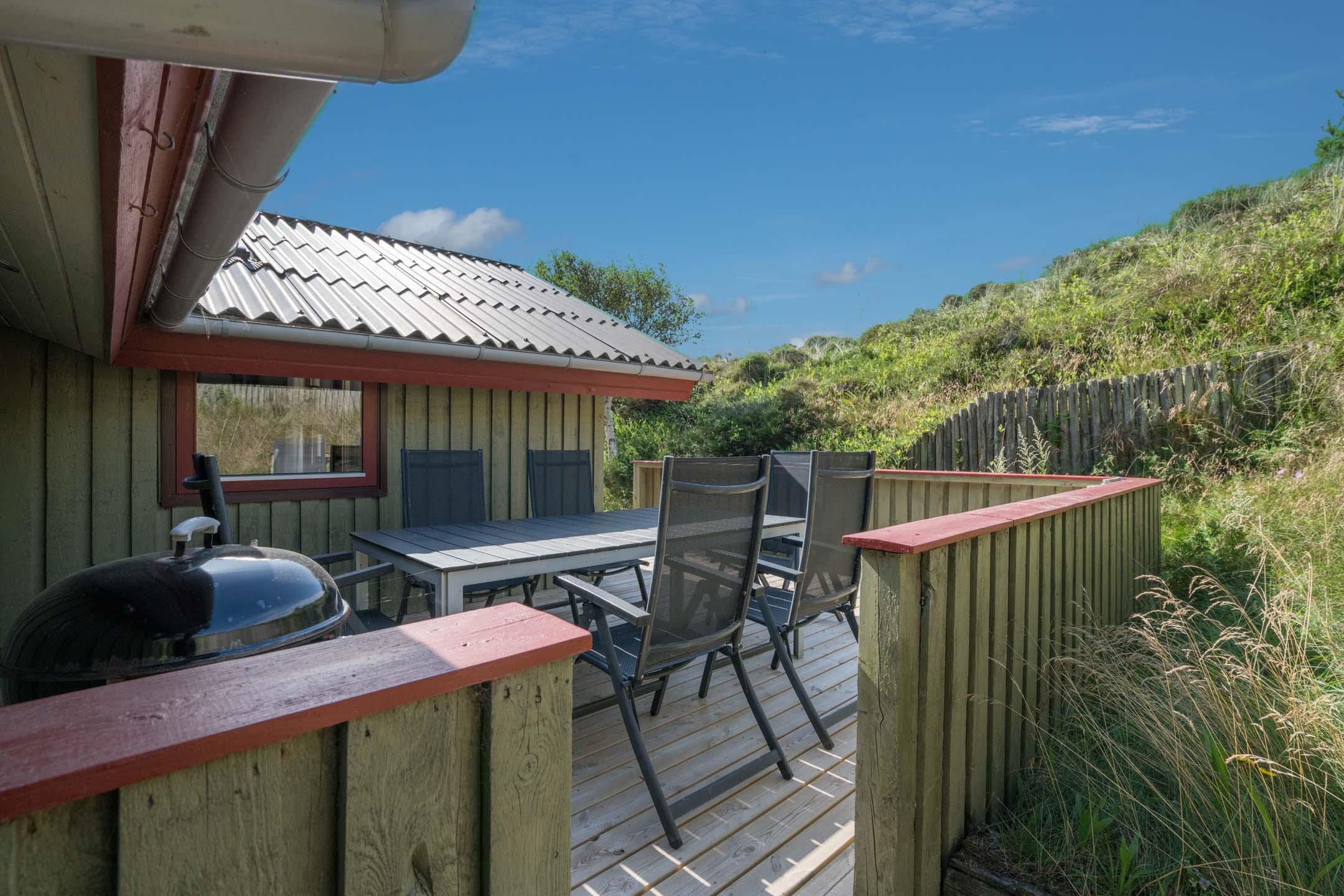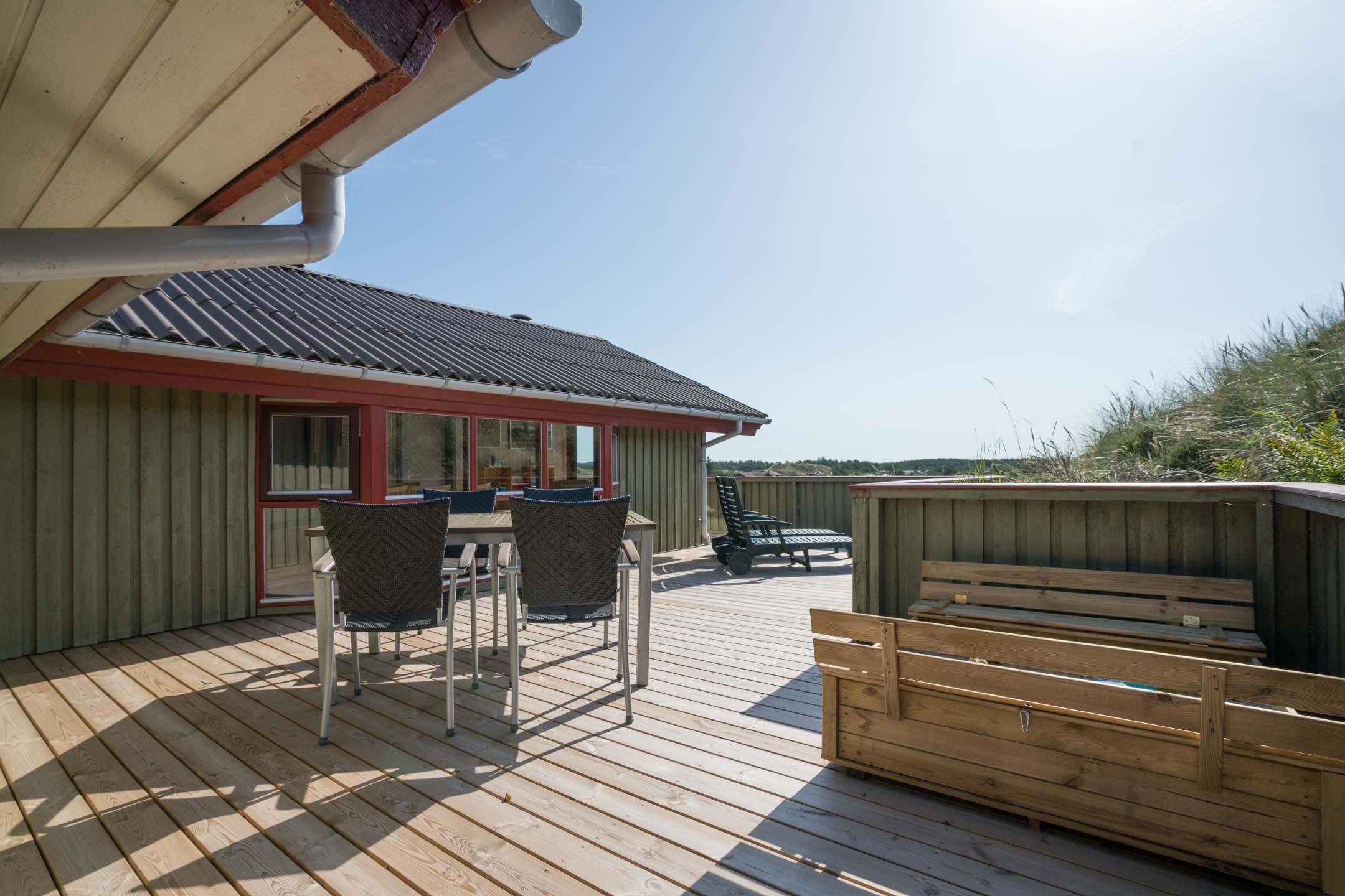 Das Haus ist hochgelegen und hat eine große Holzterrasse, die entlang der Süd- und Westseite des Hauses läuft. Es gibt hier mehrere windgeschützte und ungestörten Ecken und eine fantastische Aussicht über das Ferienhausgebiet und die höchste Düne am Henne Strand den Tuttesbjerg. Das Haus befindet sich auf ein Naturgrundstück mit Düne und Heide in einer Sackgasse des Tyttebærvej und von der Straße etwas zurückgezogen.