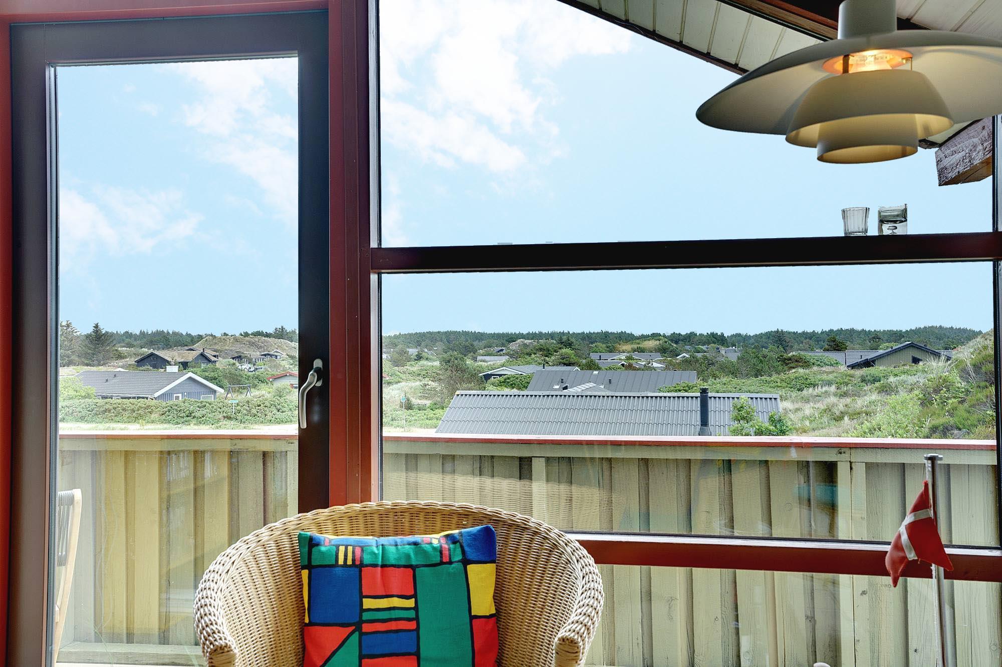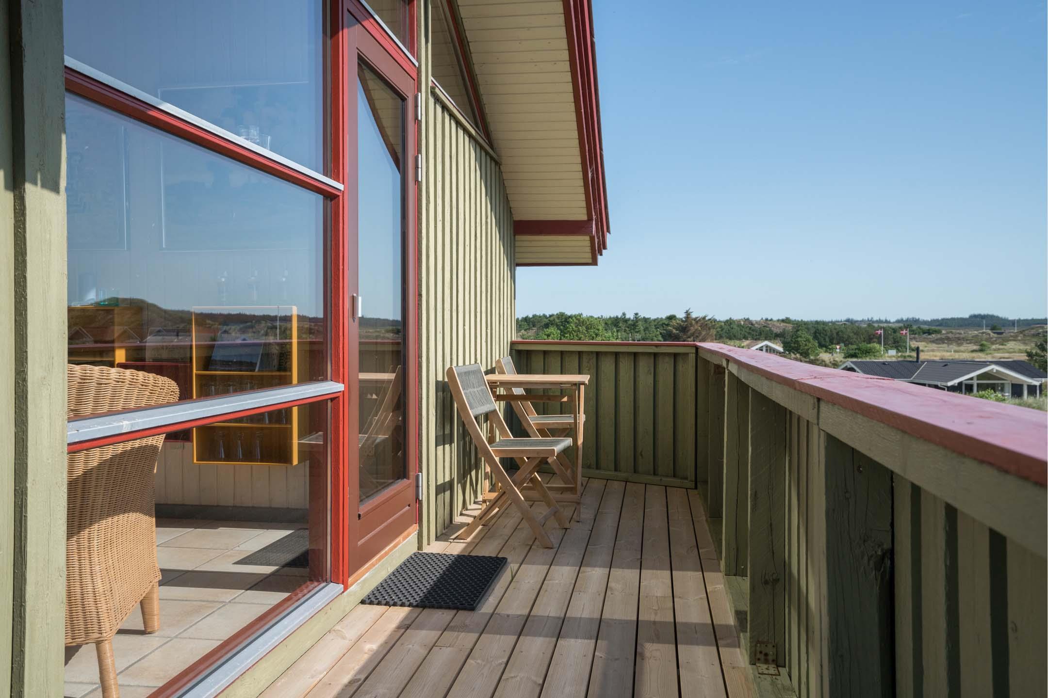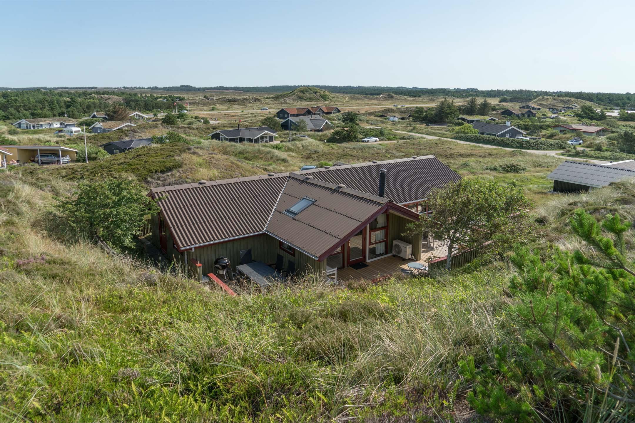 Das Haus ist hochgelegen und hat eine große Holzterrasse, die entlang der Süd- und Westseite des Hauses läuft. Es gibt hier mehrere windgeschützte und ungestörten Ecken und eine fantastische Aussicht über das Ferienhausgebiet und die höchste Düne am Henne Strand den Tuttesbjerg. Das Haus befindet sich auf ein Naturgrundstück mit Düne und Heide in einer Sackgasse des Tyttebærvej und von der Straße etwas zurückgezogen.