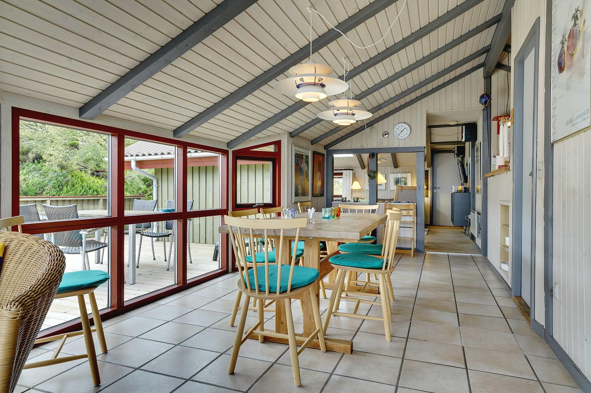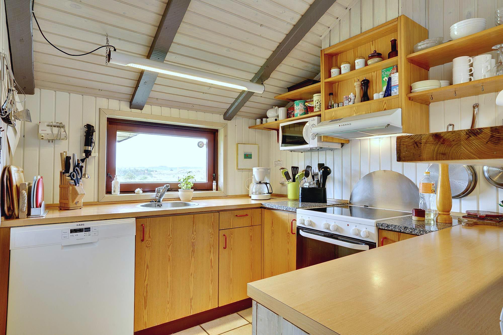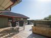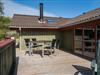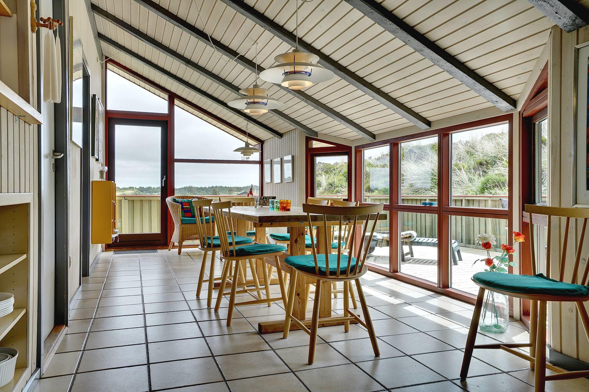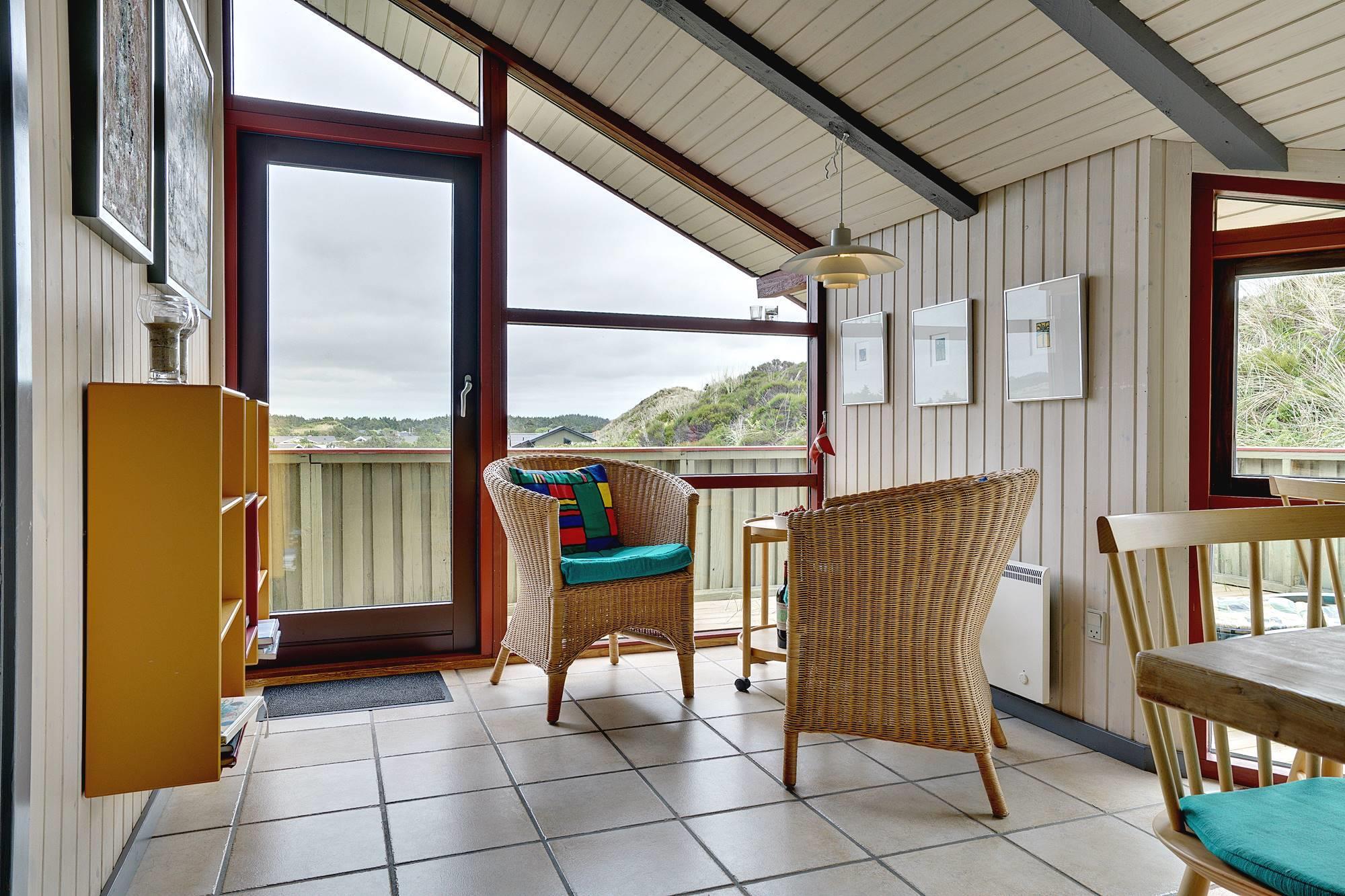Das Haus ist hochgelegen und hat eine große Holzterrasse, die entlang der Süd- und Westseite des Hauses läuft. Es gibt hier mehrere windgeschützte und ungestörten Ecken und eine fantastische Aussicht über das Ferienhausgebiet und die höchste Düne am Henne Strand den Tuttesbjerg. Das Haus befindet sich auf ein Naturgrundstück mit Düne und Heide in einer Sackgasse des Tyttebærvej und von der Straße etwas zurückgezogen.