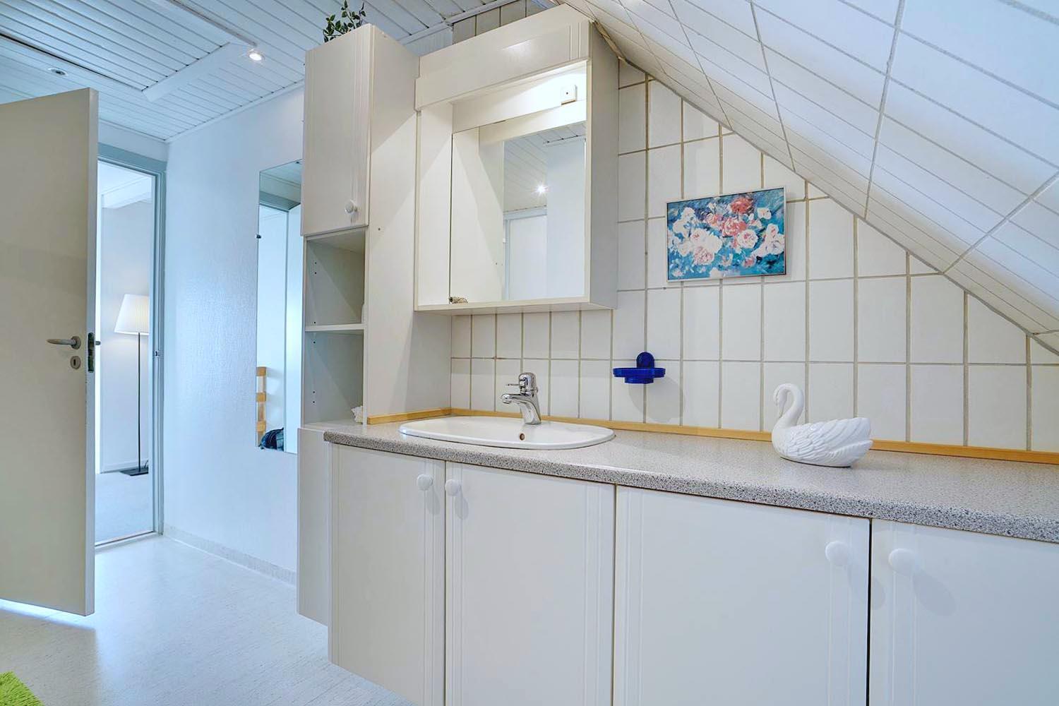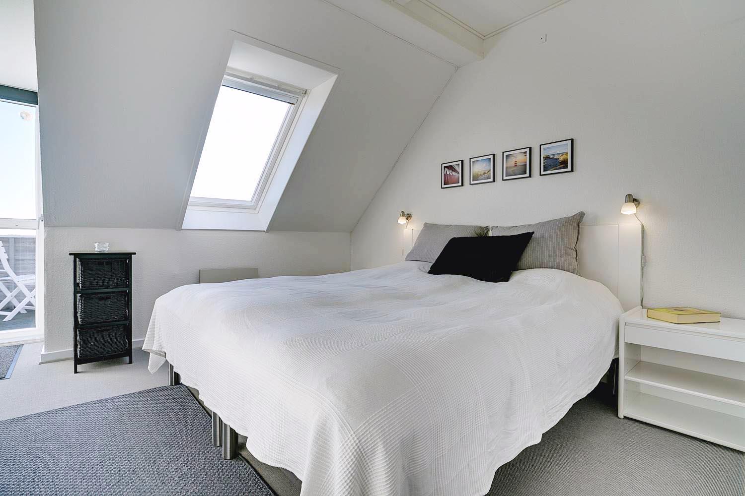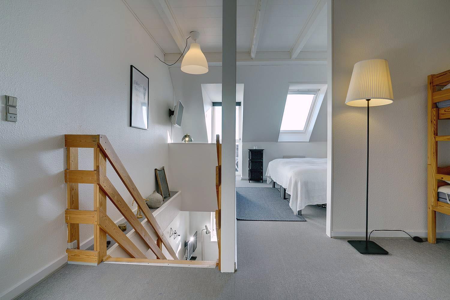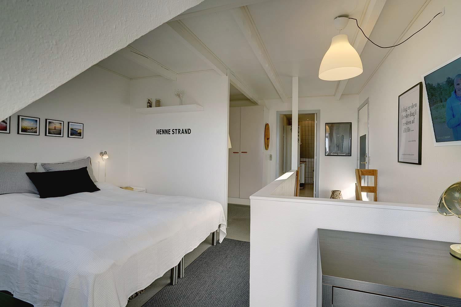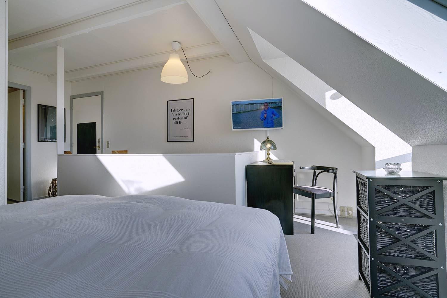 På første sal finder du både soveværelse og børneværelse, som er forbundet i åben planløsning – ideelt for familier med mindre børn. Her findes også lejlighedens badeværelse samt et ekstra TV, så hele familien kan finde ro og underholdning.