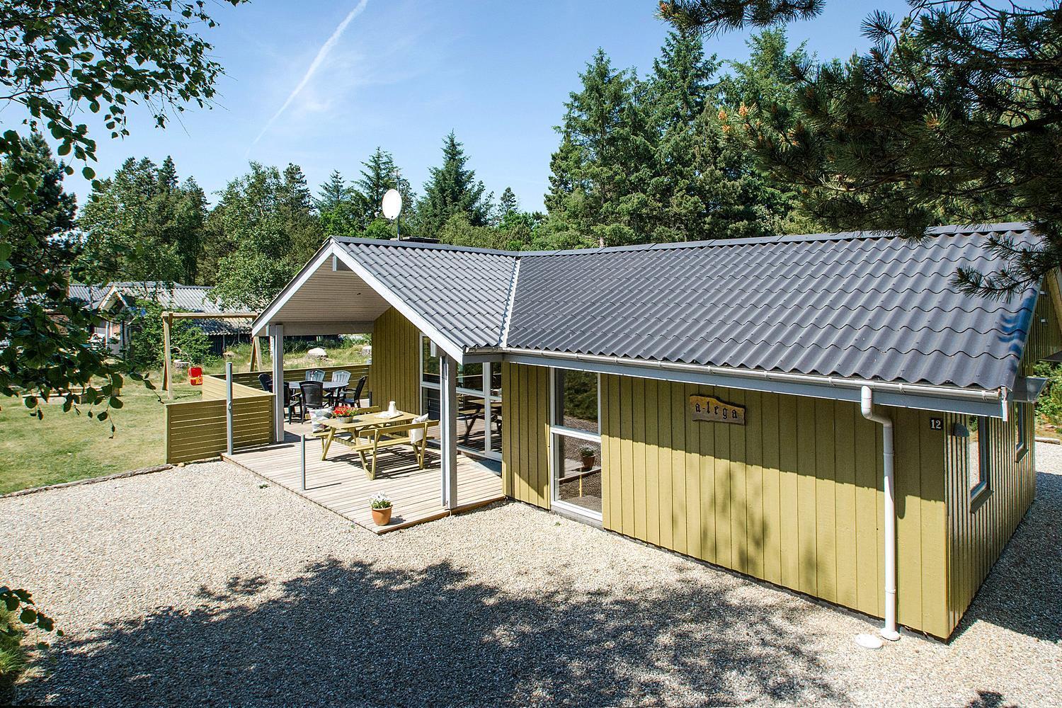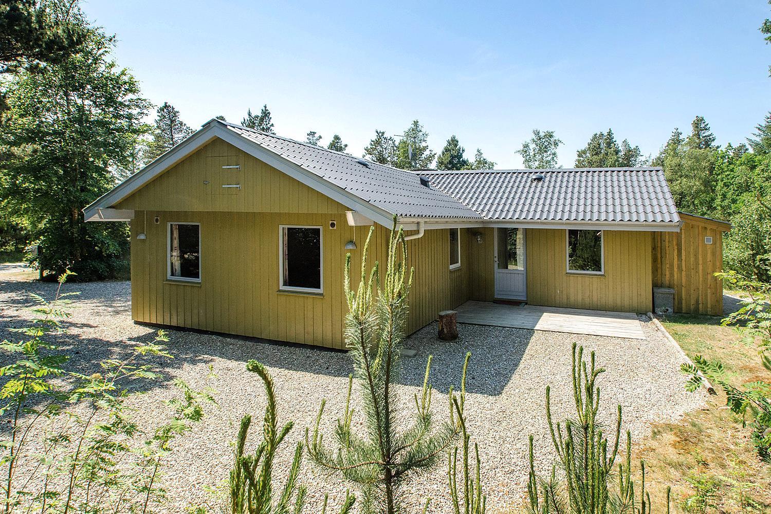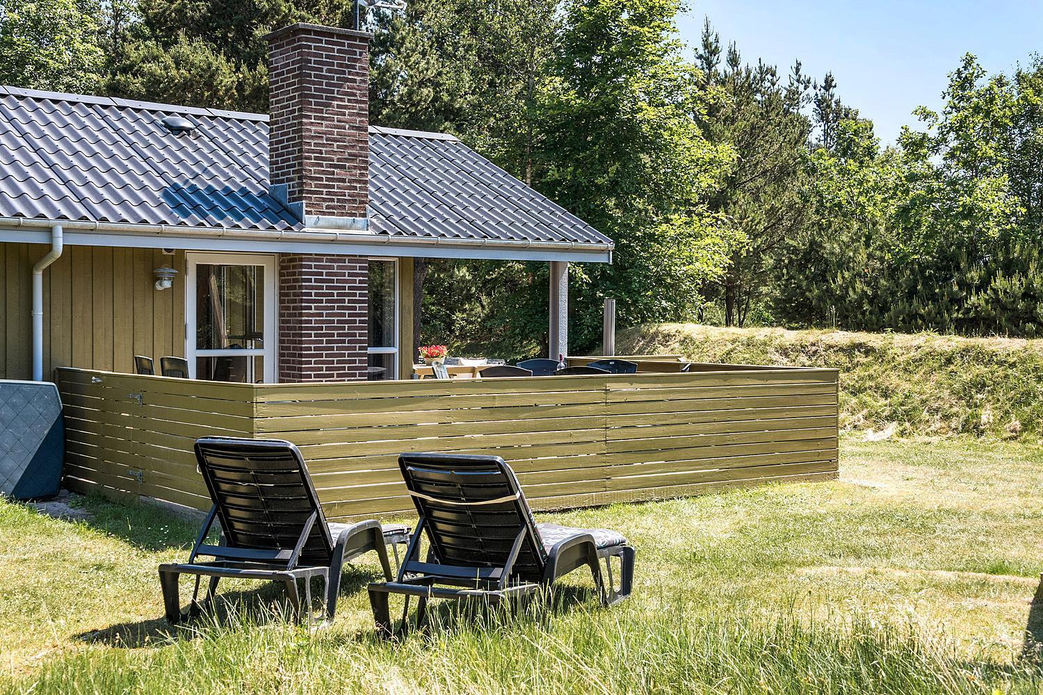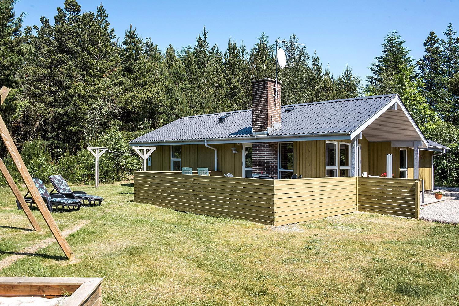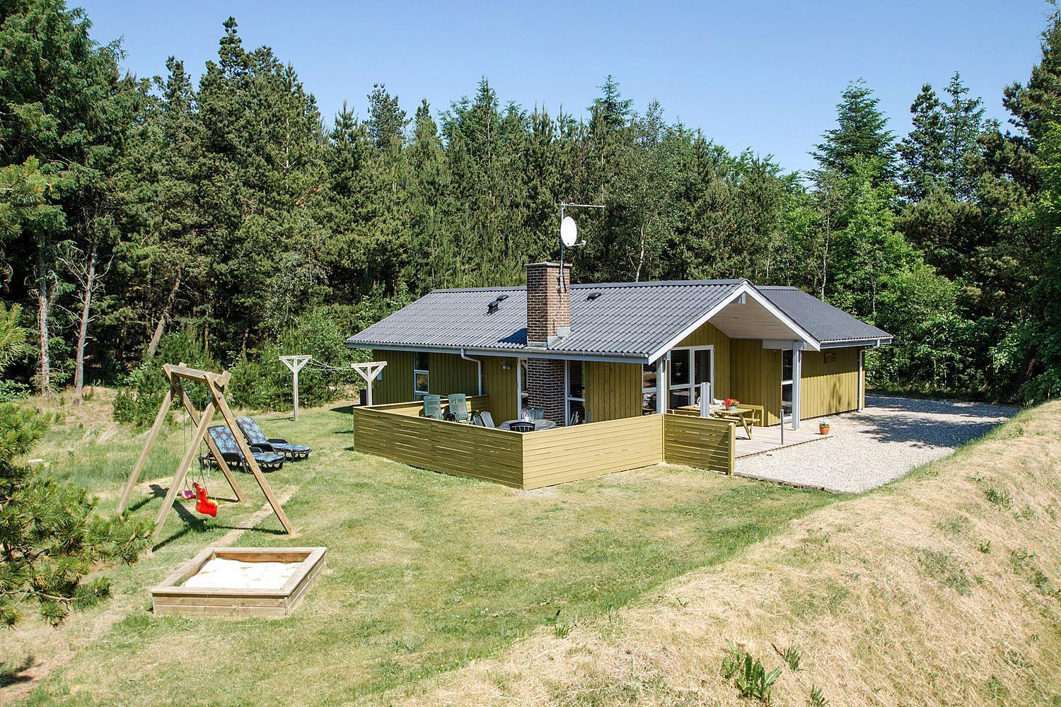 På ugeneret grund, delvis omkranset af træer, ligger dette velholdte og hyggelige feriehus. Feriehuset har nyere køkken/alrum og i husets stue med loft til kip er der opsat brændeovn. Feriehuset indeholder nyere og flot badeværelse. Stue og køkken ligger i åben forbindelse med hinanden. Veludstyret køkken. 3 gode og rummelige soverum. Fra stuen er der udgang til dejlig læ fyldt og delvis indhegnet terrasse. På den store naturgrund er der opsat flere aktiviteter for de mindste, bl.a. trampolin, gynger samt sandkasse.