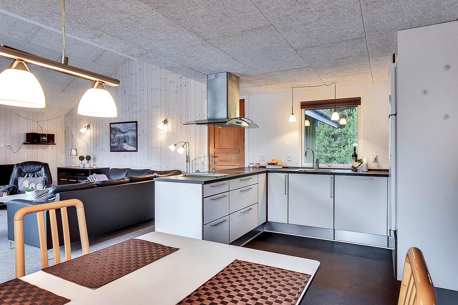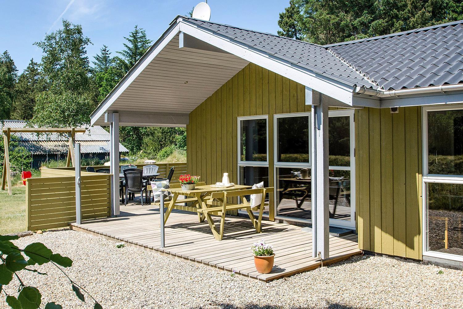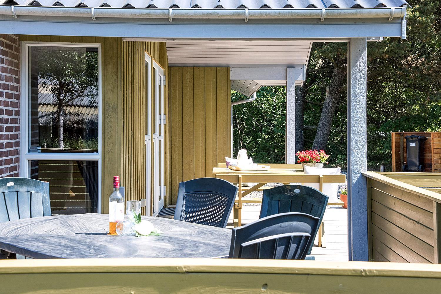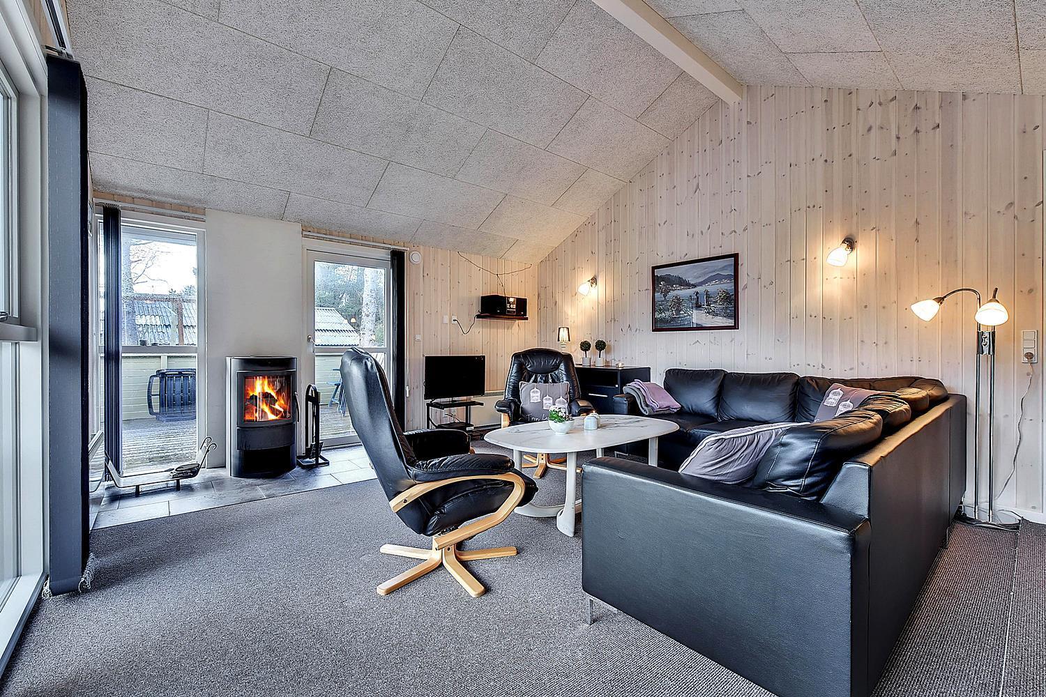 På ugeneret grund, delvis omkranset af træer, ligger dette velholdte og hyggelige feriehus. Feriehuset har nyere køkken/alrum og i husets stue med loft til kip er der opsat brændeovn. Feriehuset indeholder nyere og flot badeværelse. Stue og køkken ligger i åben forbindelse med hinanden. Veludstyret køkken. 3 gode og rummelige soverum. Fra stuen er der udgang til dejlig læ fyldt og delvis indhegnet terrasse. På den store naturgrund er der opsat flere aktiviteter for de mindste, bl.a. trampolin, gynger samt sandkasse.