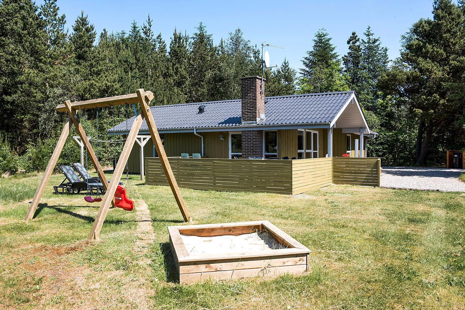 Hyggeligt feriehus med brændeovn, sauna og stor naturgrund med aktiviteter for børn i Henne Strand Øst.