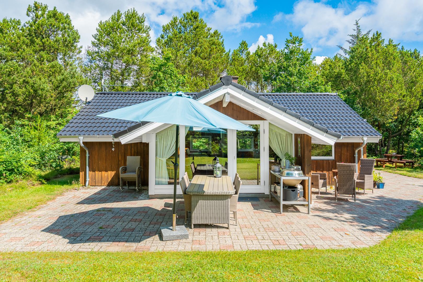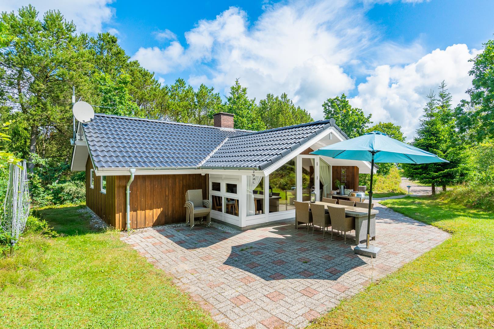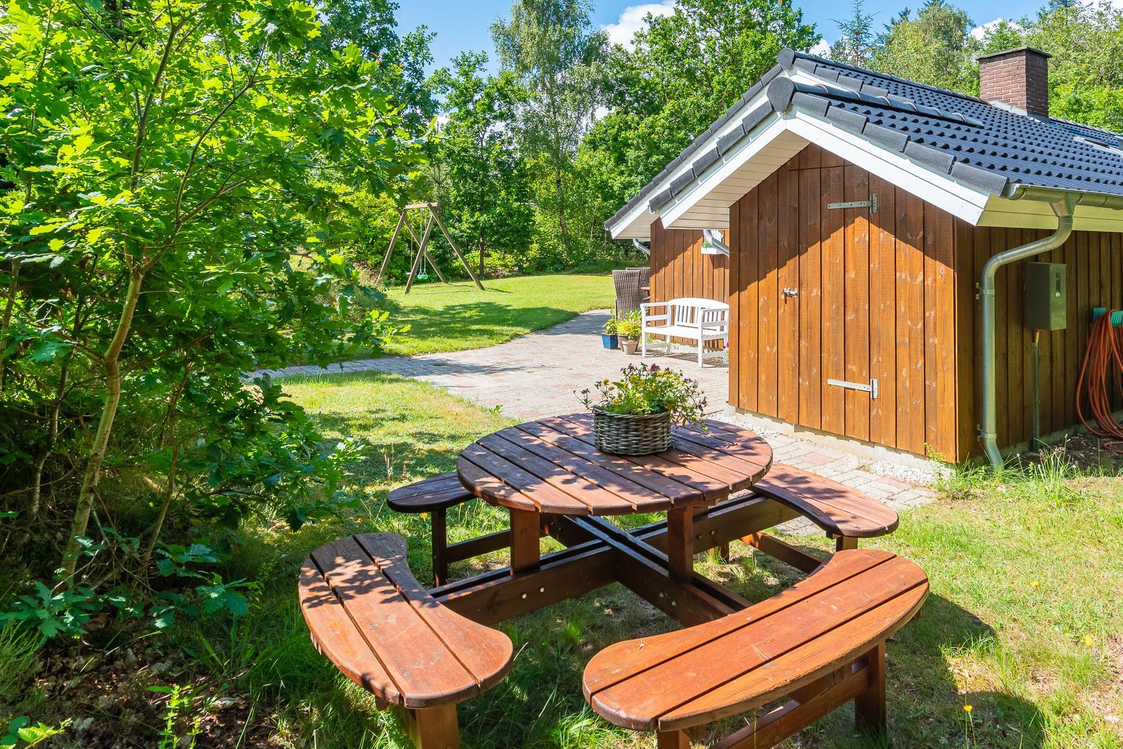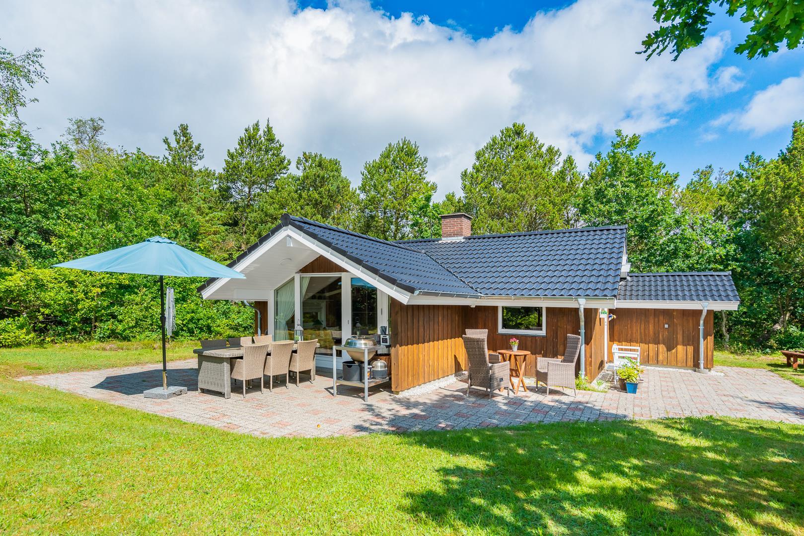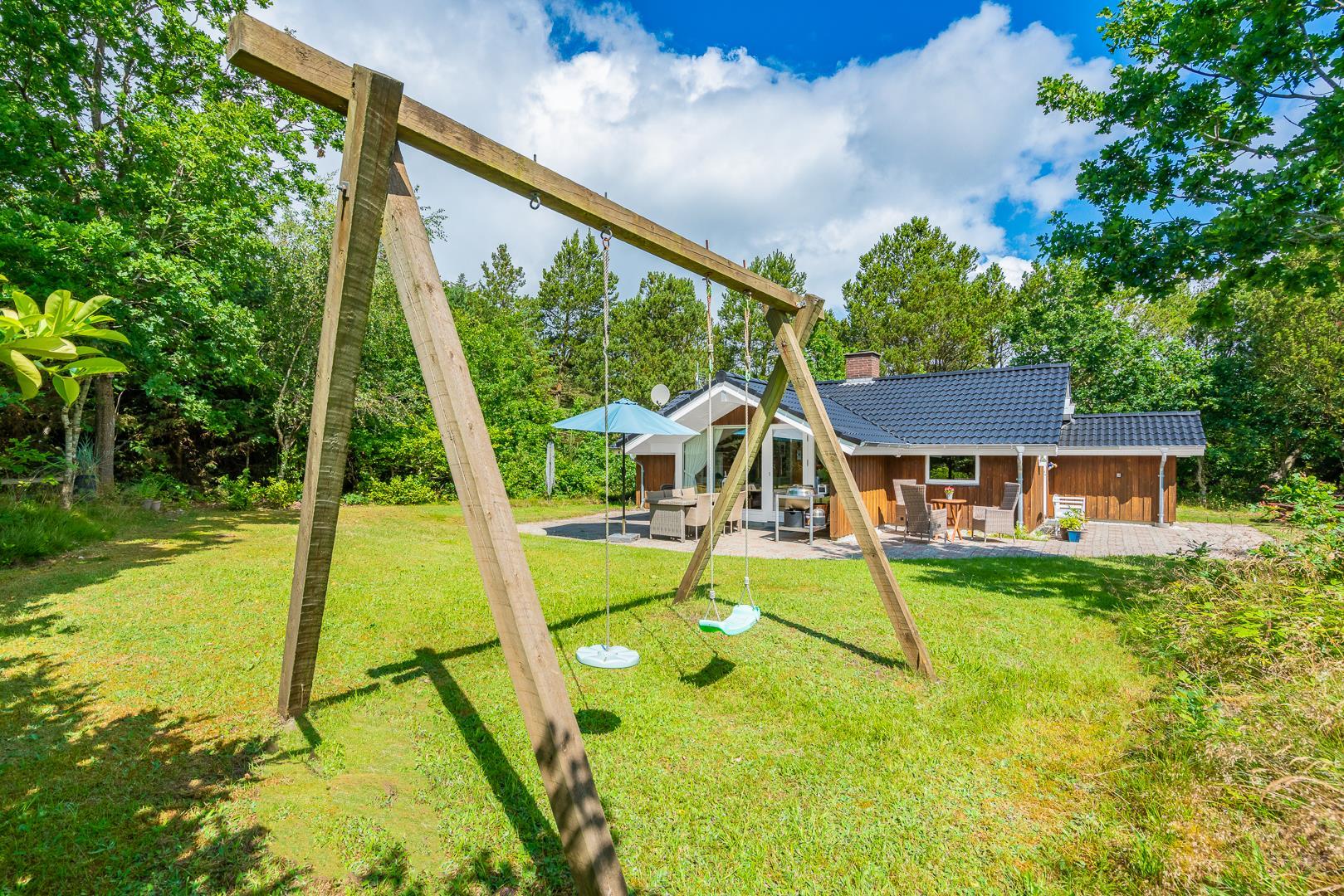 Dette velholdte og charmerende feriehus byder på en personlig og hyggelig indretning, beliggende på en afskærmet naturgrund omgivet af træer, der giver gode læforhold og en følelse af privatliv. Her er god plads til leg og boldspil i haven. Der er også sørget for underholdning til de mindste feriegæster med en sandkasse og et gyngestativ.
