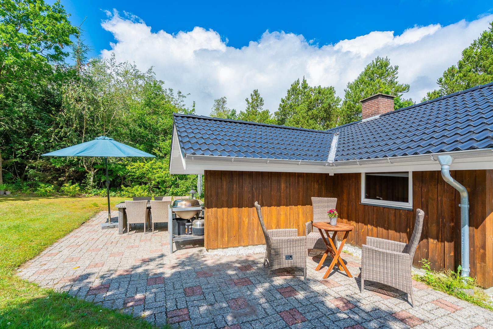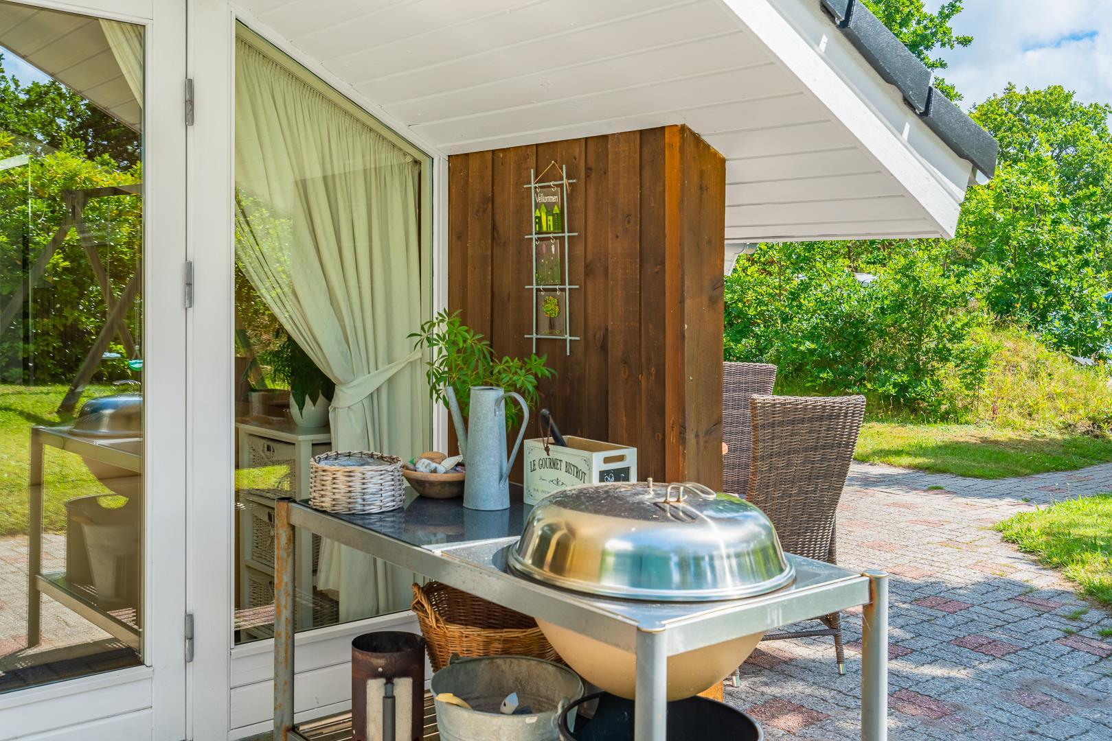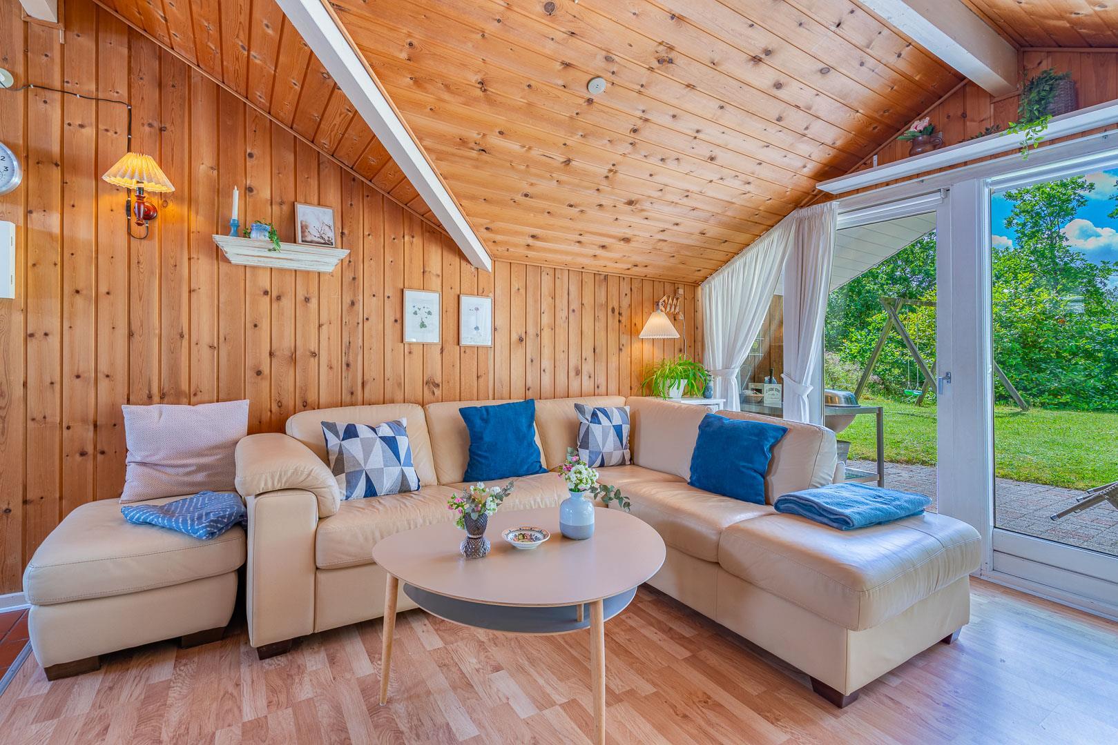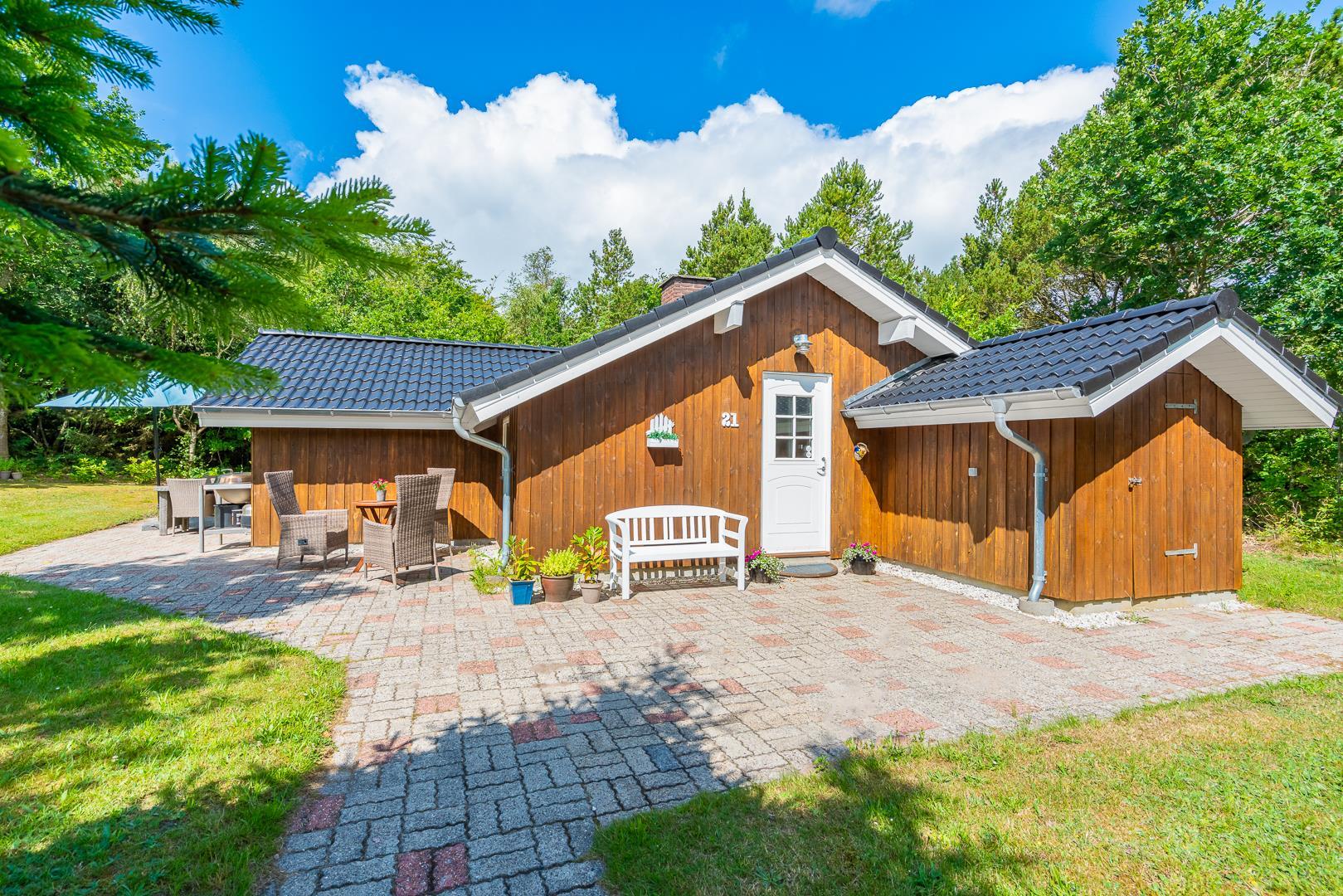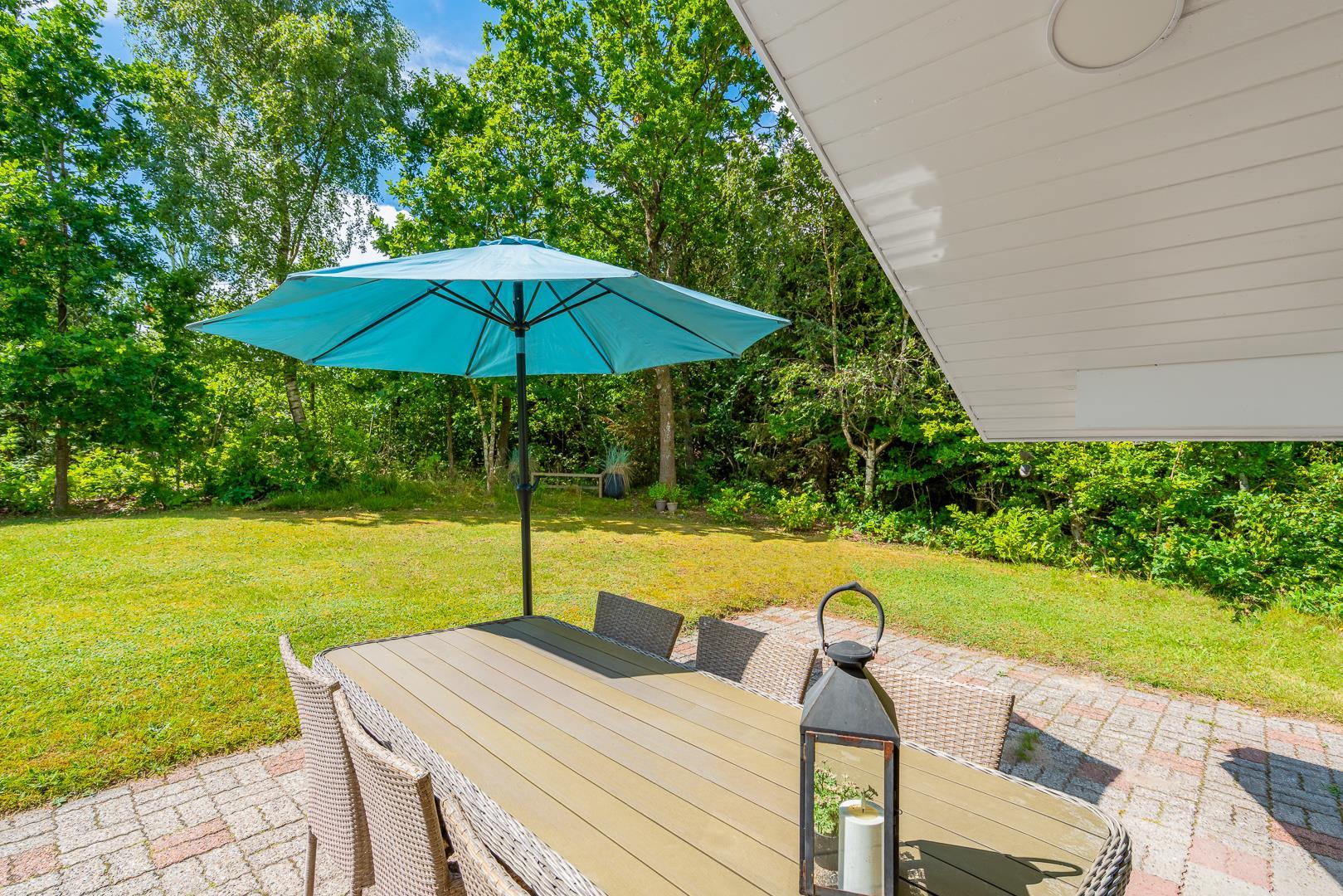 Dette velholdte og charmerende feriehus byder på en personlig og hyggelig indretning, beliggende på en afskærmet naturgrund omgivet af træer, der giver gode læforhold og en følelse af privatliv. Her er god plads til leg og boldspil i haven. Der er også sørget for underholdning til de mindste feriegæster med en sandkasse og et gyngestativ.