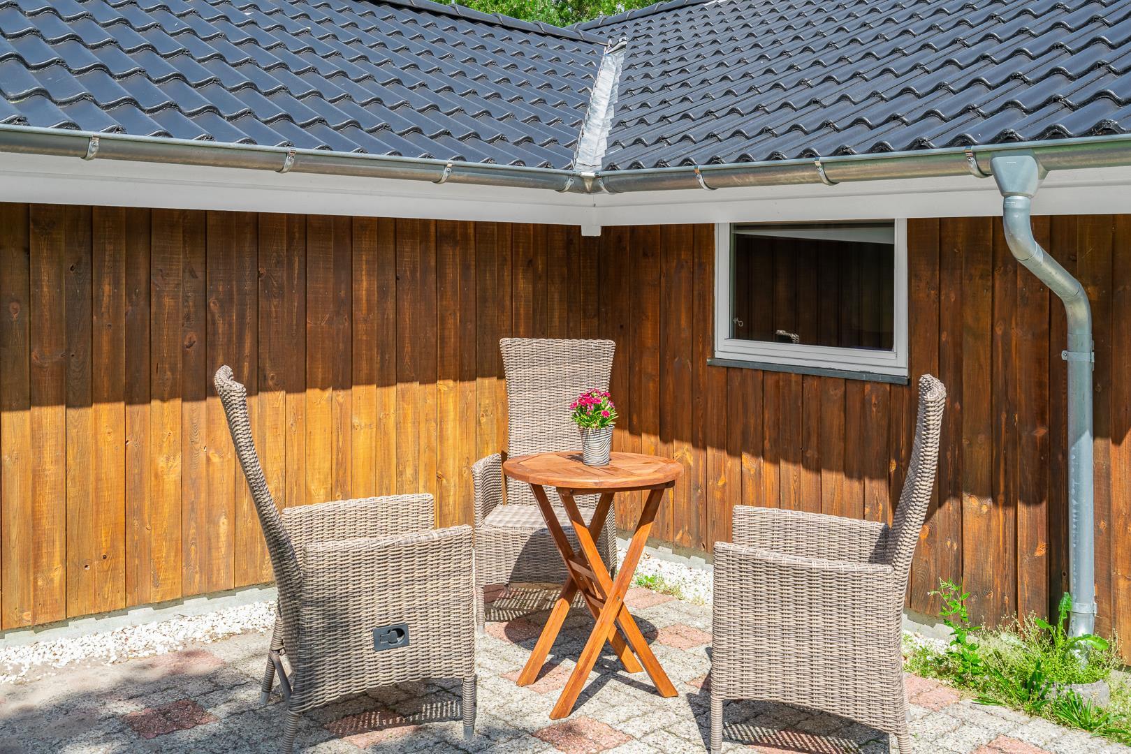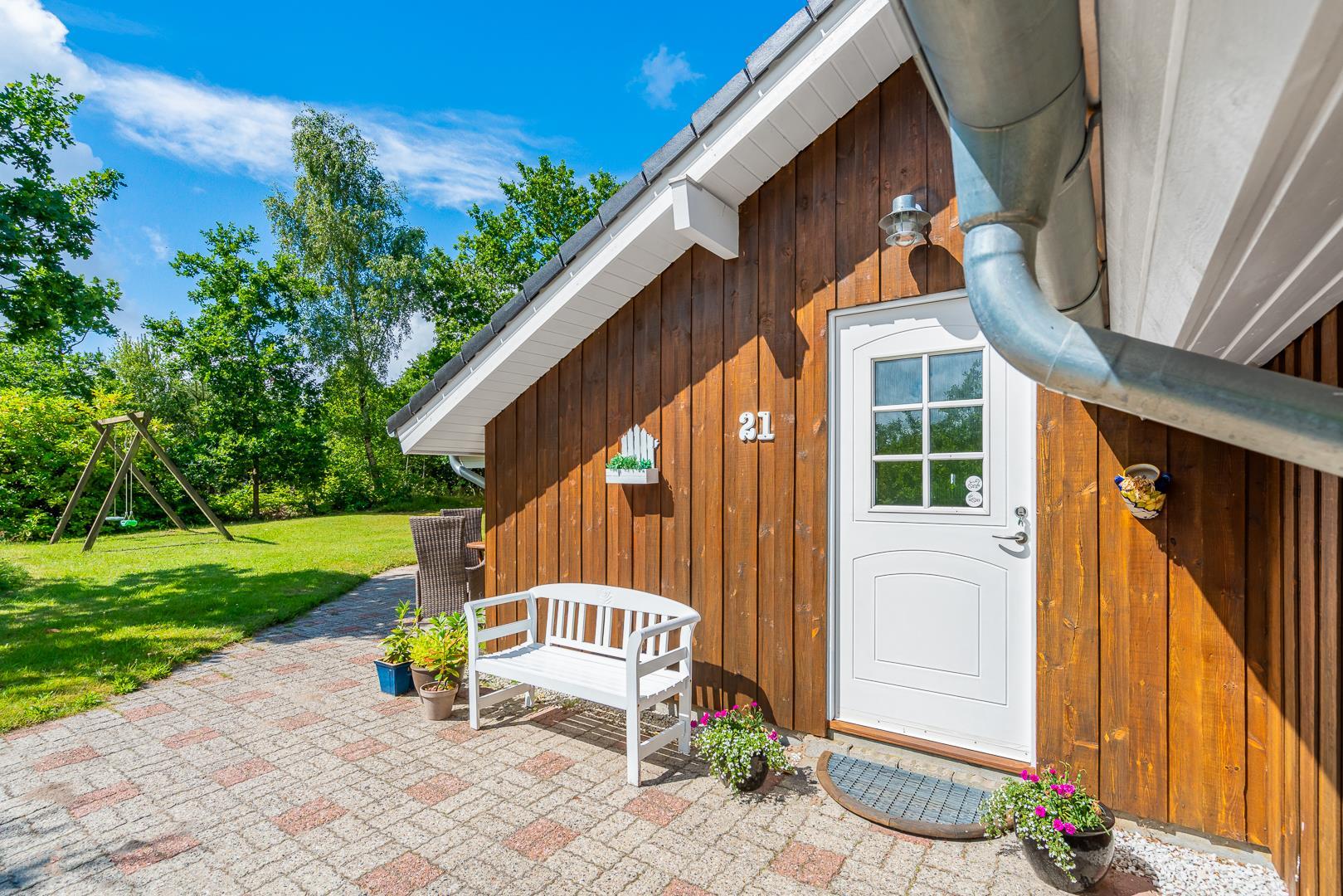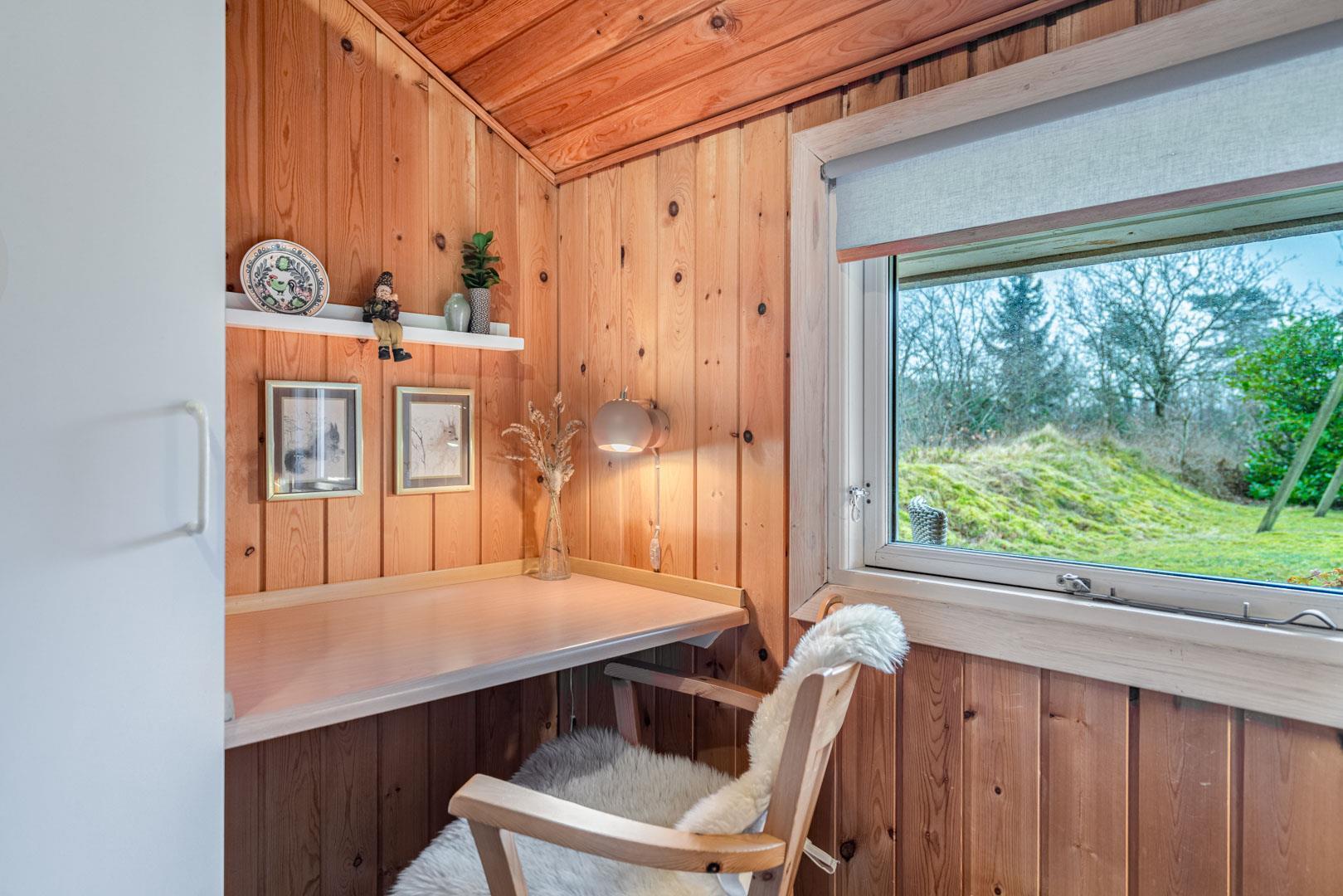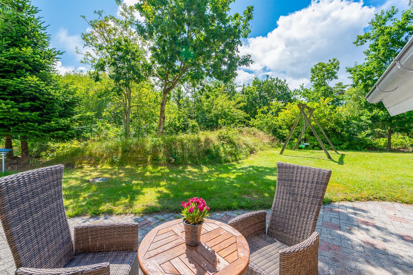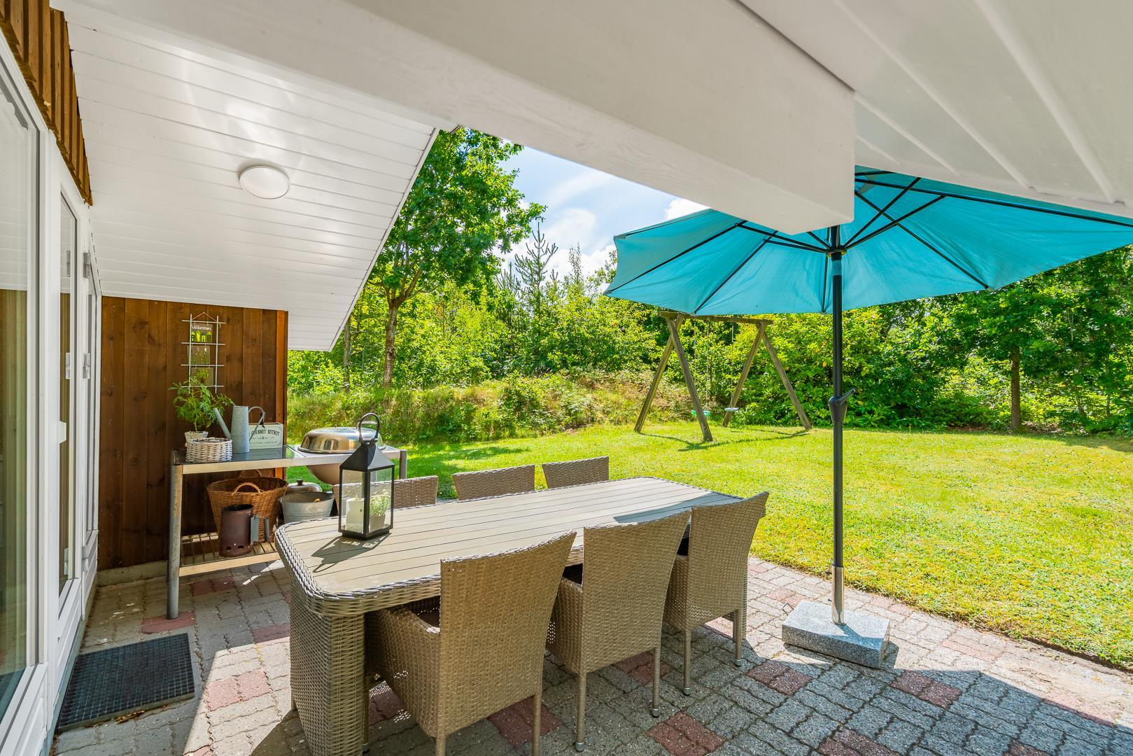 Dette velholdte og charmerende feriehus byder på en personlig og hyggelig indretning, beliggende på en afskærmet naturgrund omgivet af træer, der giver gode læforhold og en følelse af privatliv. Her er god plads til leg og boldspil i haven. Der er også sørget for underholdning til de mindste feriegæster med en sandkasse og et gyngestativ.