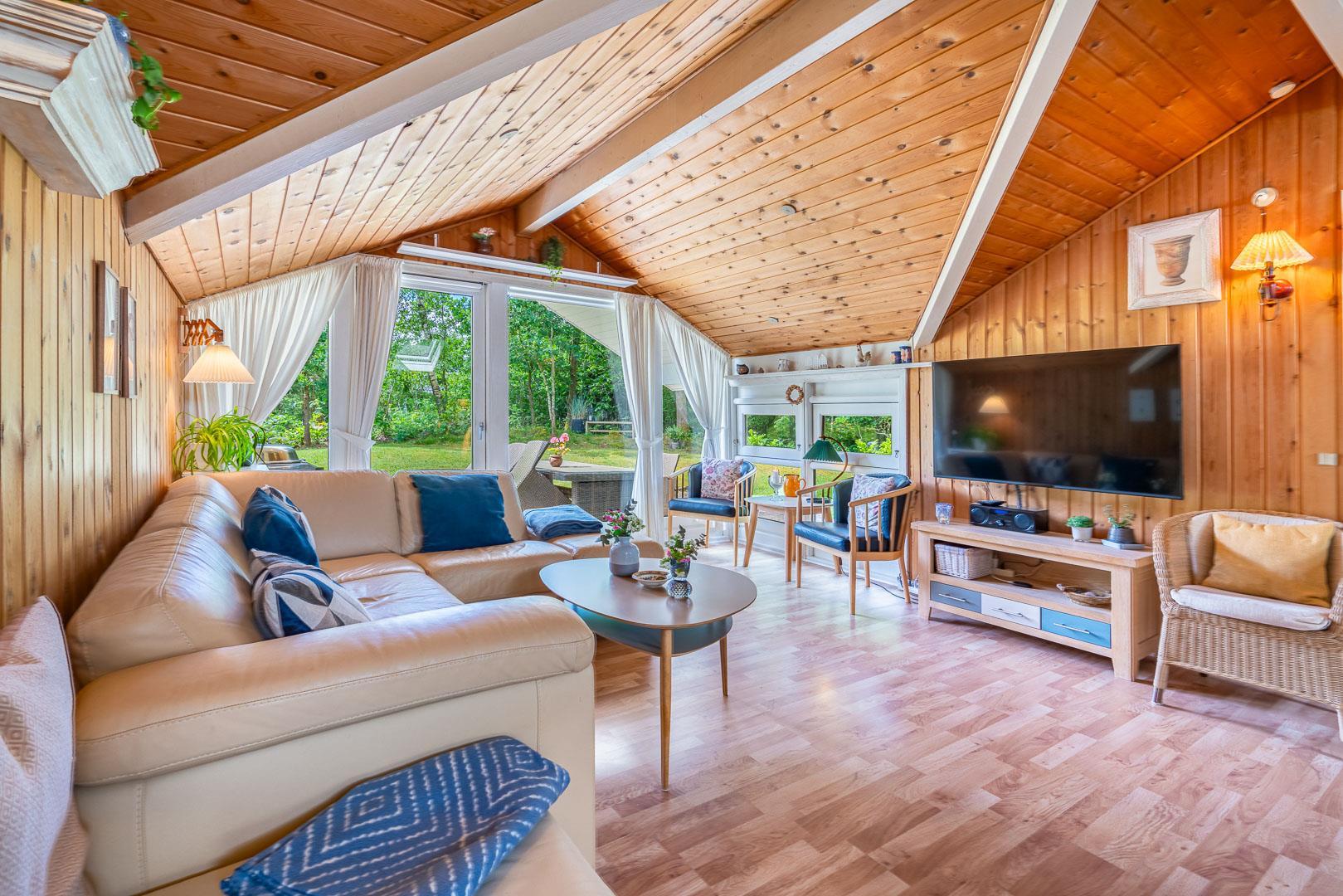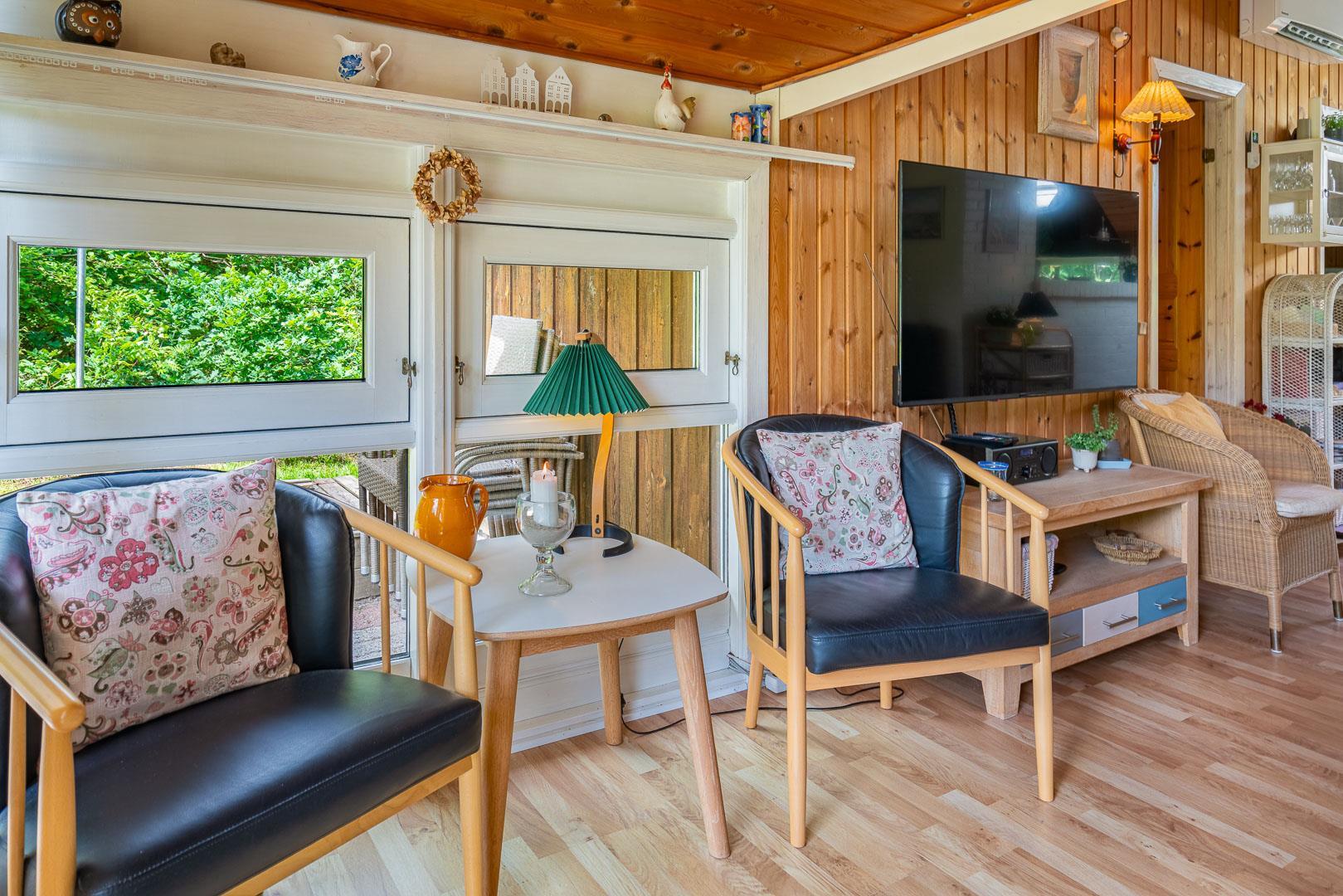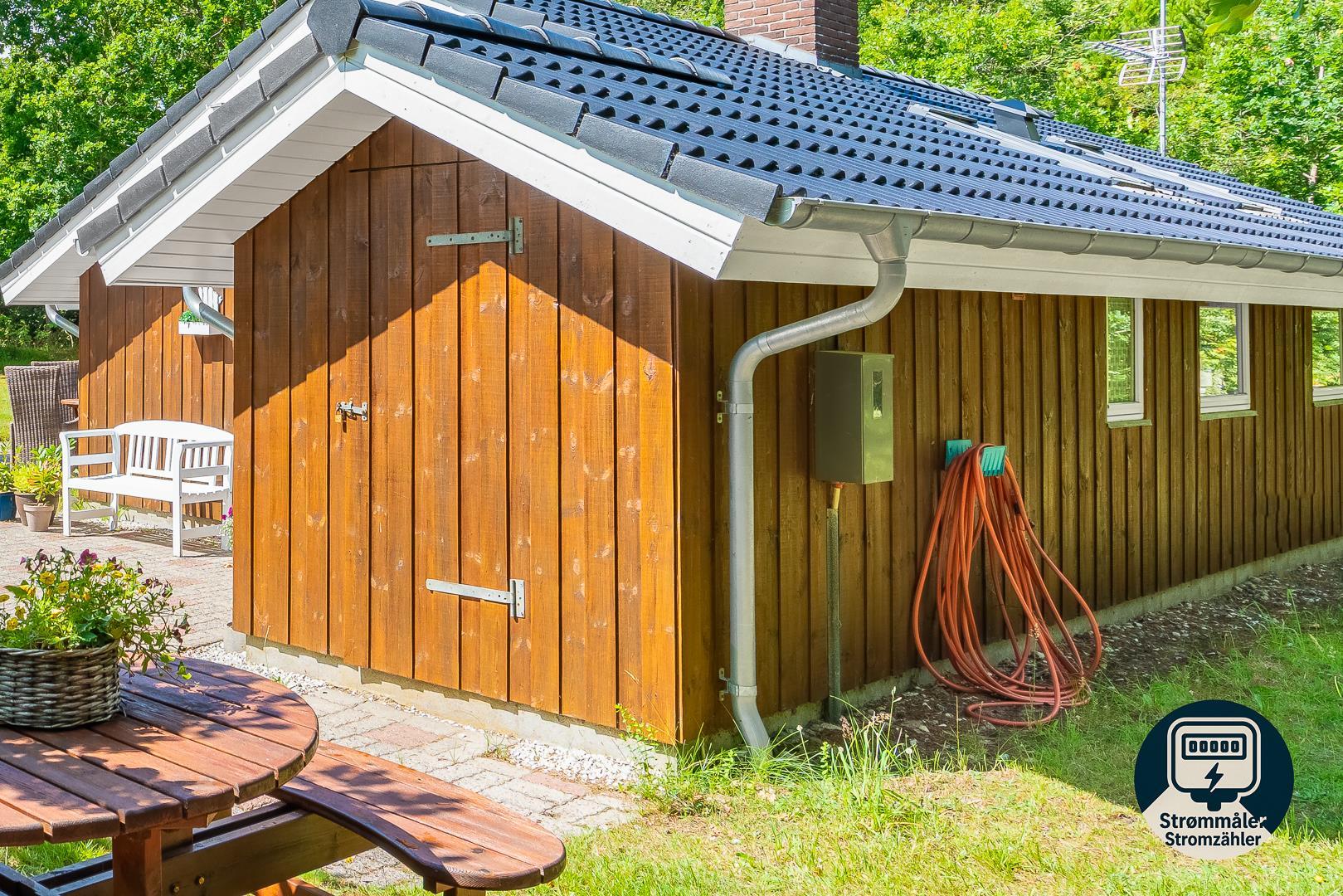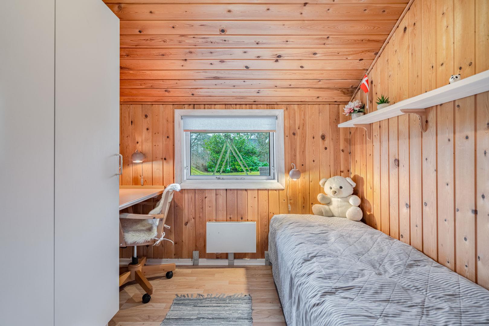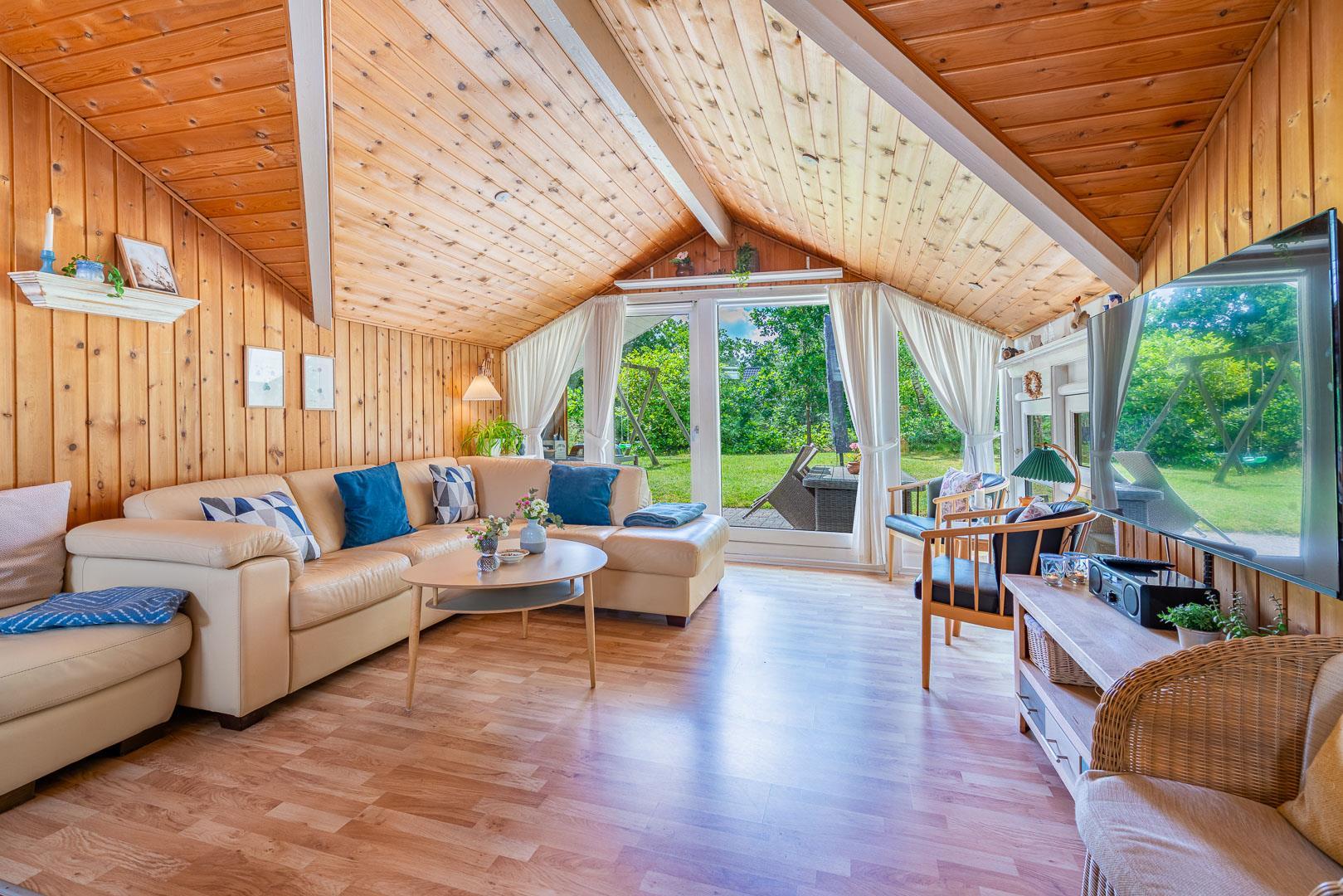 Dette velholdte og charmerende feriehus byder på en personlig og hyggelig indretning, beliggende på en afskærmet naturgrund omgivet af træer, der giver gode læforhold og en følelse af privatliv. Her er god plads til leg og boldspil i haven. Der er også sørget for underholdning til de mindste feriegæster med en sandkasse og et gyngestativ.
