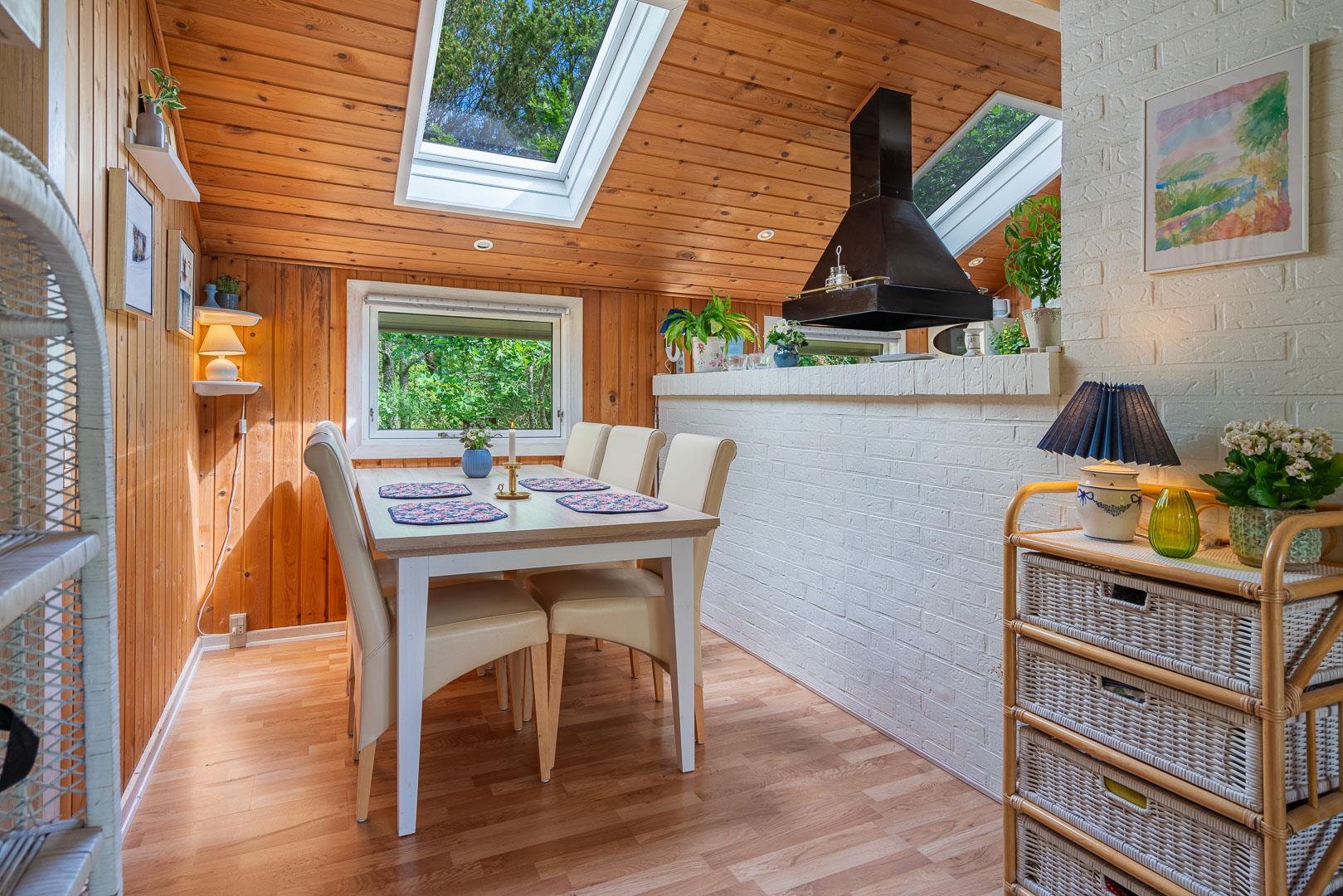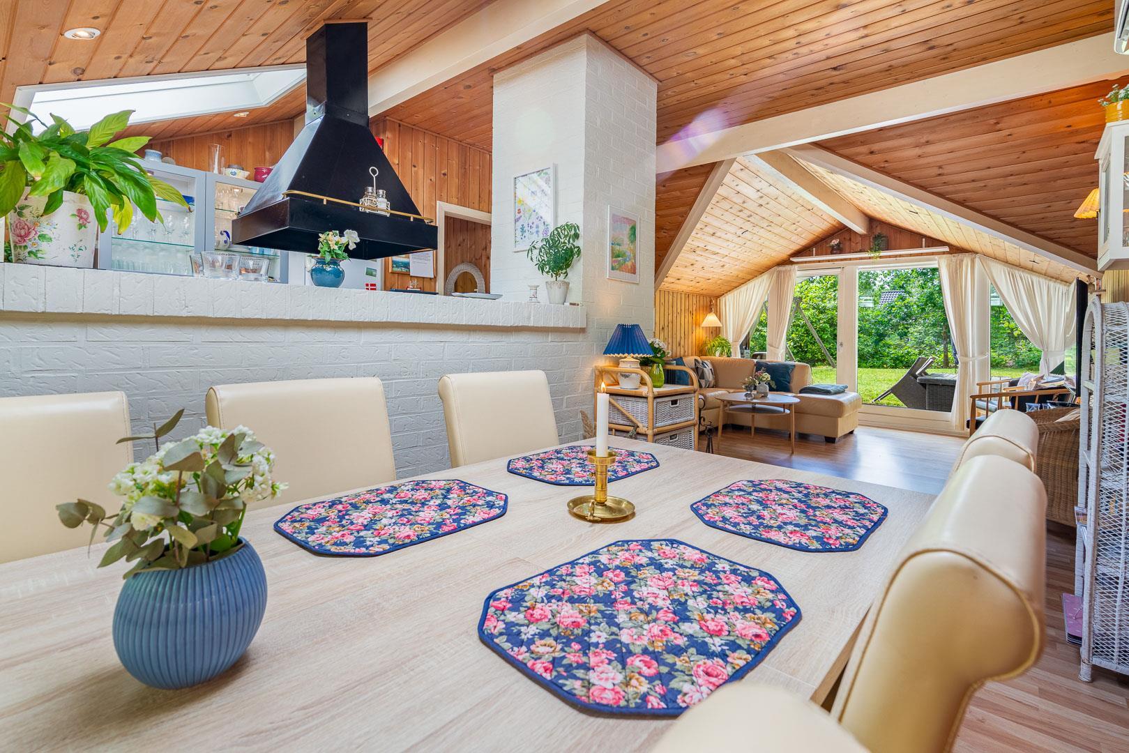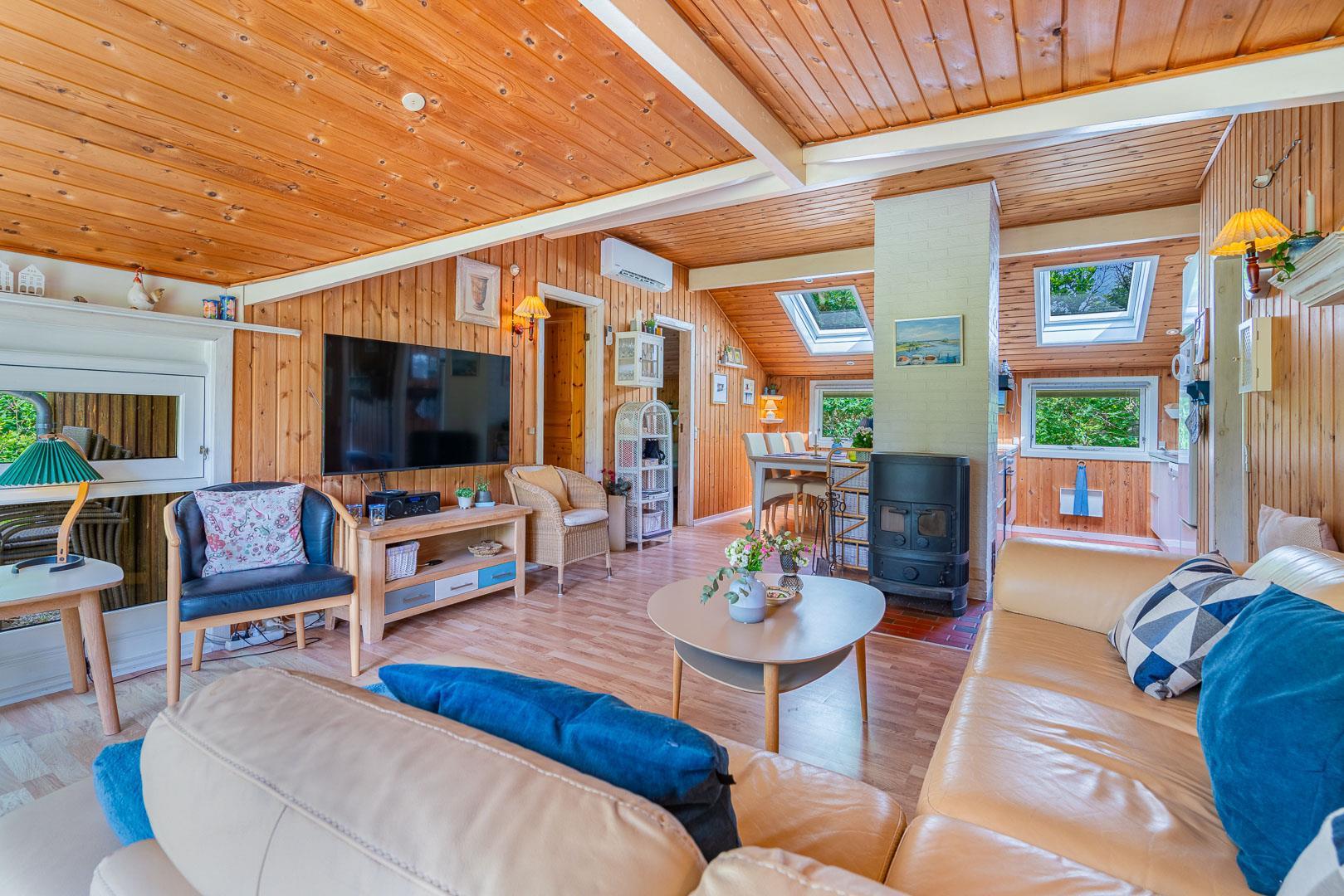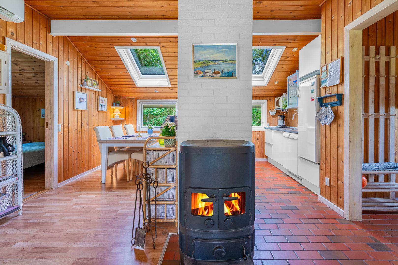 Køkkenet ligger i åben forbindelse med stue, hvor en stor hjørnesofa og en brændeovn skaber en varm og indbydende atmosfære. Herfra er der udgang til en delvist overdækket terrasse, hvor du kan nyde dine måltider eller morgenkaffen i ro og mag.