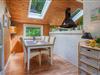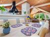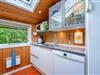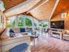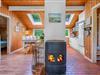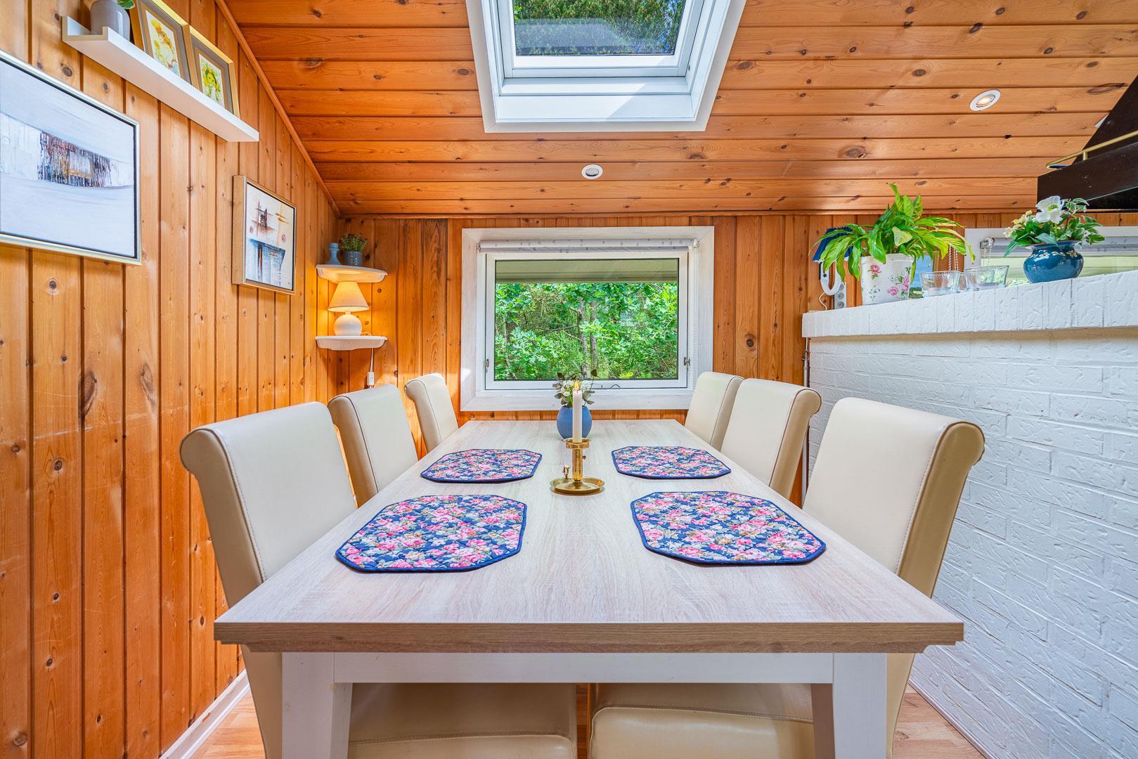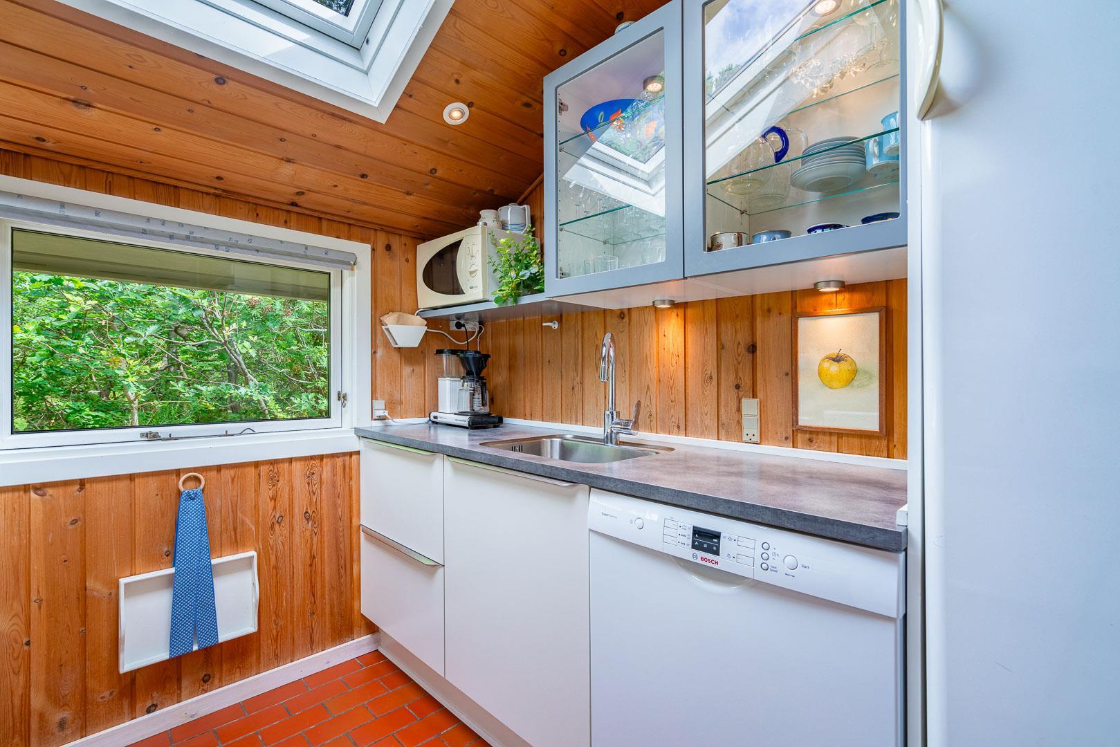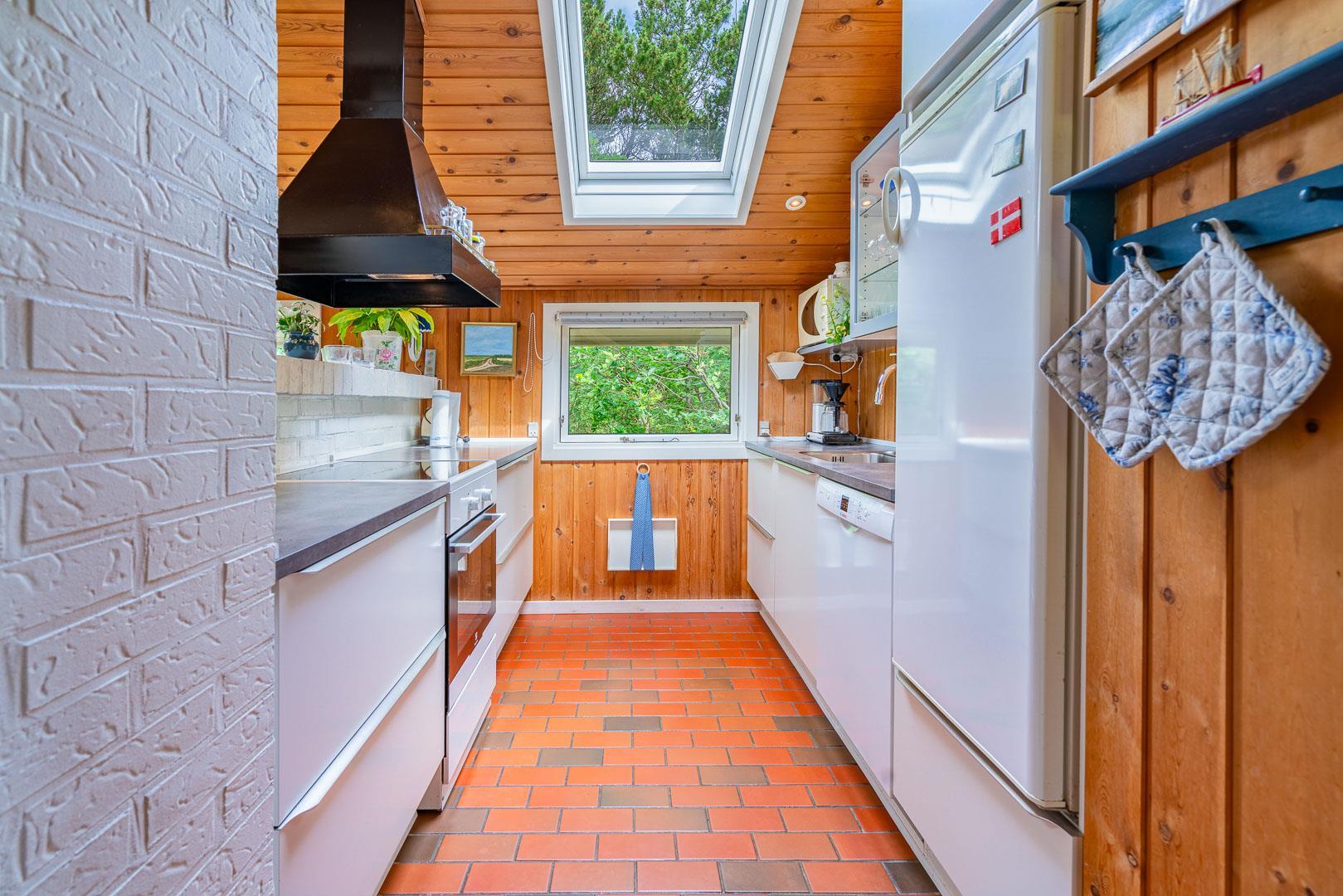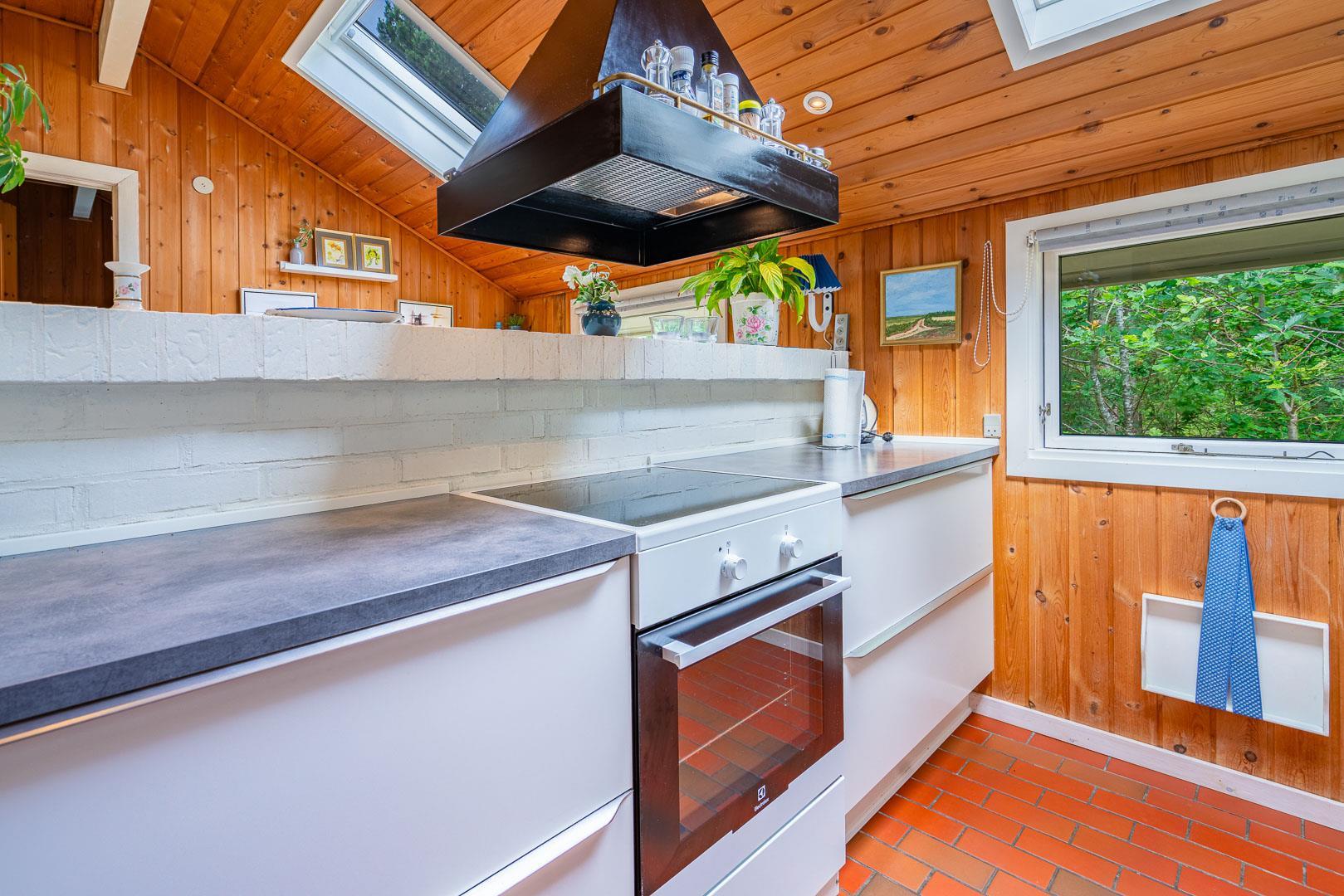 Køkkenet ligger i åben forbindelse med stue, hvor en stor hjørnesofa og en brændeovn skaber en varm og indbydende atmosfære. Herfra er der udgang til en delvist overdækket terrasse, hvor du kan nyde dine måltider eller morgenkaffen i ro og mag.