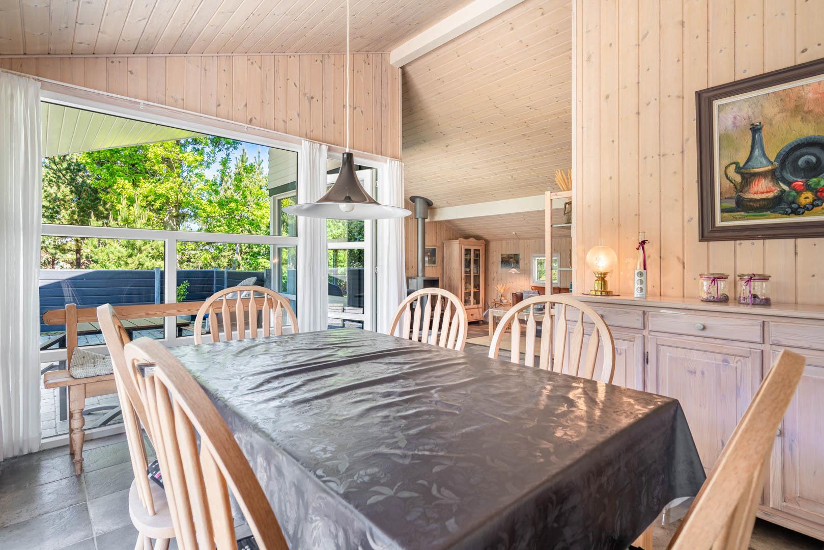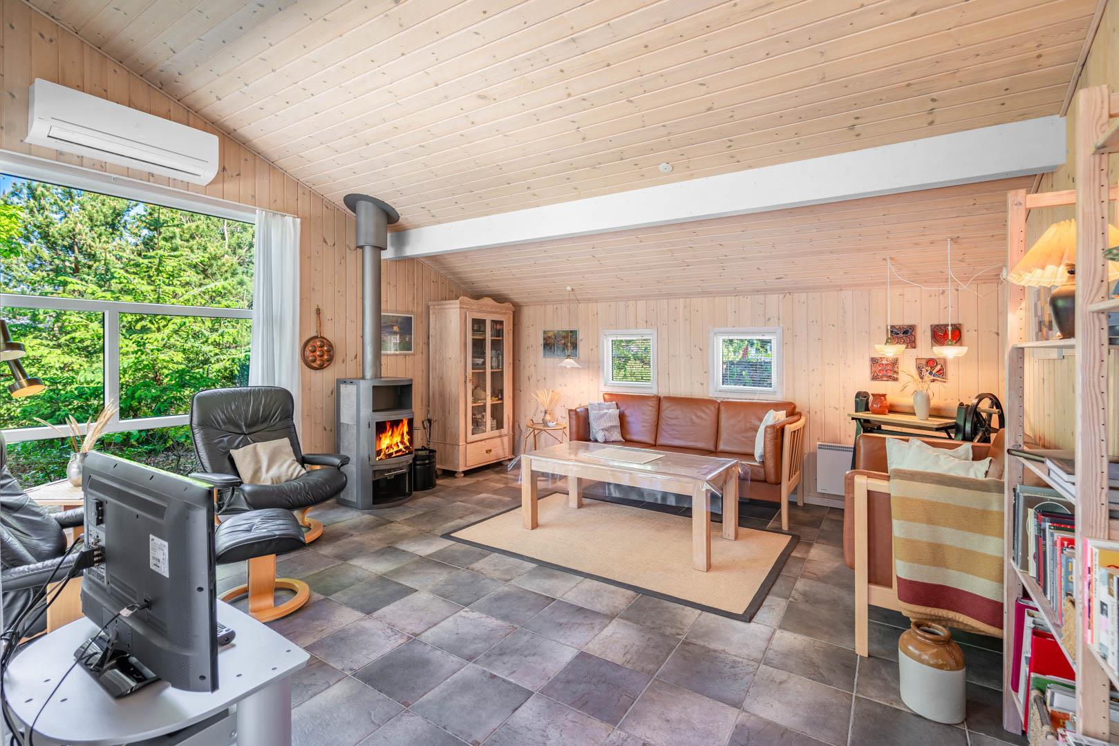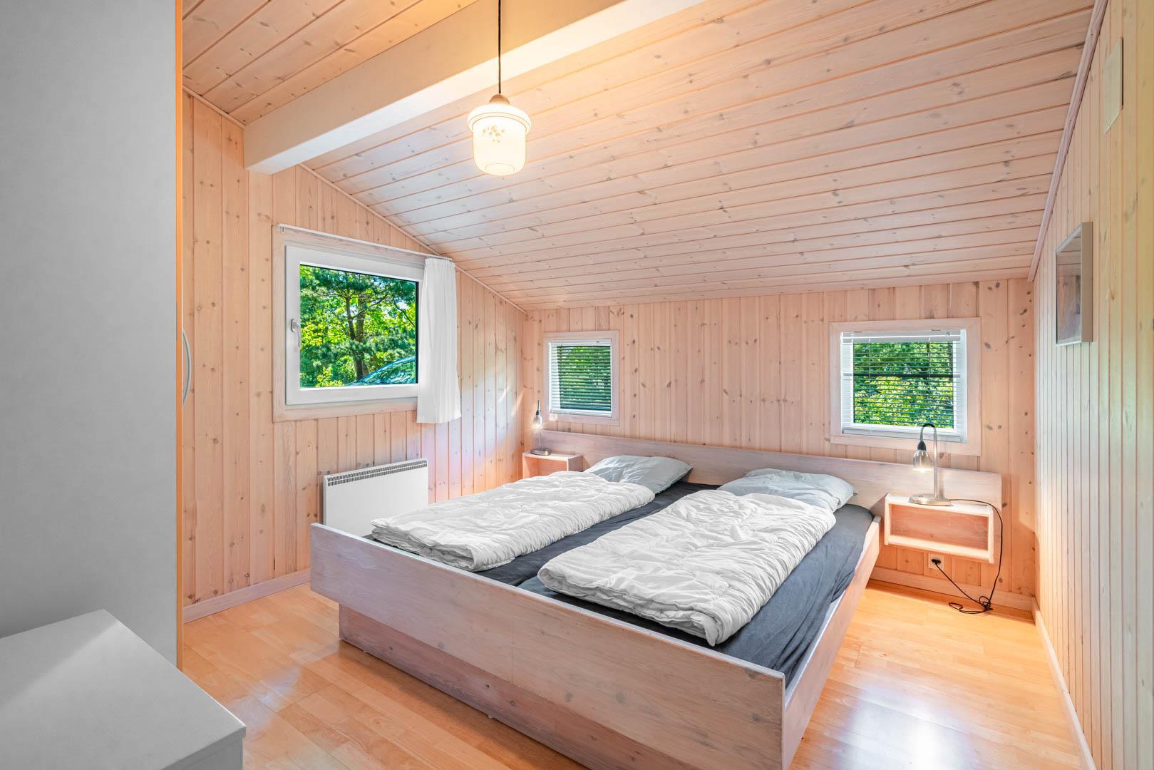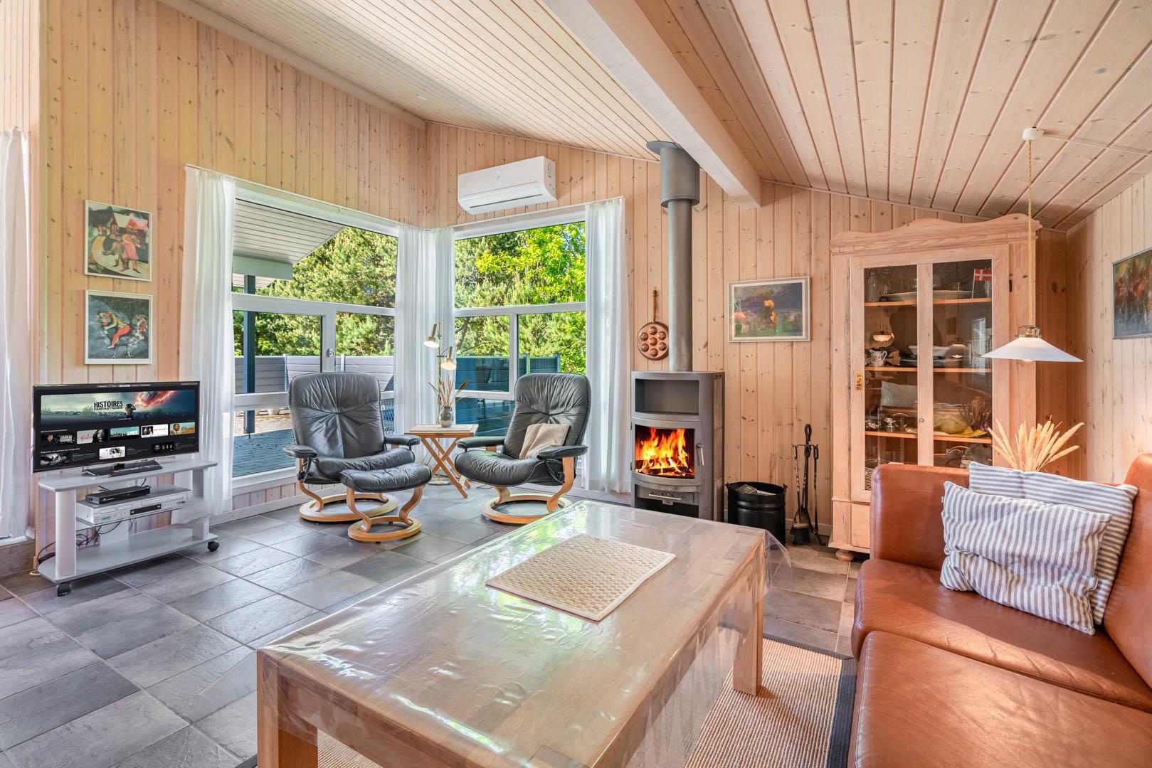 Indendørs byder sommerhuset på et lyst og rummeligt opholdsområde, hvor en brændeovn og komfortable møbler skaber den ideelle ramme for afslapning og samvær. Det åbne køkken og spiseområde giver mulighed for nem tilberedning af lækre måltider, mens store vinduer lader lyset strømme ind og giver en forfriskende udsigt til den omkringliggende natur. Efter en dag med sjov og aktiviteter kan du forkæle dig selv i badeværelset, der er udstyret med både sauna og spa - den ultimative måde at slappe af på. Med tre velindrettede soveværelser og to badeværelser er der rigeligt med plads til hele familien eller en gruppe venner.