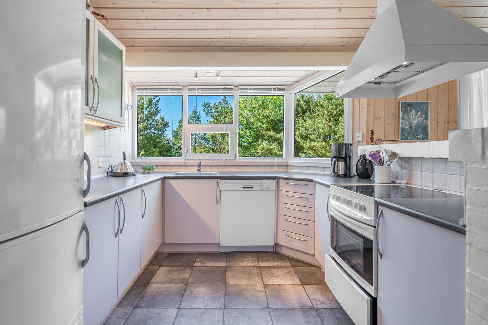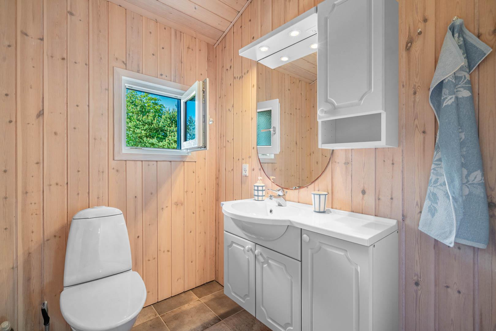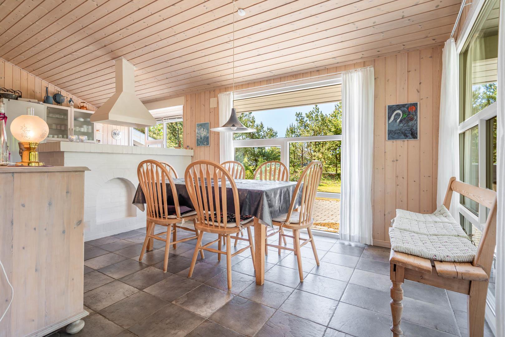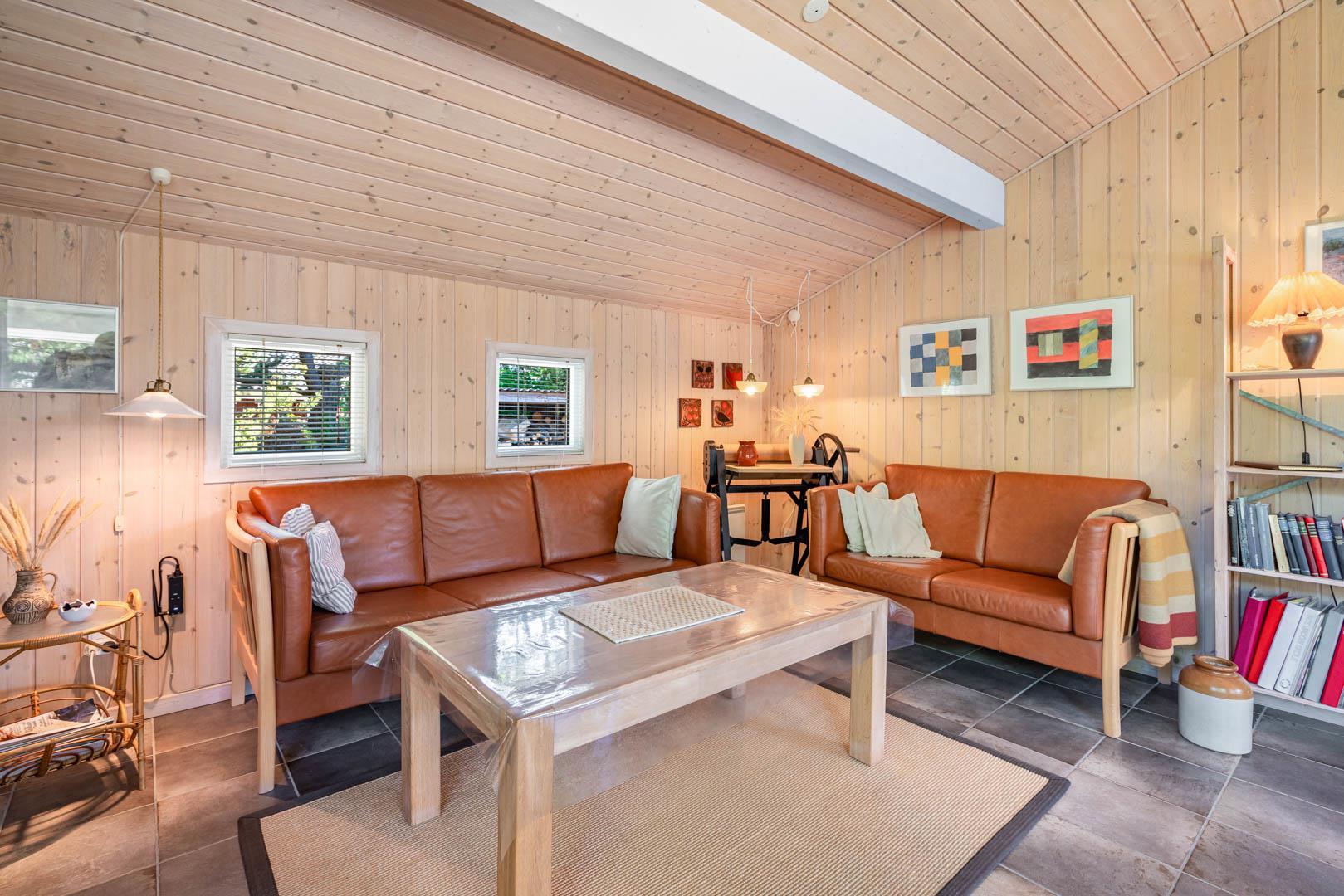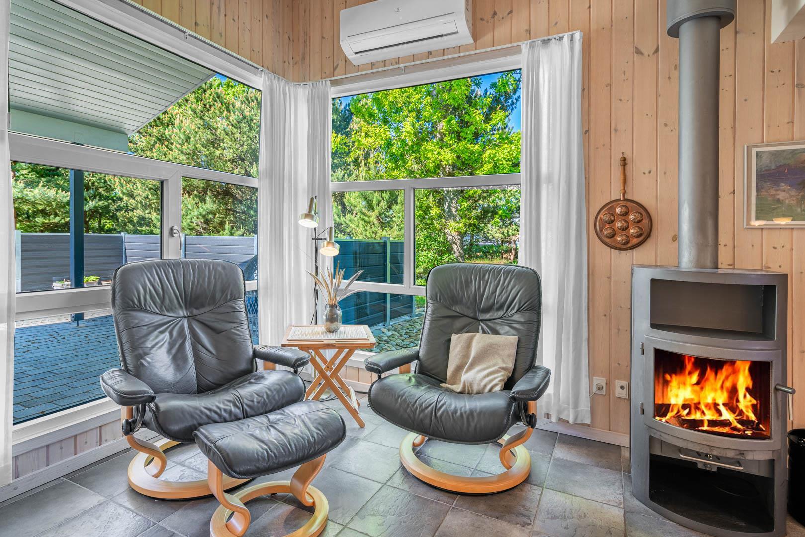 Indendørs byder sommerhuset på et lyst og rummeligt opholdsområde, hvor en brændeovn og komfortable møbler skaber den ideelle ramme for afslapning og samvær. Det åbne køkken og spiseområde giver mulighed for nem tilberedning af lækre måltider, mens store vinduer lader lyset strømme ind og giver en forfriskende udsigt til den omkringliggende natur. Efter en dag med sjov og aktiviteter kan du forkæle dig selv i badeværelset, der er udstyret med både sauna og spa - den ultimative måde at slappe af på. Med tre velindrettede soveværelser og to badeværelser er der rigeligt med plads til hele familien eller en gruppe venner.