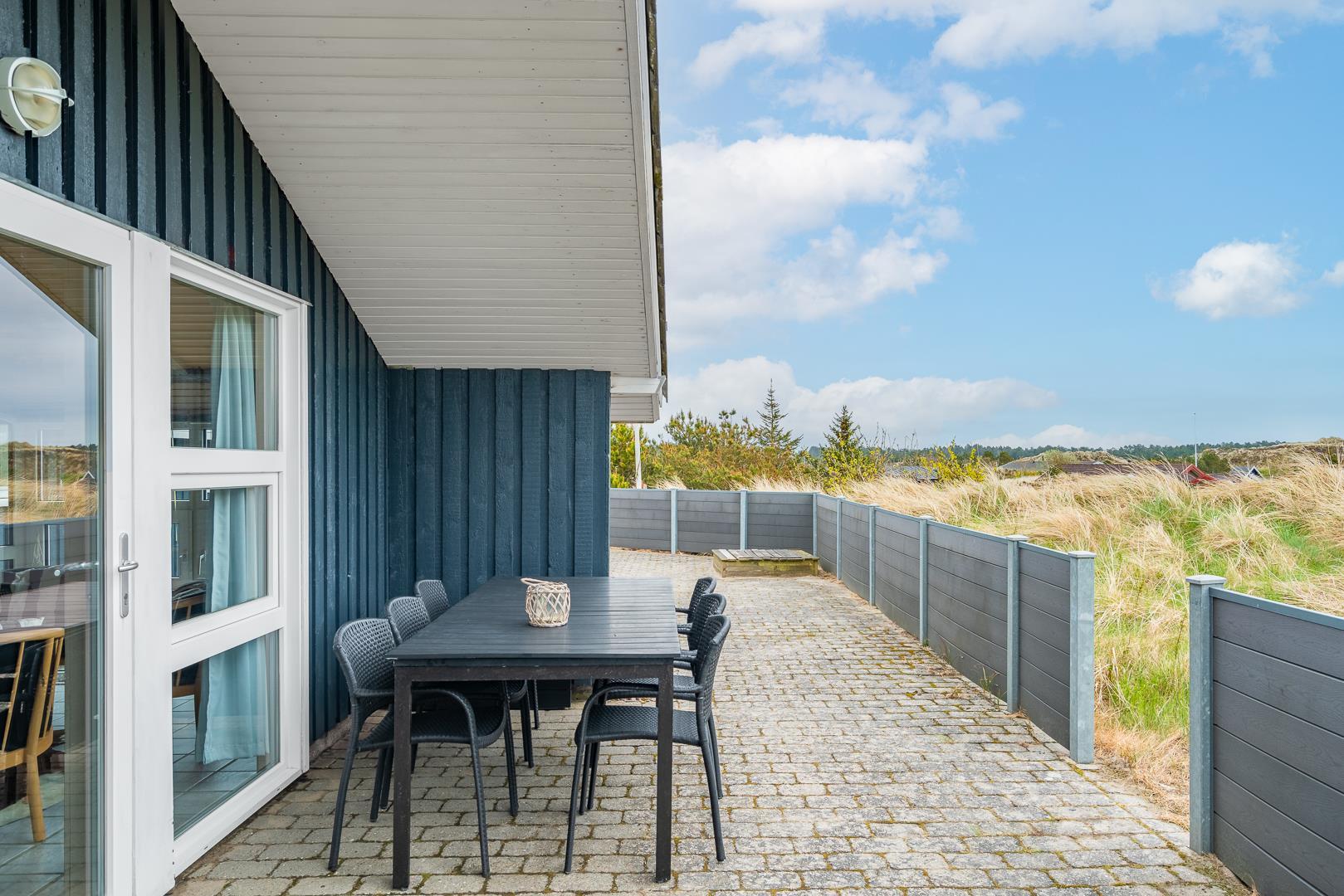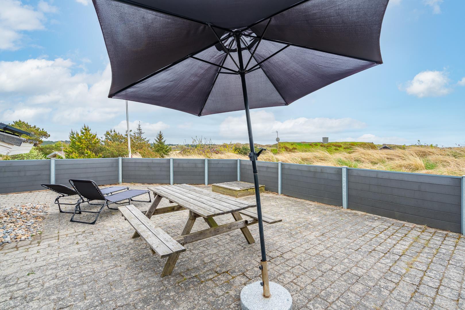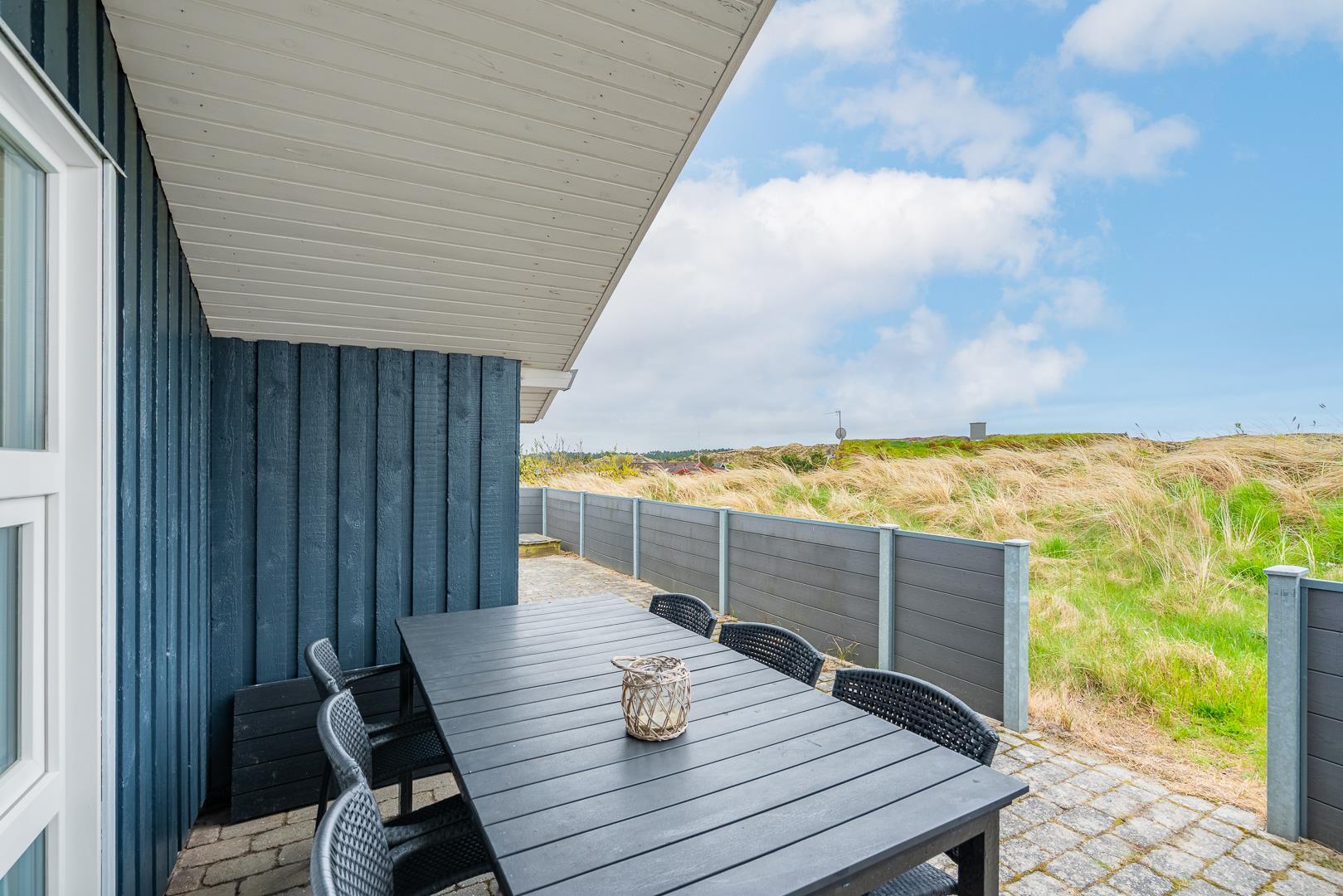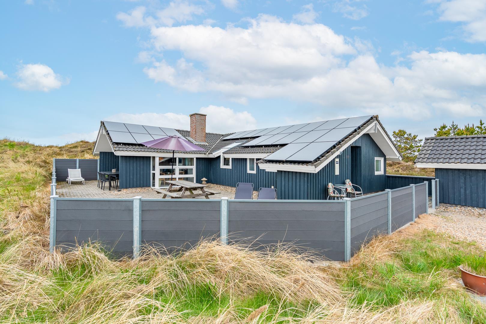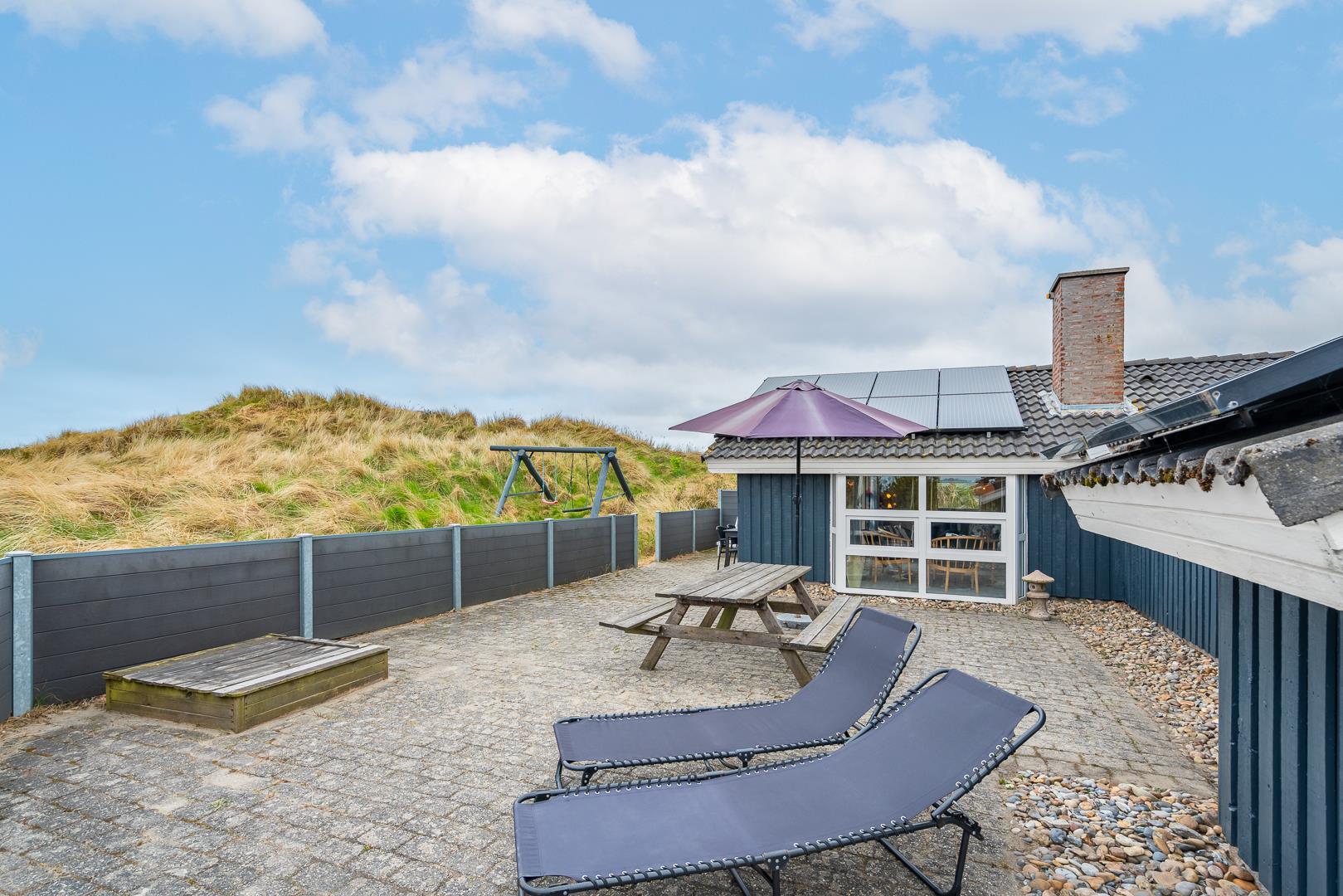 Hyggeligt feriehus i Henne Strand med sauna, spabad og stor sydvendt terrasse med flot udsigt.