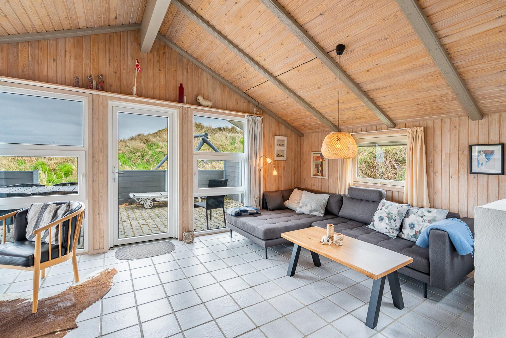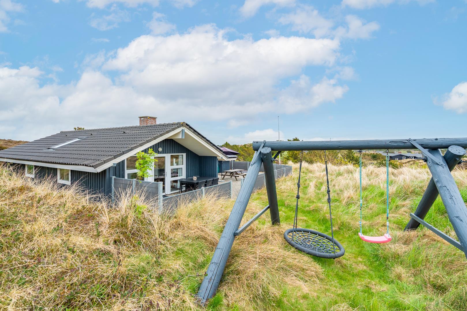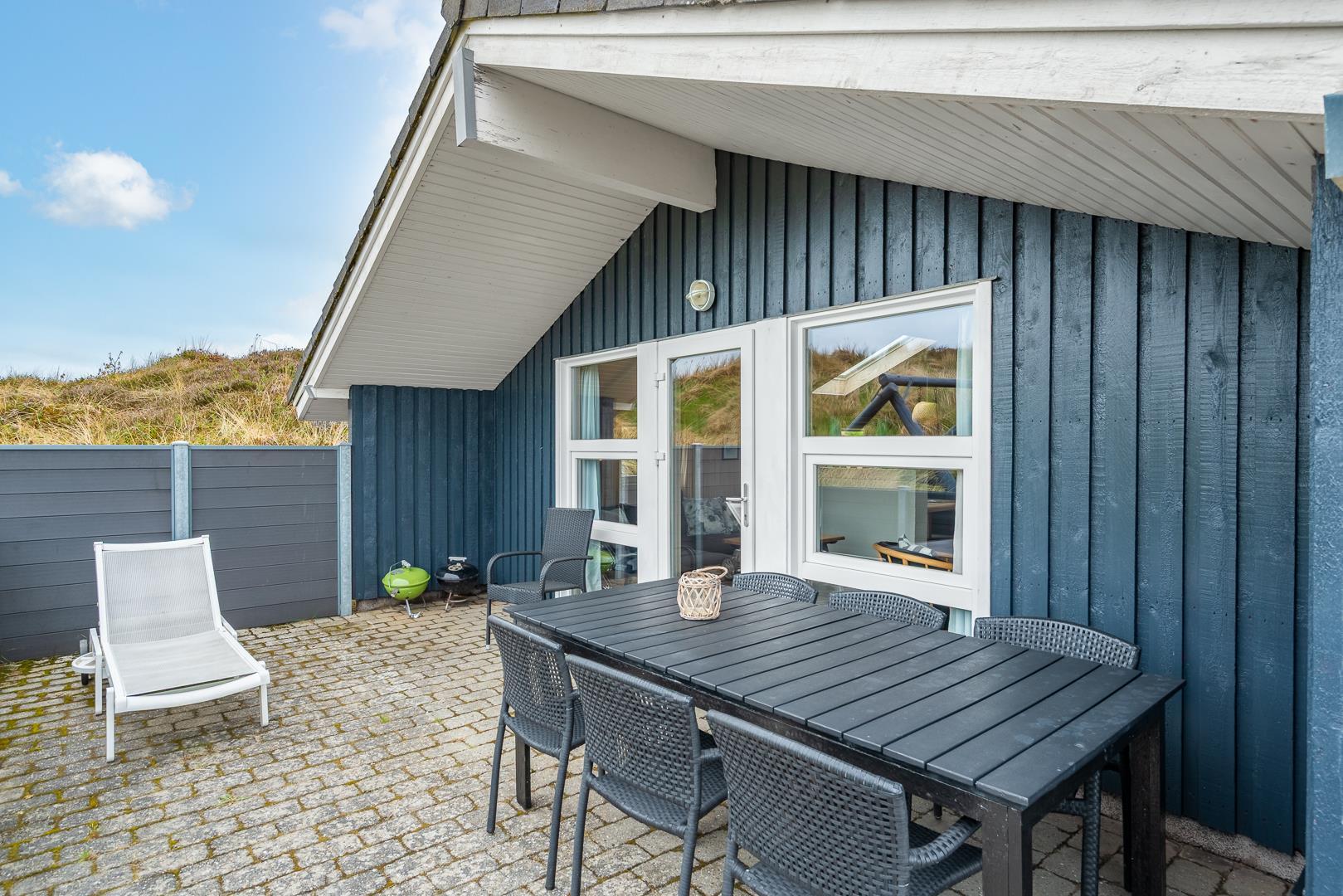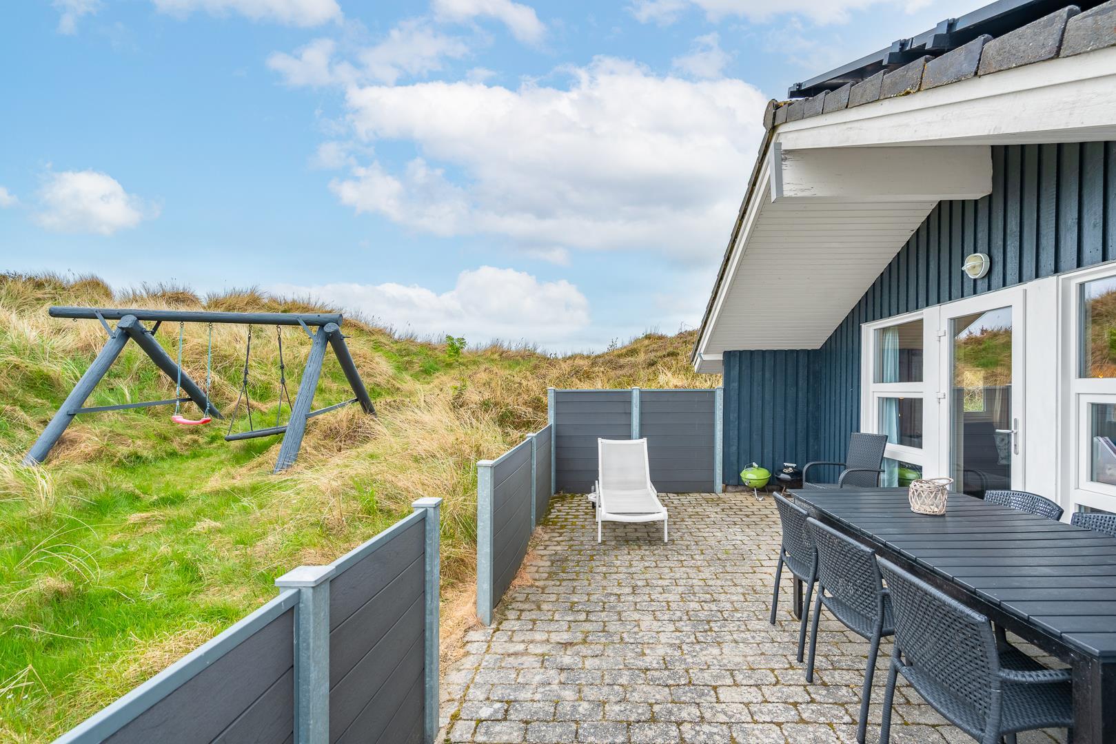 Hyggeligt feriehus i Henne Strand med sauna, spabad og stor sydvendt terrasse med flot udsigt.
