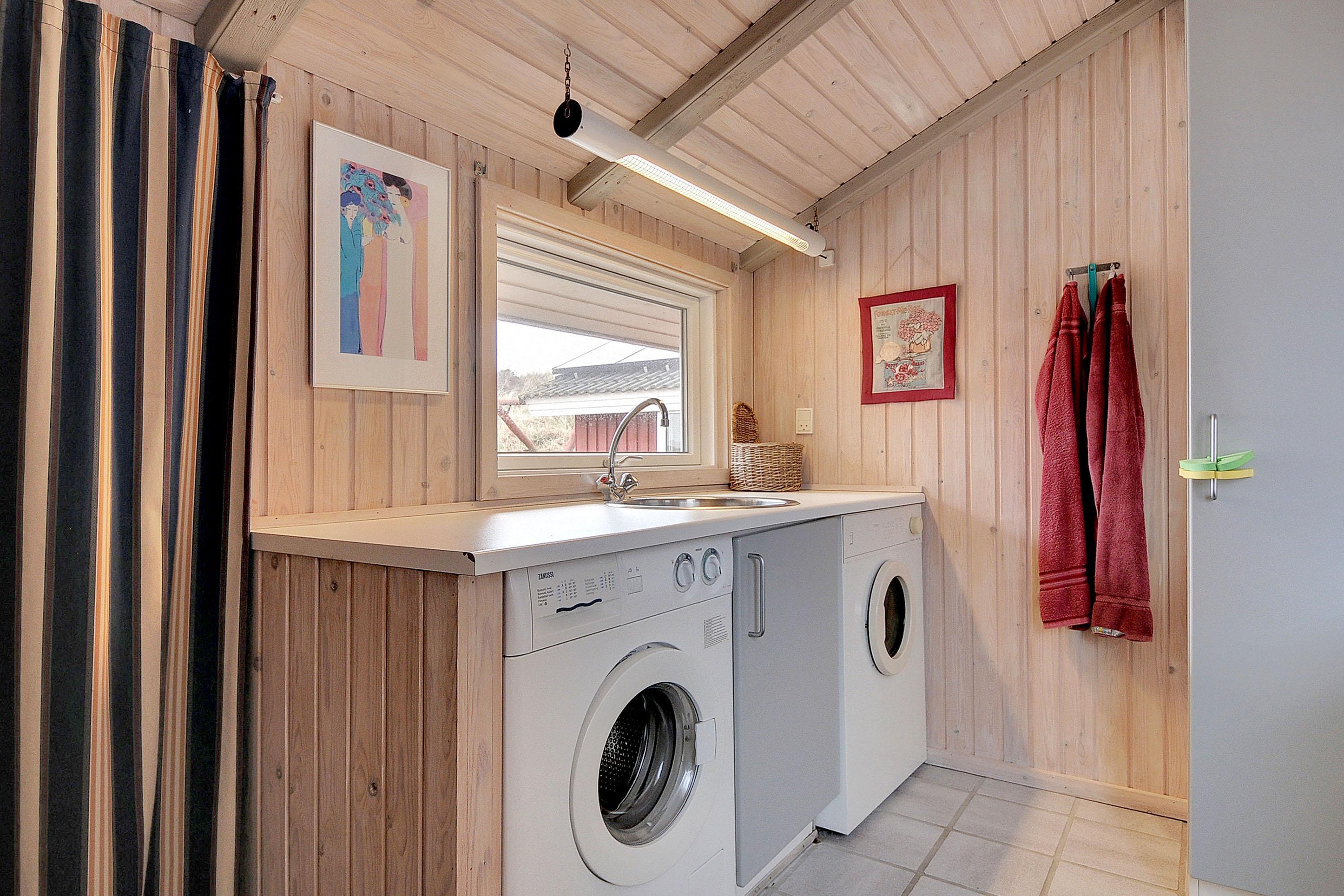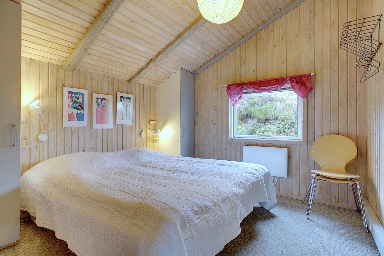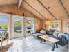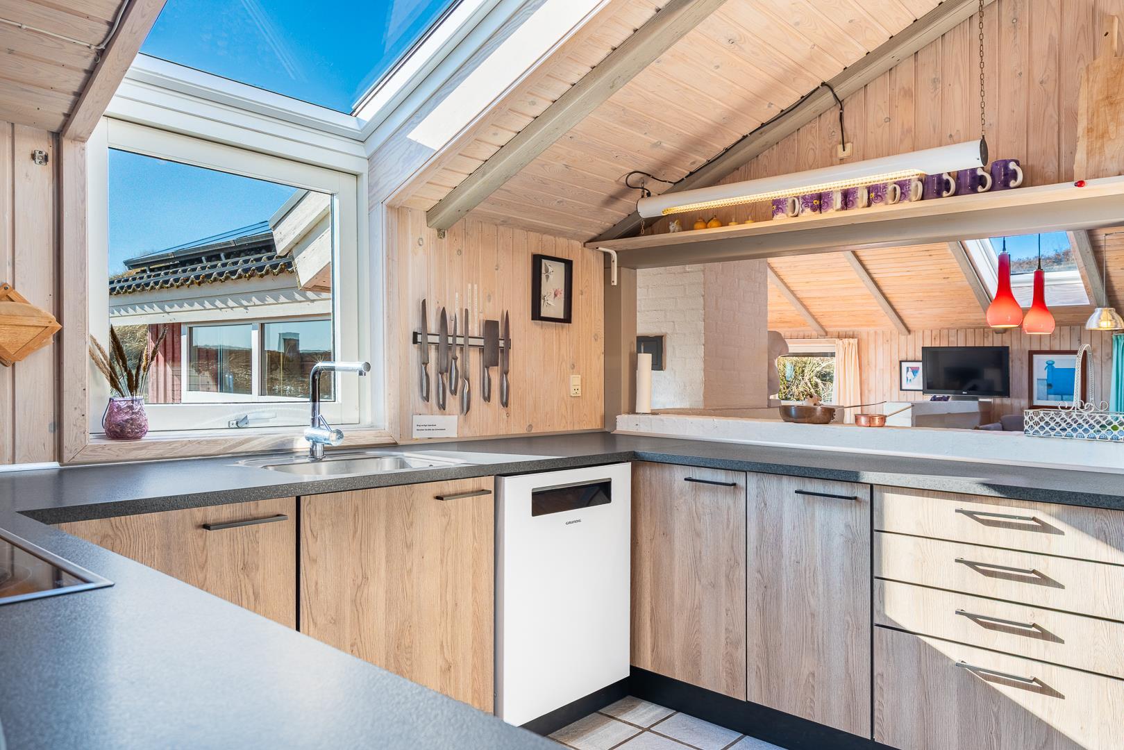 Hyggeligt højtbeliggende feriehus med flot udsigt over sommerhusområdet. Til huset hører en stor dejlig sydvendt terrasse. Dejligt køkken med god bordplads i åben forbindelse til spiseafdeling og opholdsafdeling med TV. 1 trin ned har man endnu en opholdsafdeling med stor brændeovn med glasrude så man kan se ilden fra hjørnesofaen. Desuden er der herfra udgang til terrassen. Huset rummer et stort badeværelse med stor 4 personers spa og sauna samt et ekstra toilet. Baggang med vaskemaskine og tørretumbler. Værdiboks.