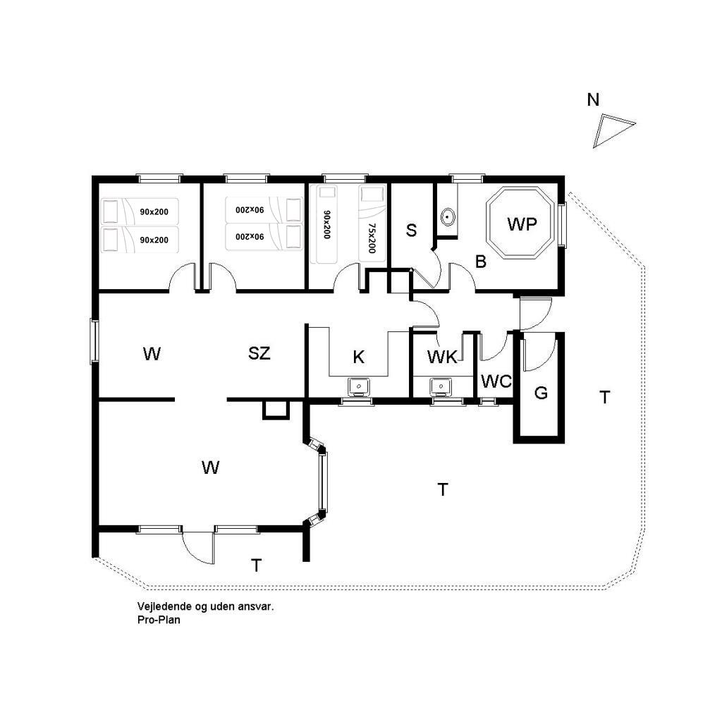 Sengestørrelse: 2 dobbeltsenge med 2 madrasser 90 x 200 cm + 1 enkeltseng 75 x 200 cm + 1 køjeseng 90 x 200 cm.