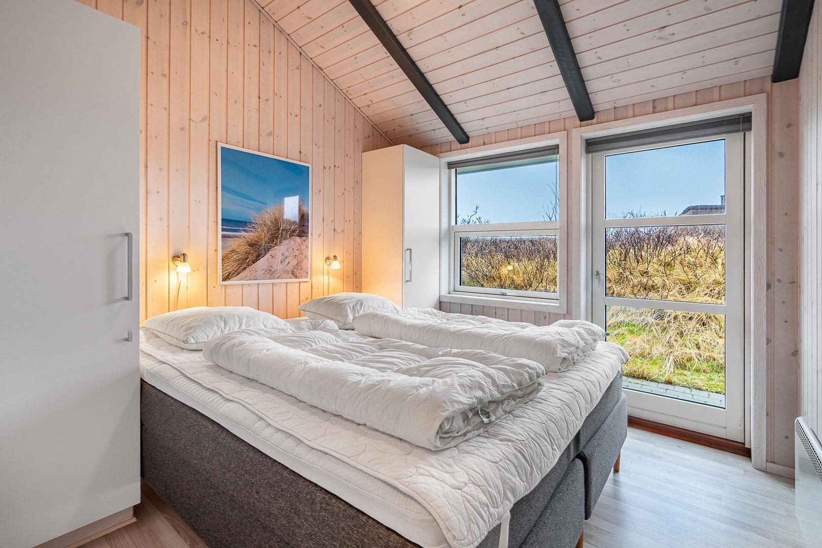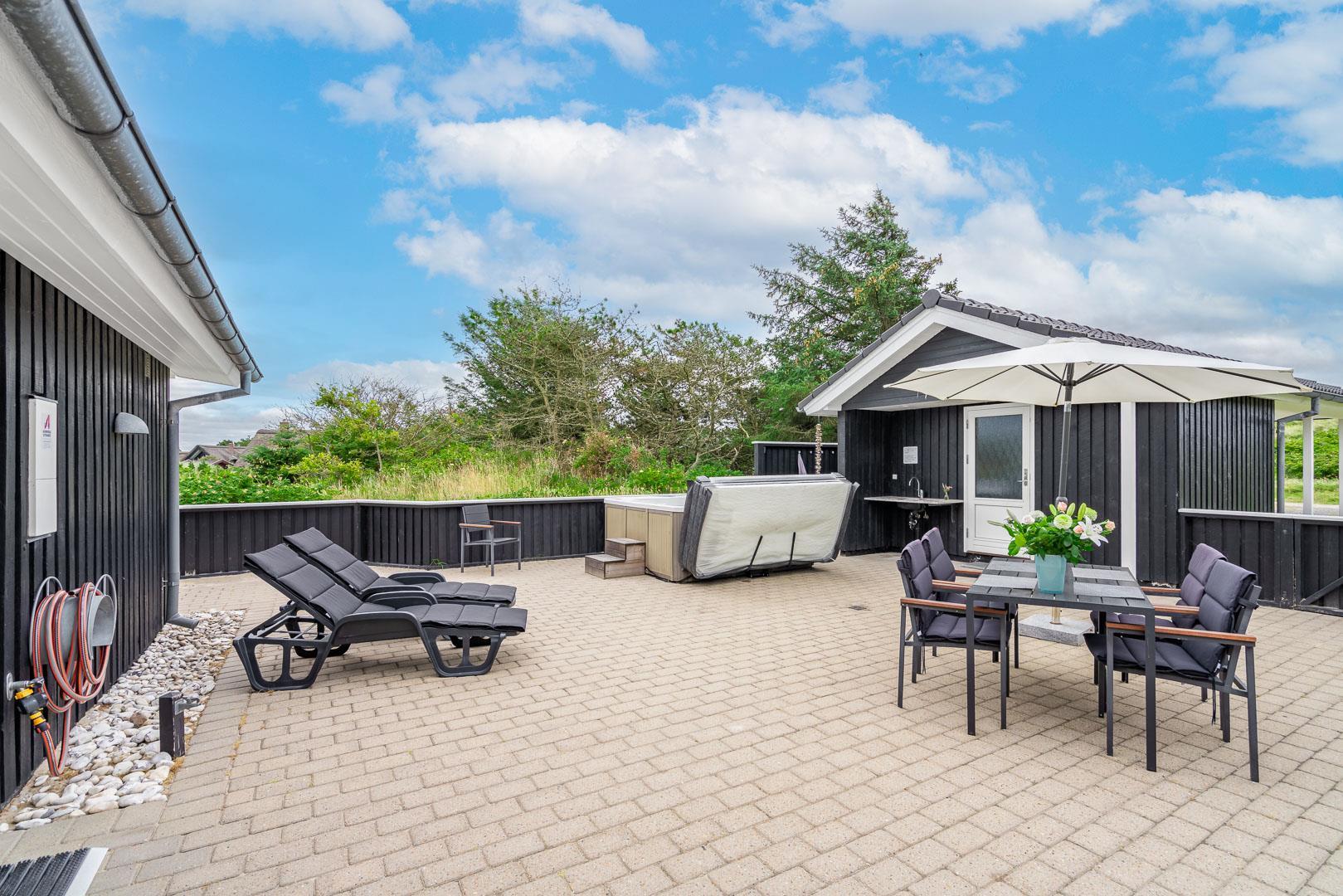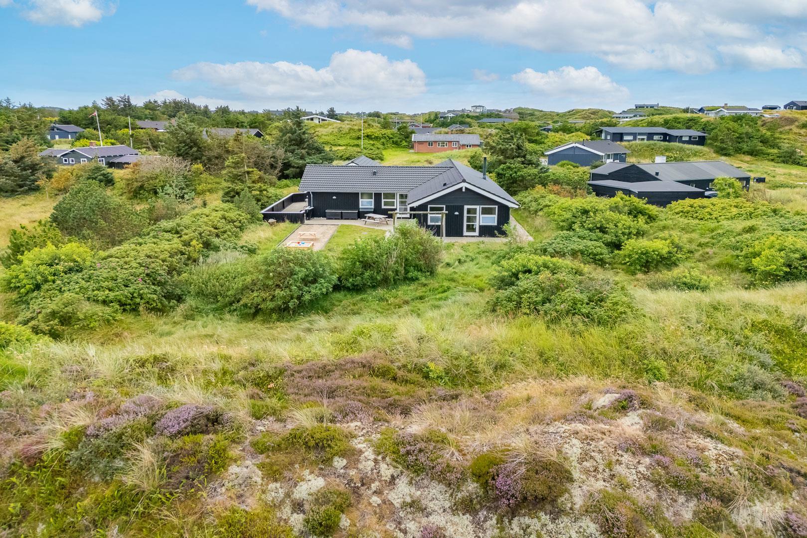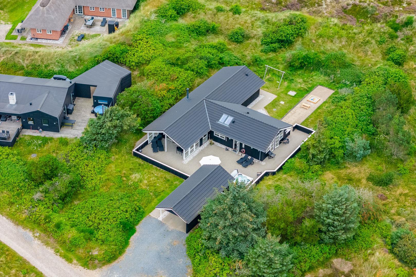 Velkommen til dette fantastiske sommerhus i Henne Strand ved Vestkysten, der kan rumme op til 10 personer. Hvert hjørne af dette sommerhus er indrettet med smagfulde og lyse materialer, der skaber en dejlig atmosfære. Et stort og lækkert køkken ligger i åben forbindelse med den fine stue med brændeovn og god plads til alle. Stuen er rummelig og indbydende, perfekt til både afslapning og socialt samvær. Fra stuen er der udgang til den dejlige store terrasse, hvor du kan slappe af i den luksuriøse udendørsspa og nyde den friske luft. Terrassen strækker sig næsten rundt om hele sommerhuset - hvert soveværelse har sin egen udgang, så du kan nyde morgensolen eller aftensolen i fulde drag. I feriehusets finder du 5 soveværelser hvoraf alle er med skønne dobbeltsenge.