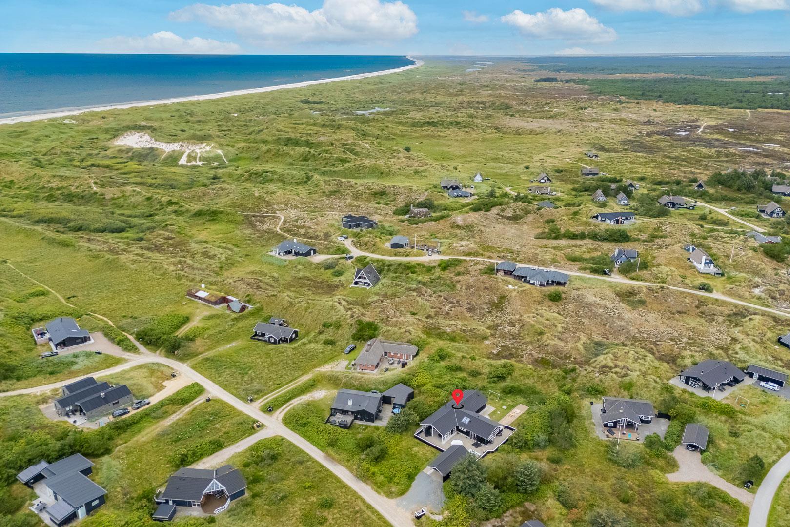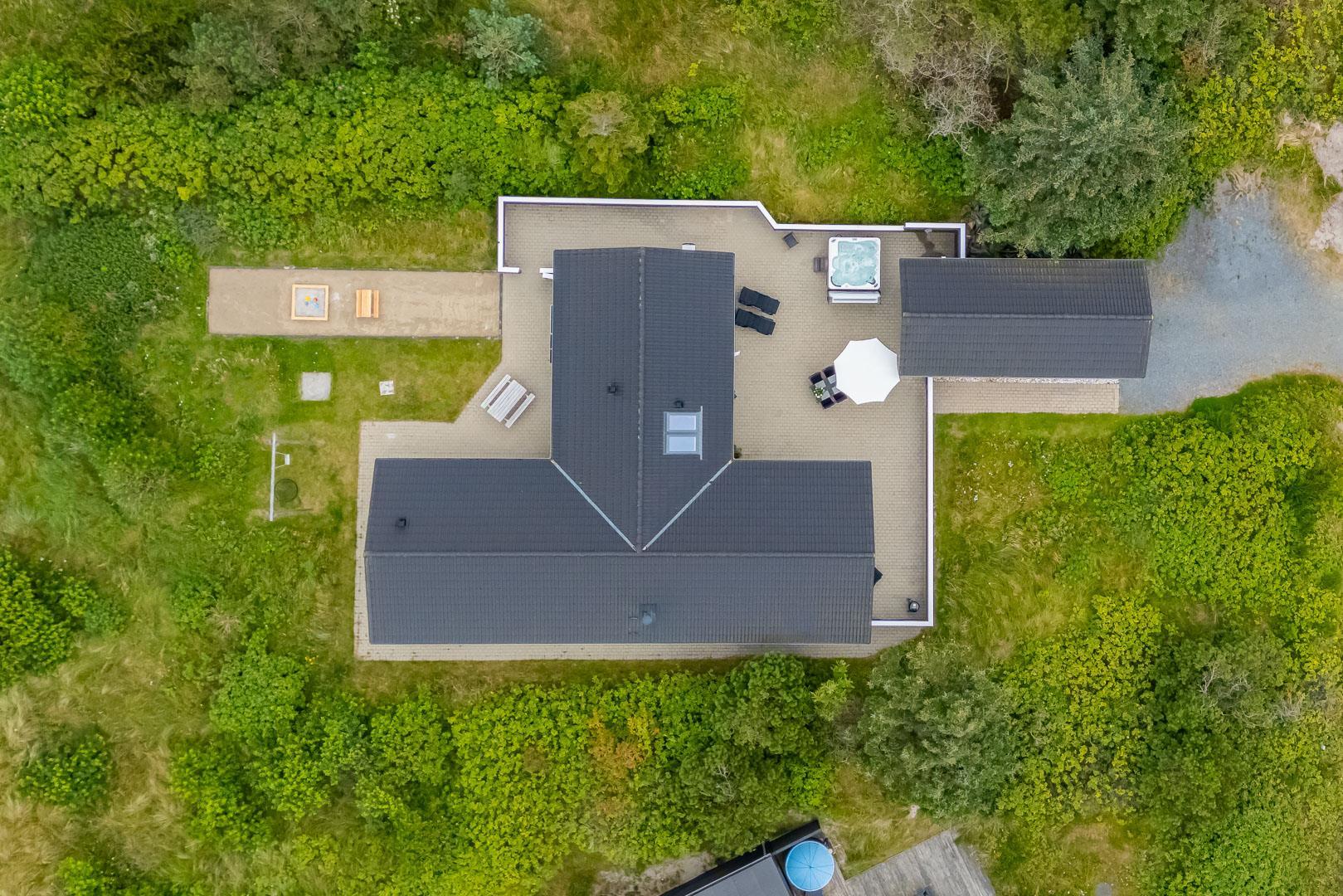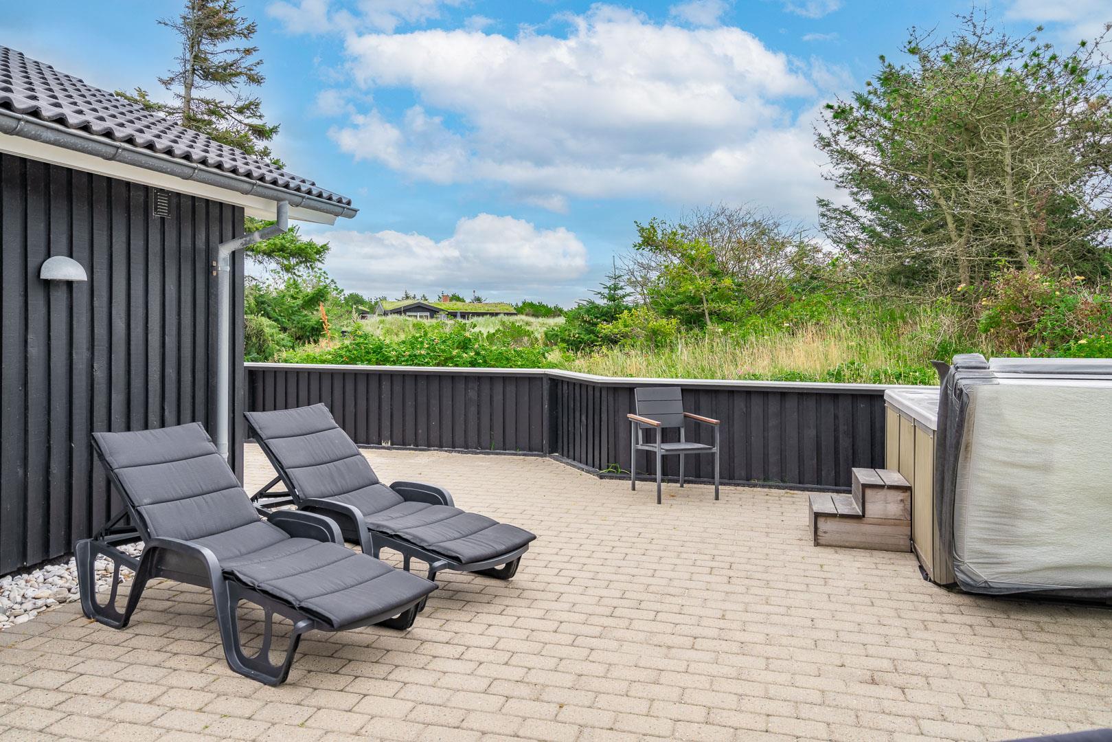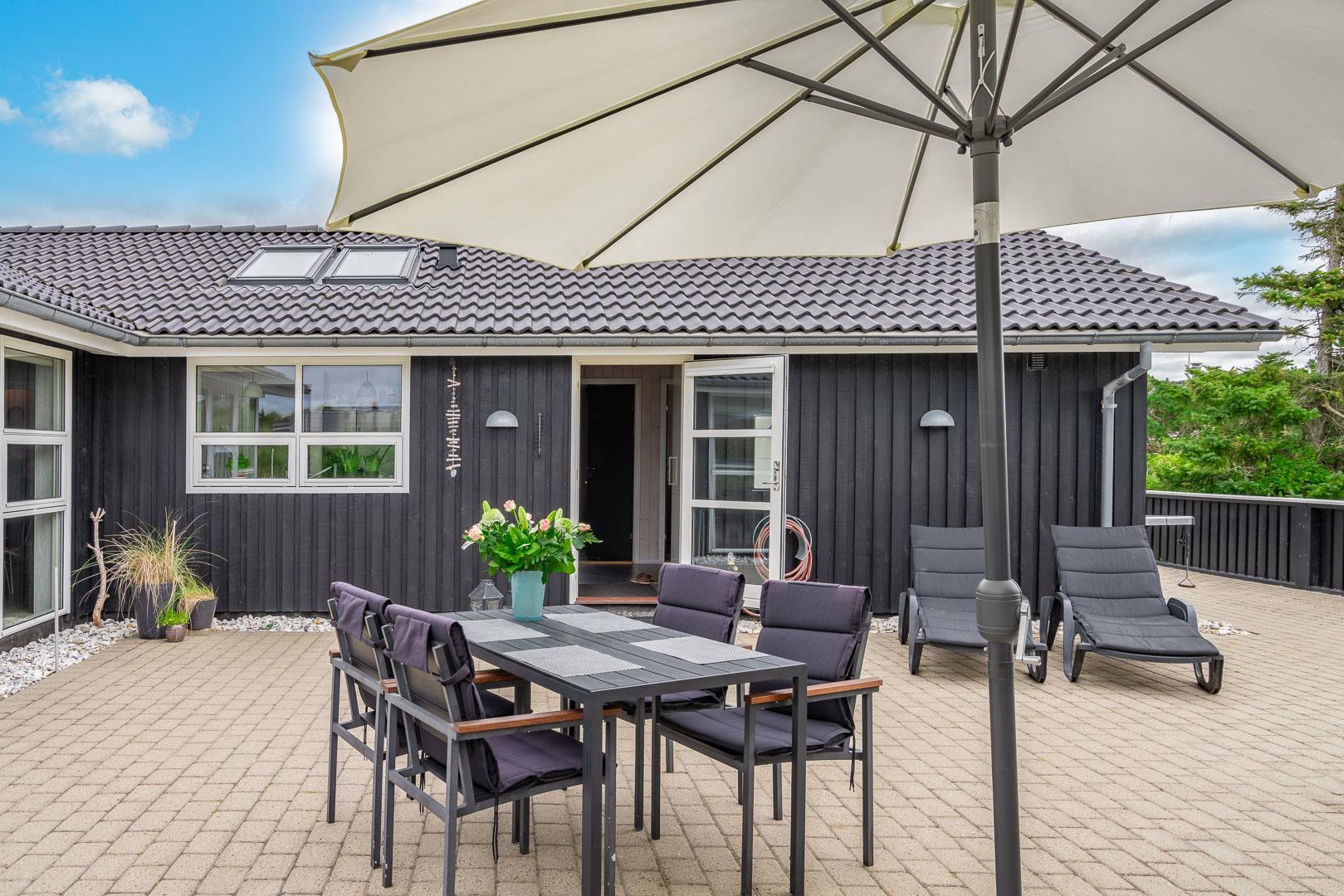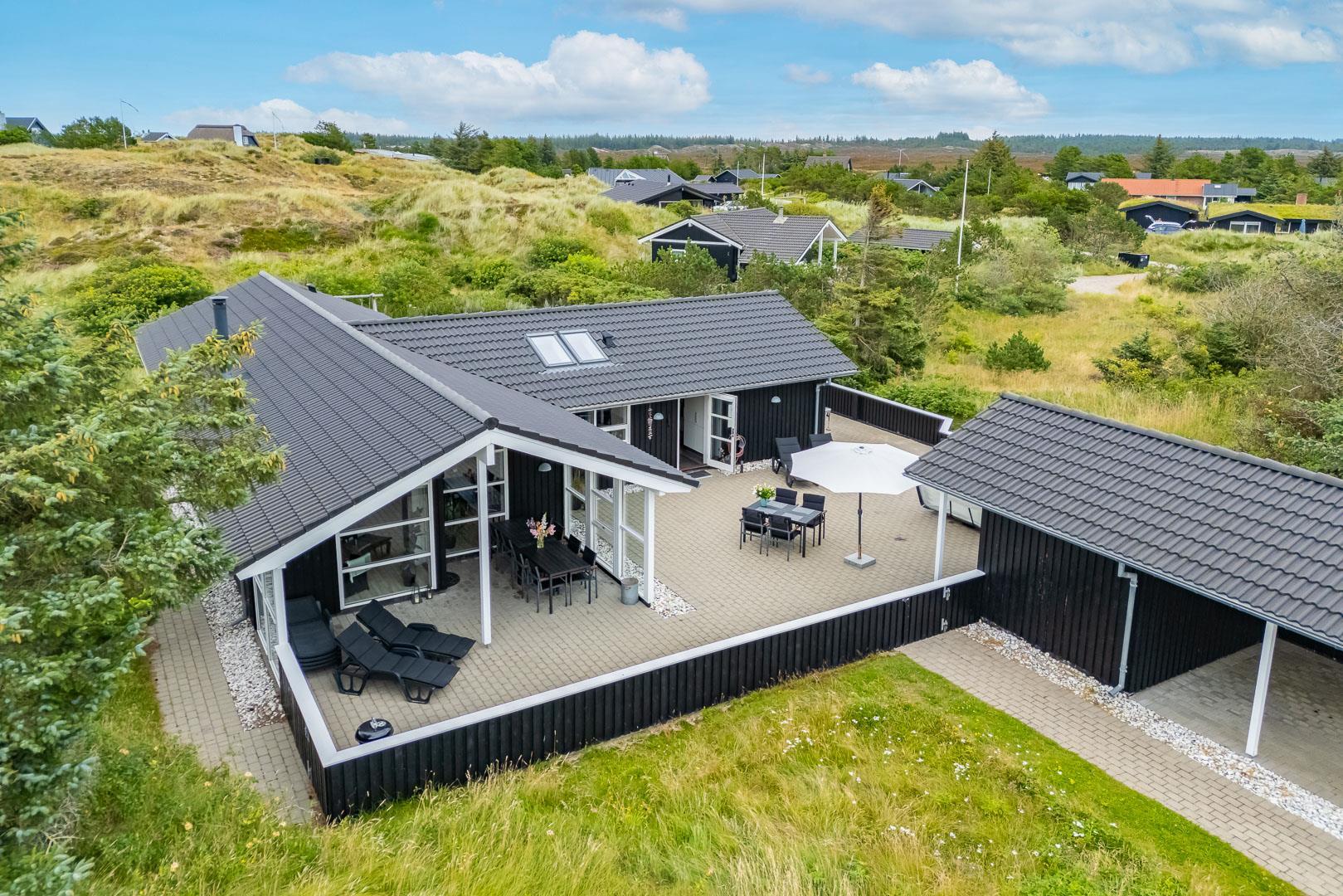 Velkommen til dette fantastiske sommerhus i Henne Strand ved Vestkysten, der kan rumme op til 10 personer. Hvert hjørne af dette sommerhus er indrettet med smagfulde og lyse materialer, der skaber en dejlig atmosfære. Et stort og lækkert køkken ligger i åben forbindelse med den fine stue med brændeovn og god plads til alle. Stuen er rummelig og indbydende, perfekt til både afslapning og socialt samvær. Fra stuen er der udgang til den dejlige store terrasse, hvor du kan slappe af i den luksuriøse udendørsspa og nyde den friske luft. Terrassen strækker sig næsten rundt om hele sommerhuset - hvert soveværelse har sin egen udgang, så du kan nyde morgensolen eller aftensolen i fulde drag. I feriehusets finder du 5 soveværelser hvoraf alle er med skønne dobbeltsenge.