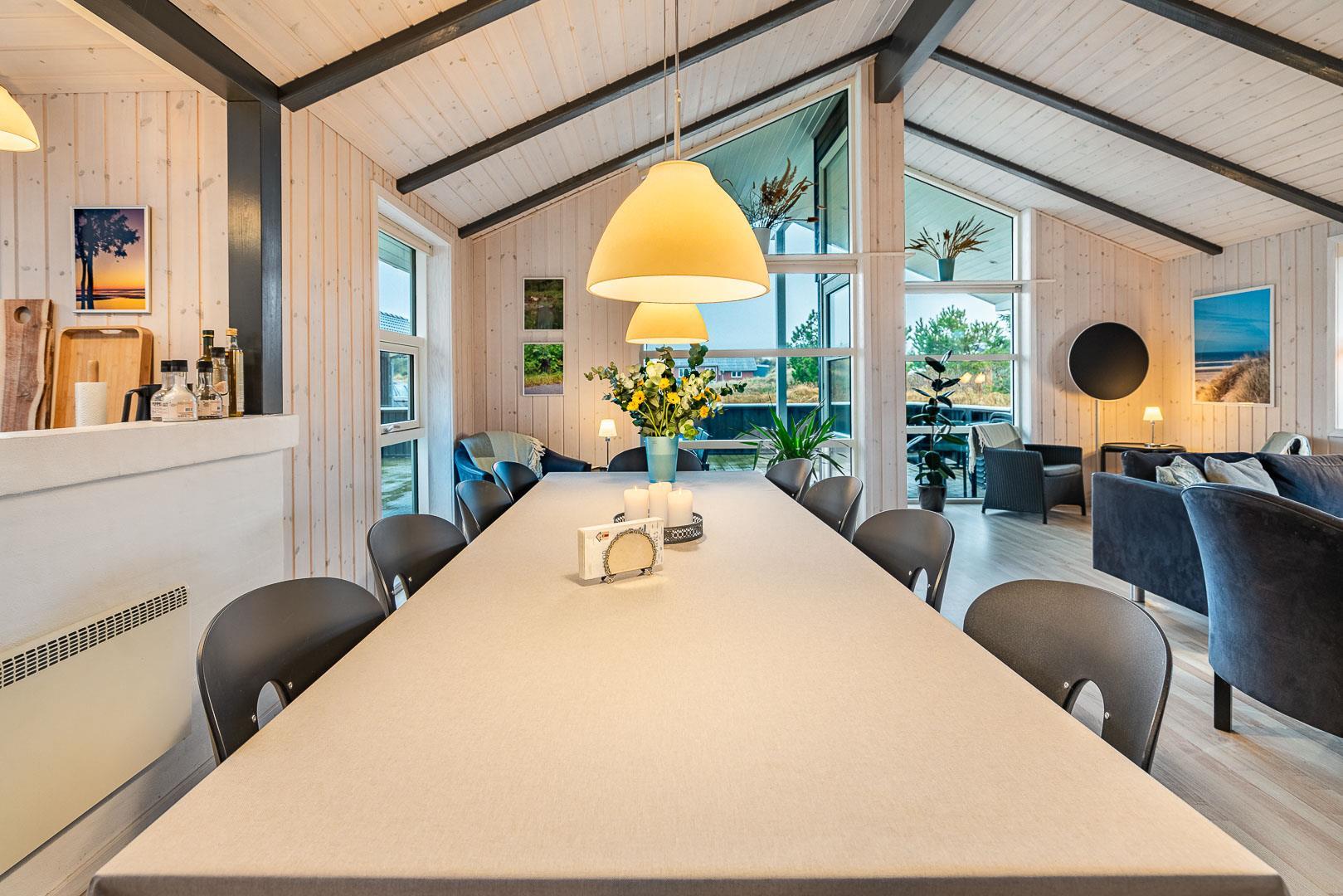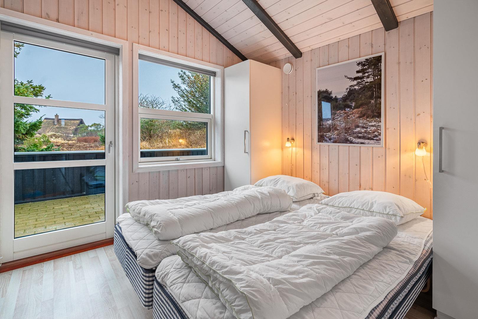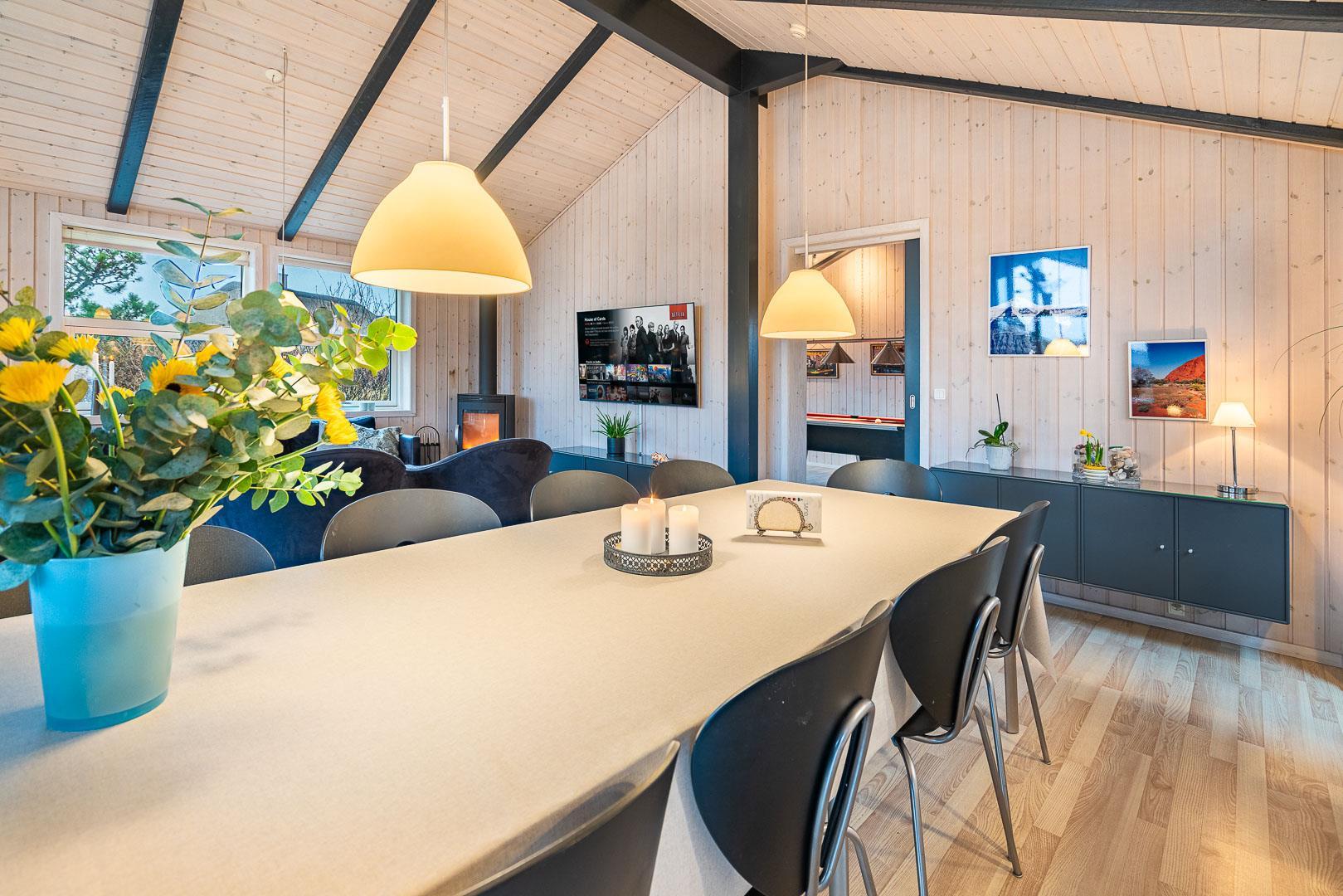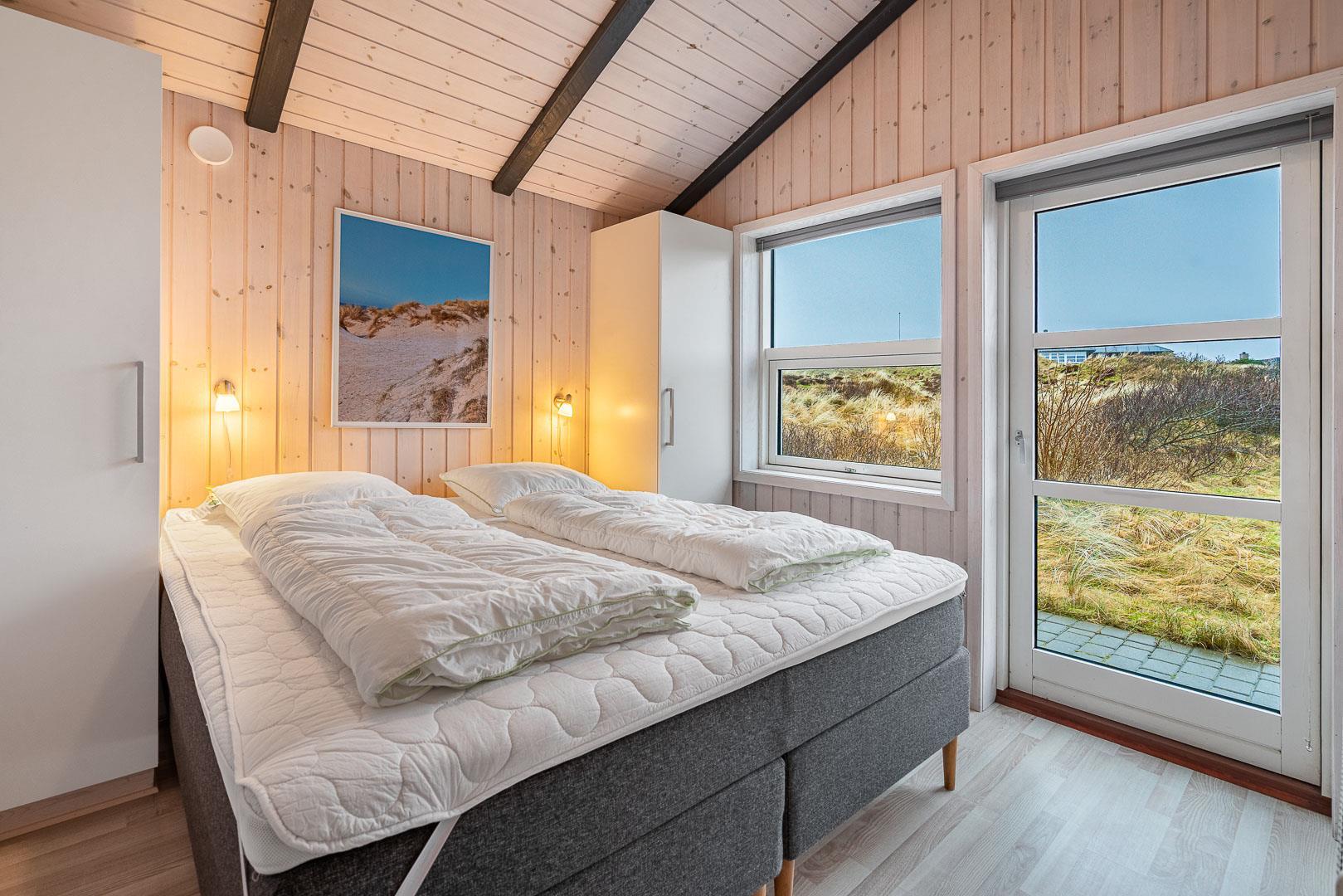 Velkommen til dette fantastiske sommerhus i Henne Strand ved Vestkysten, der kan rumme op til 10 personer. Hvert hjørne af dette sommerhus er indrettet med smagfulde og lyse materialer, der skaber en dejlig atmosfære. Et stort og lækkert køkken ligger i åben forbindelse med den fine stue med brændeovn og god plads til alle. Stuen er rummelig og indbydende, perfekt til både afslapning og socialt samvær. Fra stuen er der udgang til den dejlige store terrasse, hvor du kan slappe af i den luksuriøse udendørsspa og nyde den friske luft. Terrassen strækker sig næsten rundt om hele sommerhuset - hvert soveværelse har sin egen udgang, så du kan nyde morgensolen eller aftensolen i fulde drag. I feriehusets finder du 5 soveværelser hvoraf alle er med skønne dobbeltsenge.