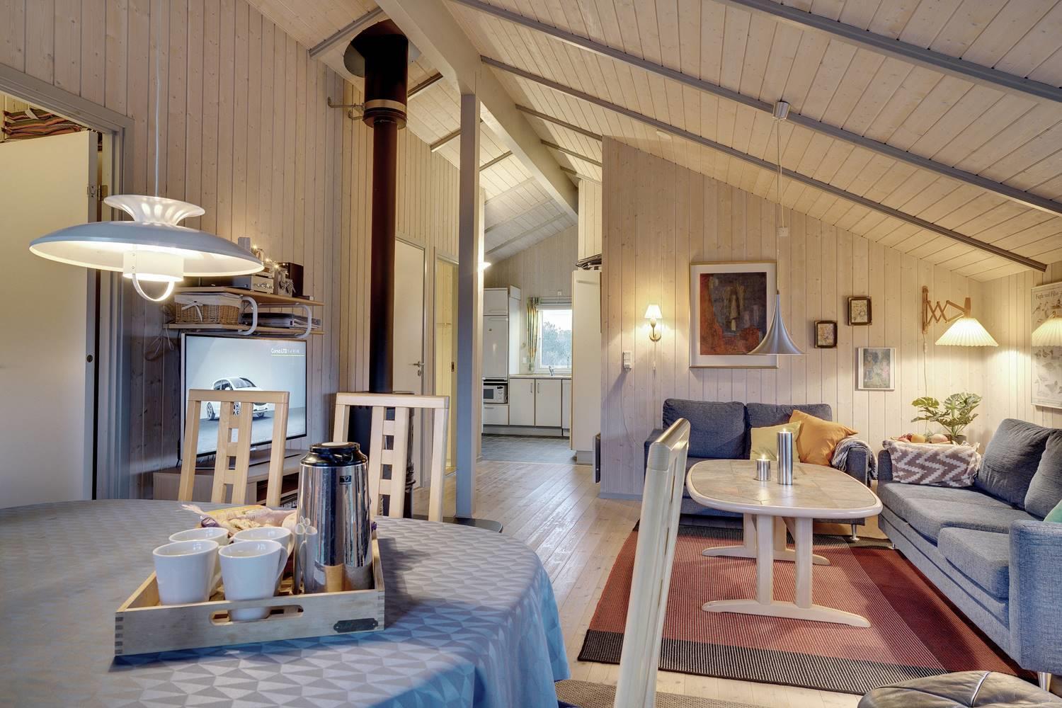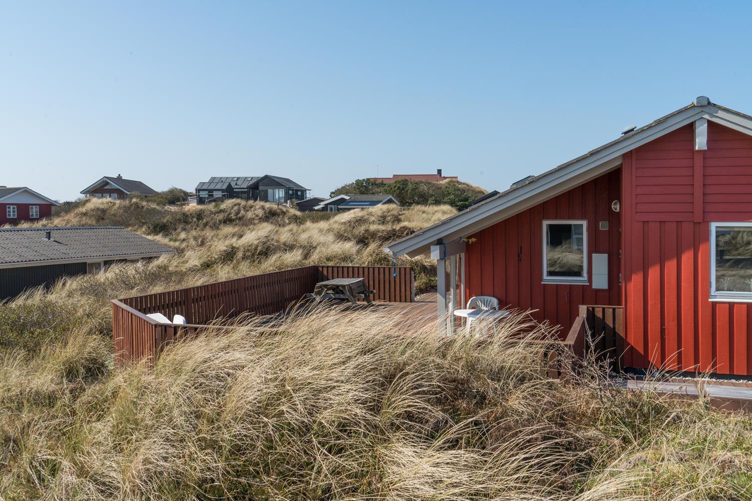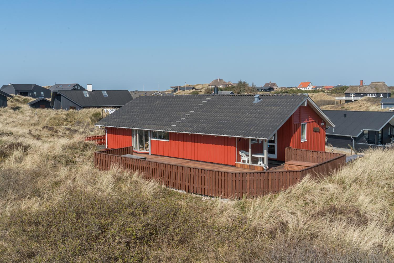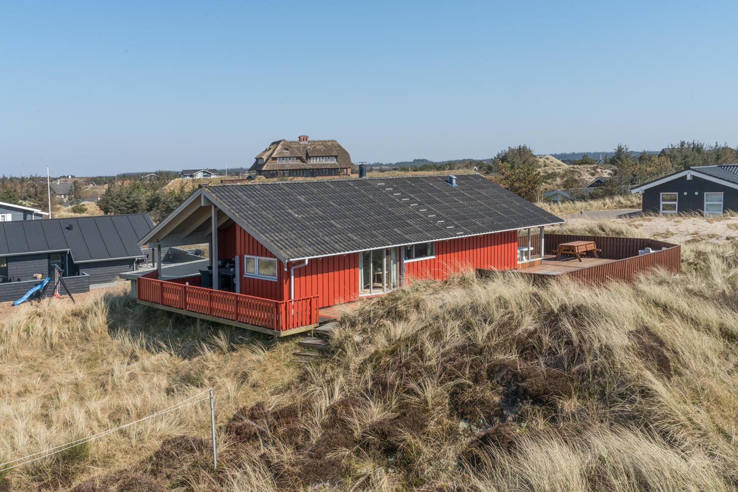 Husets hjerte er den hyggelige stue med brændeovn, der skaber varme og stemning på kølige aftener. Herfra er der direkte adgang til de store træterrasser – delvist overdækkede – hvor man kan nyde kaffen om morgenen eller aftensolen over klitlandskabet. Terrasserne er perfekte til afslapning, grillhygge og samvær i det fri.