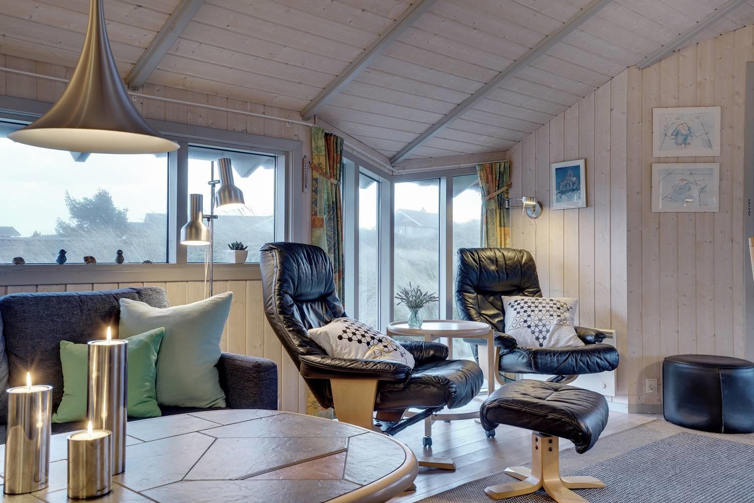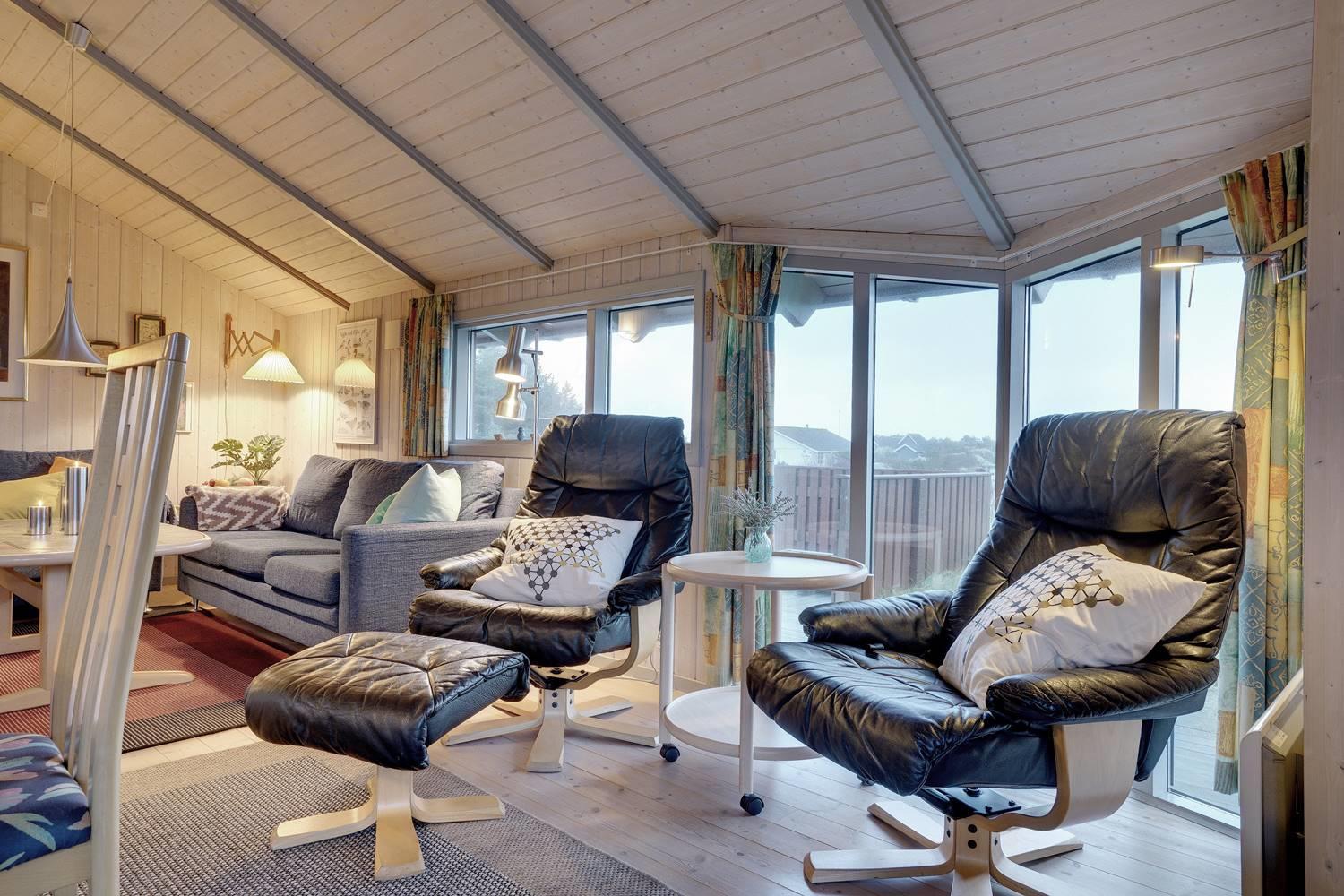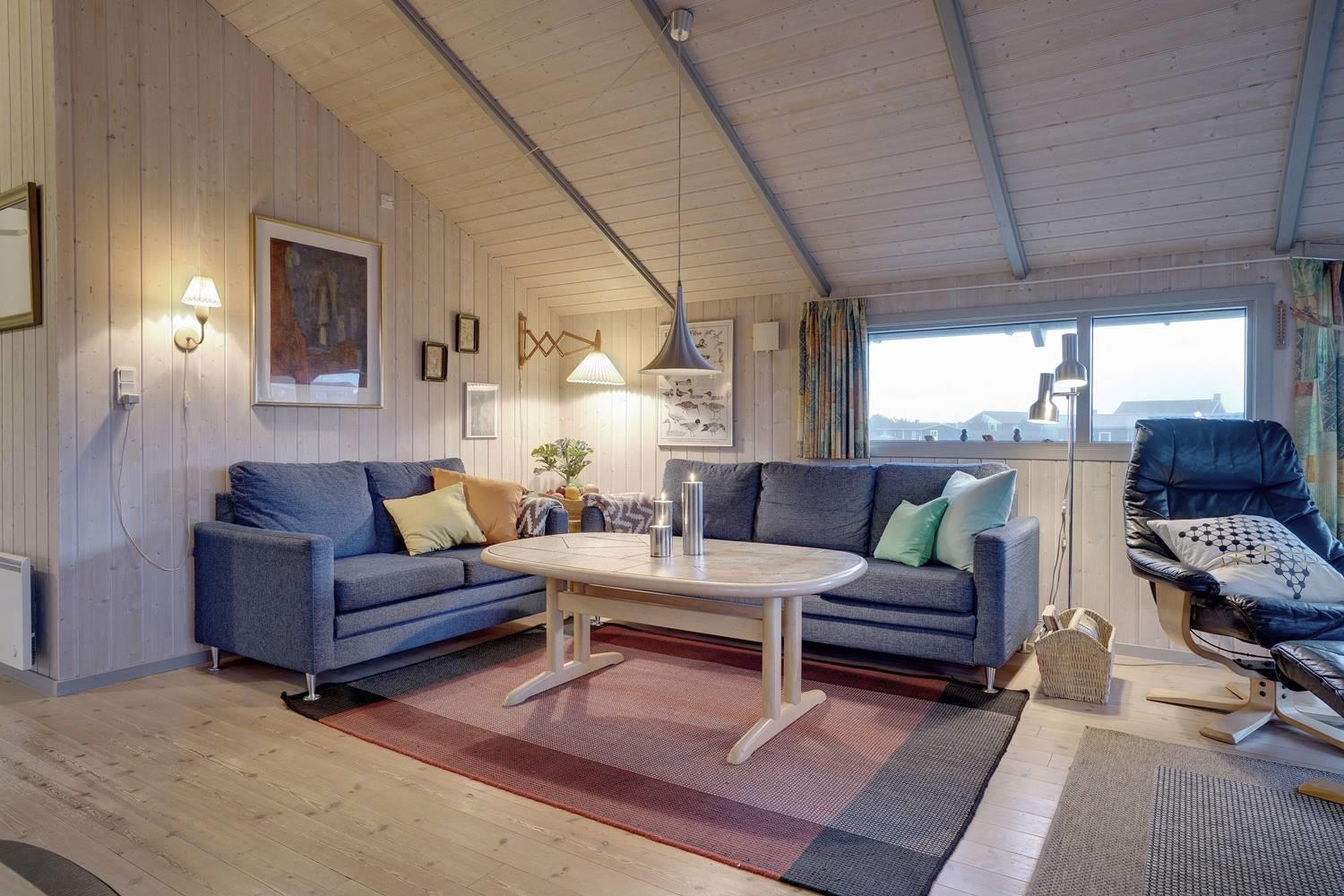 Husets hjerte er den hyggelige stue med brændeovn, der skaber varme og stemning på kølige aftener. Herfra er der direkte adgang til de store træterrasser – delvist overdækkede – hvor man kan nyde kaffen om morgenen eller aftensolen over klitlandskabet. Terrasserne er perfekte til afslapning, grillhygge og samvær i det fri.