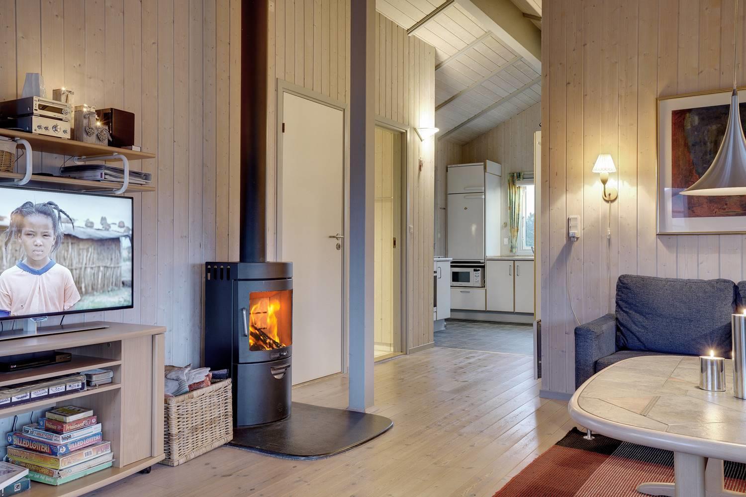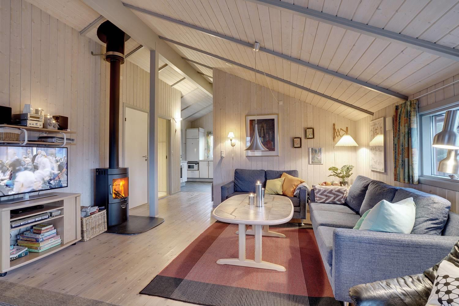 Stue med brændeovn og direkte adgang til solrig terrasse