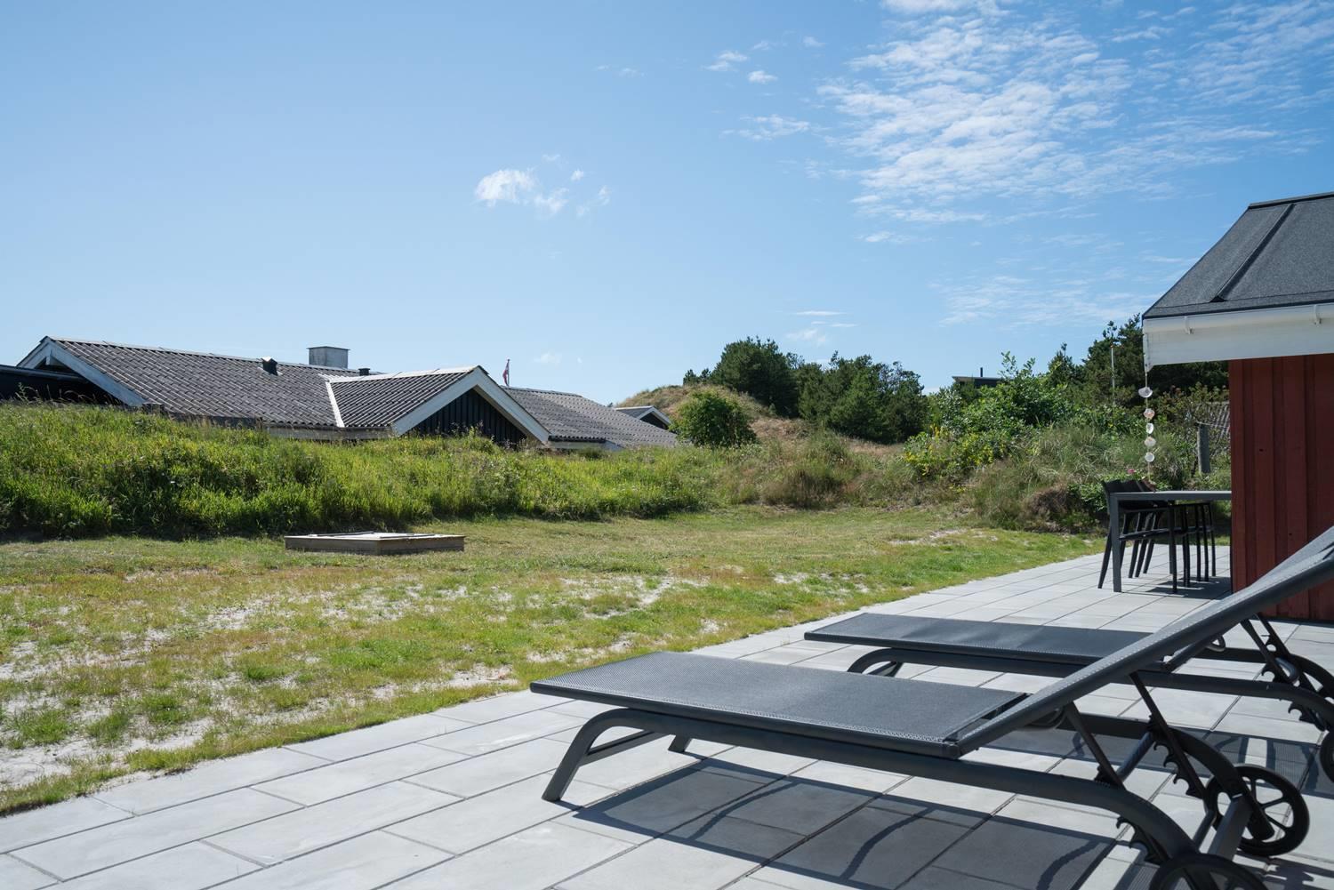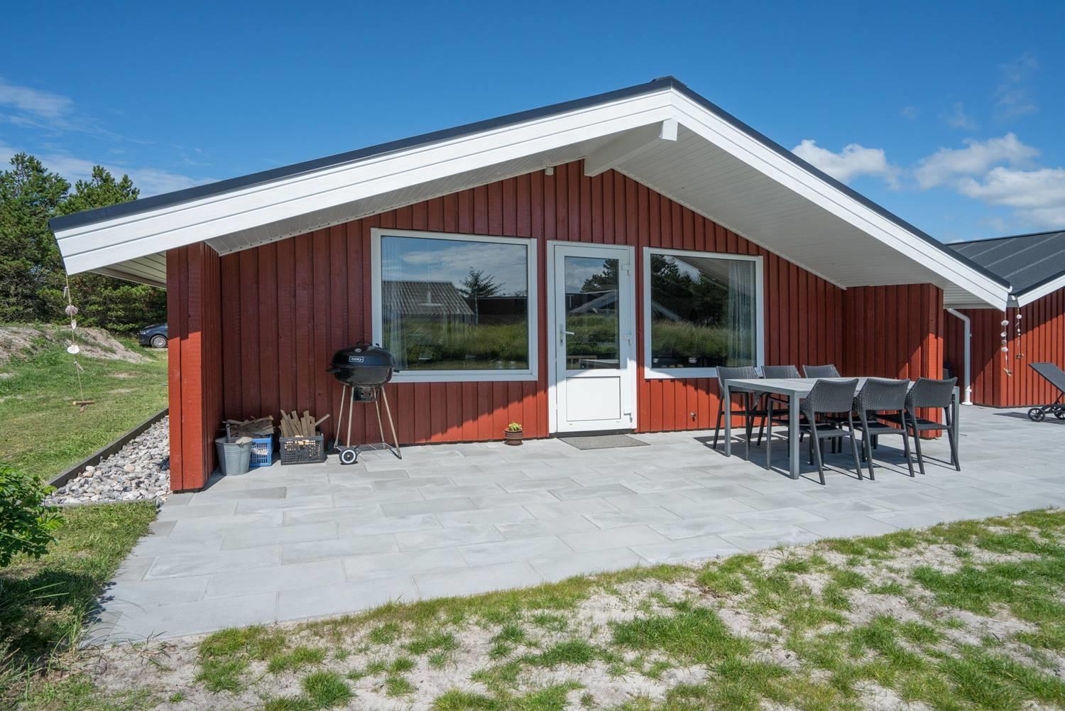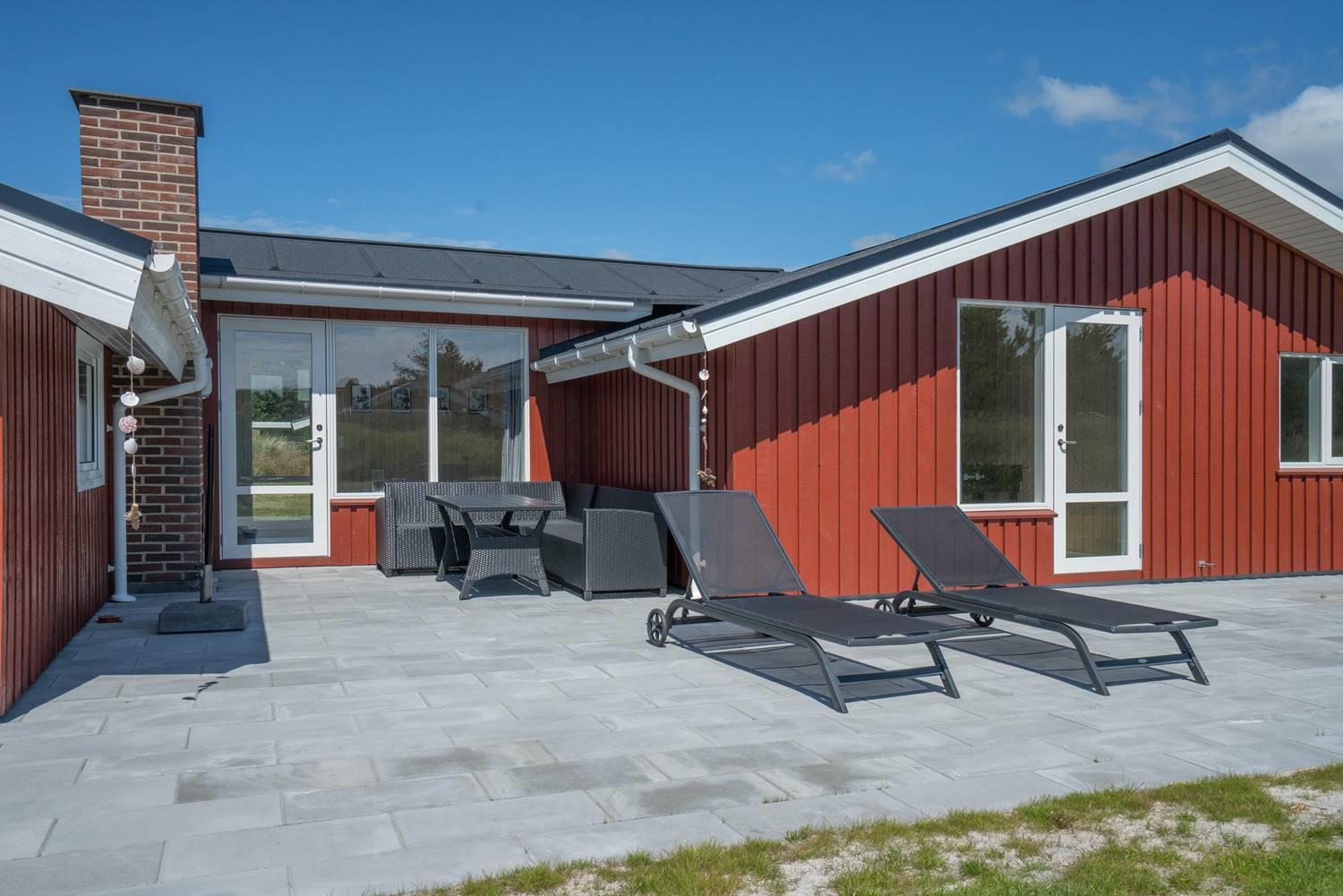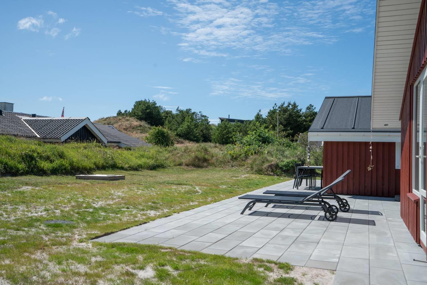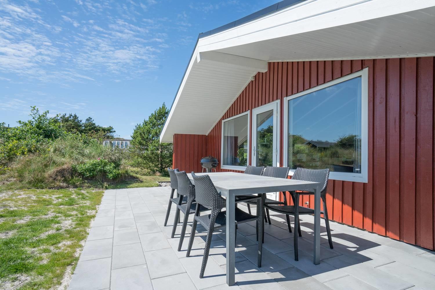 Dejligt feriehus i Henne Strand med stor terrasse, sauna, aktivitetsrum og kort afstand til vand og by.