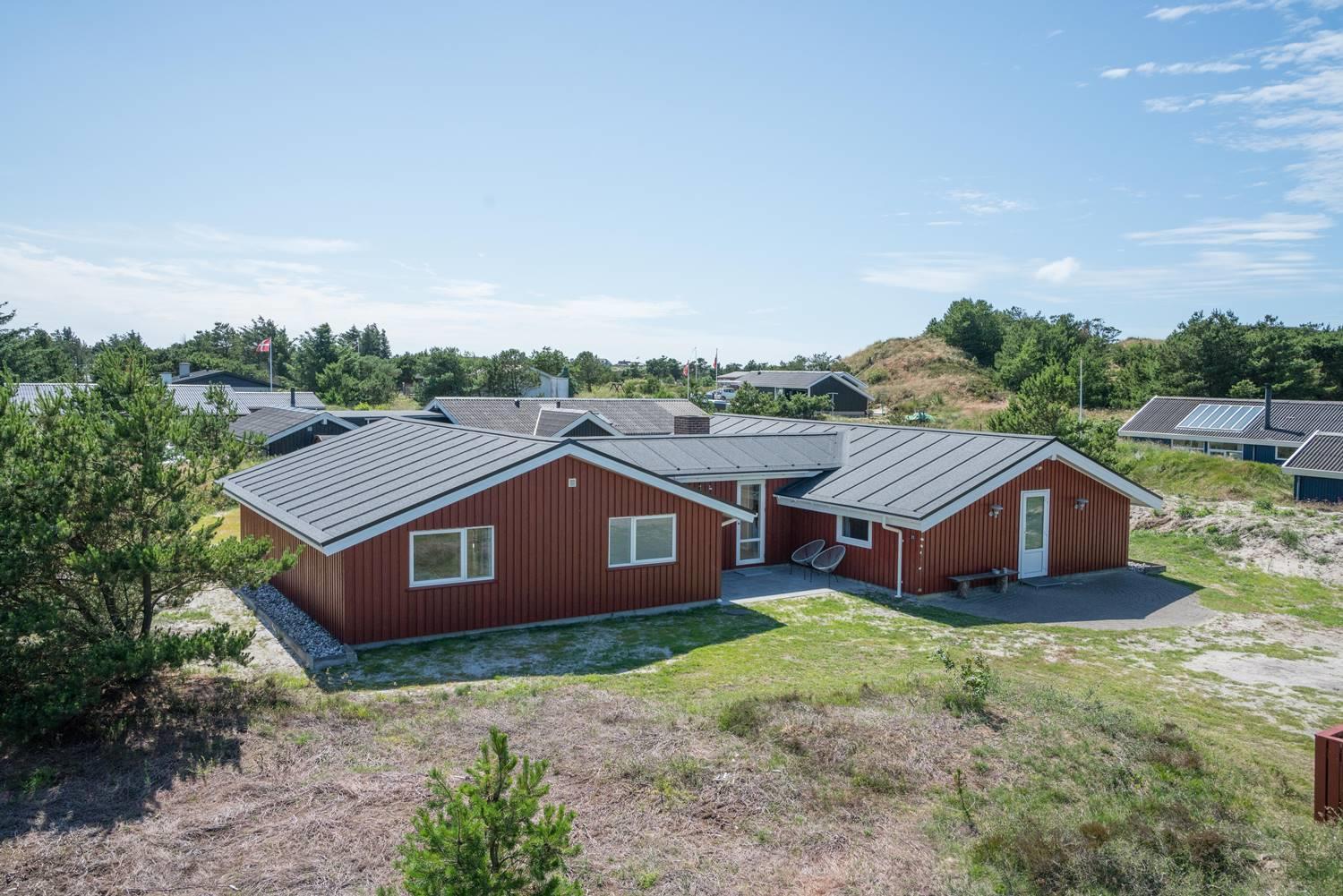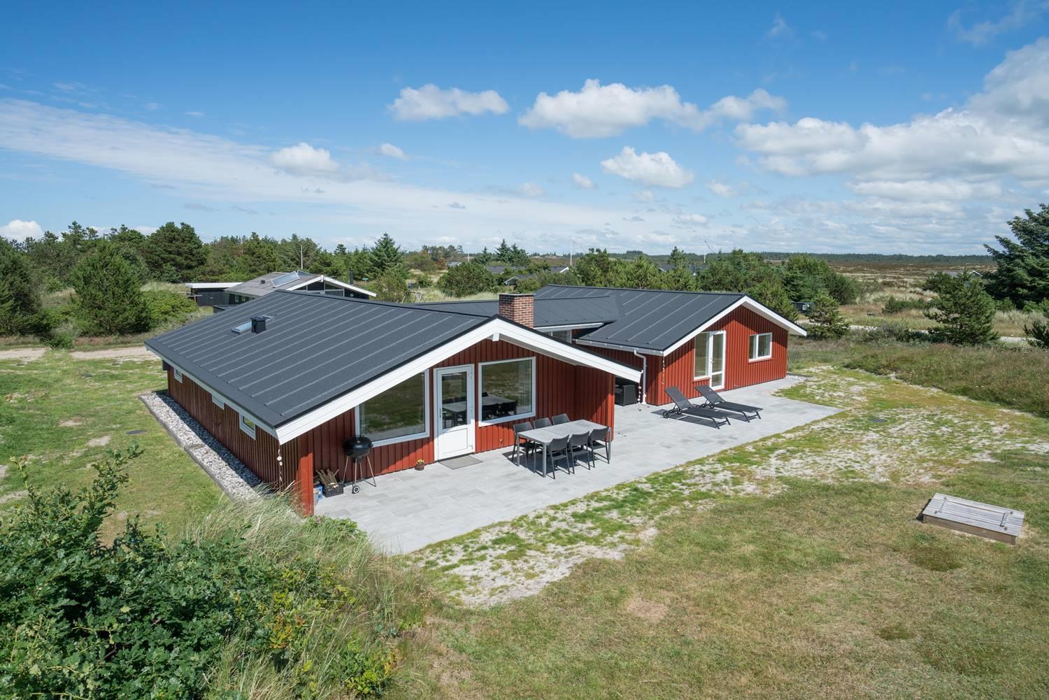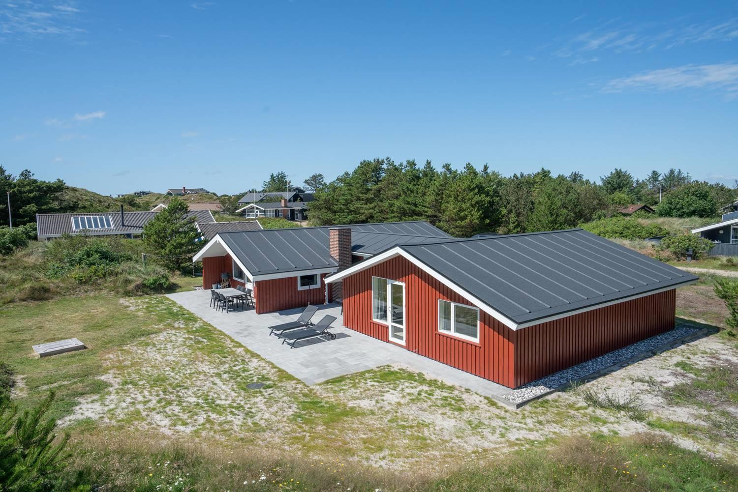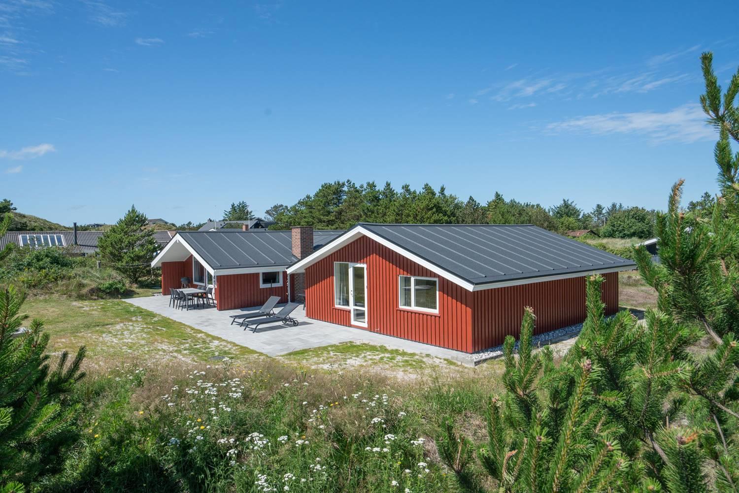 Dejligt feriehus i Henne Strand med stor terrasse, sauna, aktivitetsrum og kort afstand til vand og by.