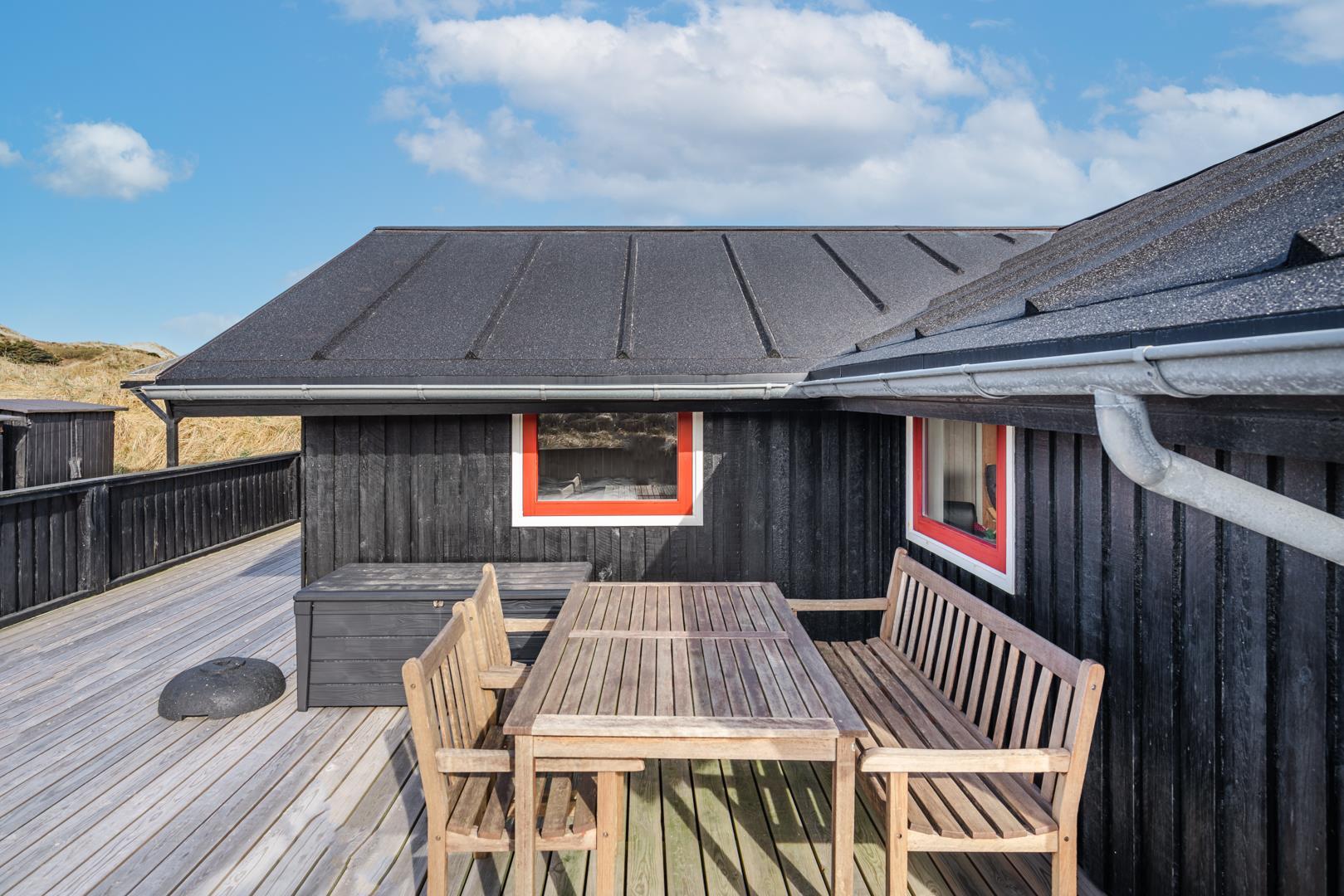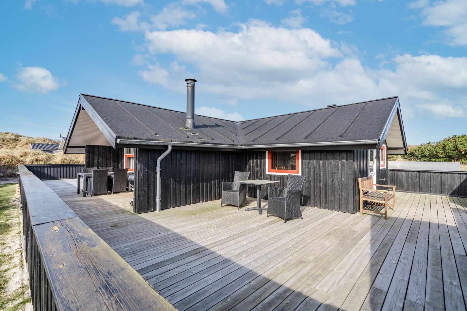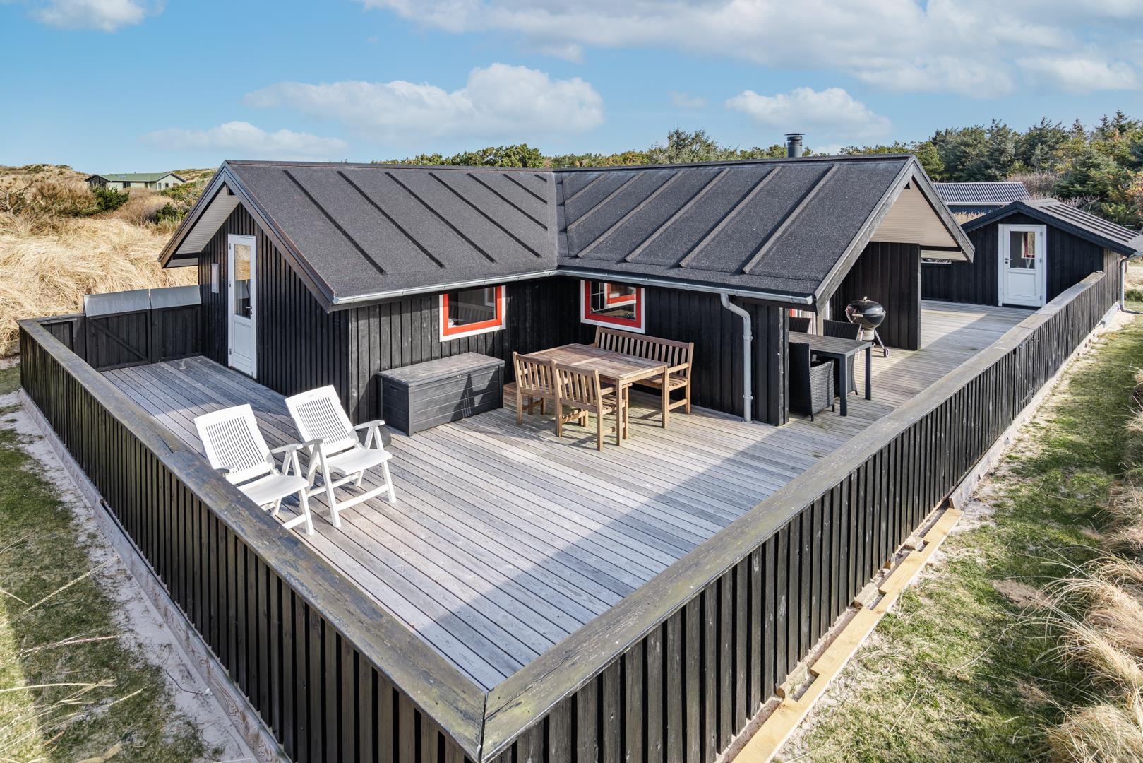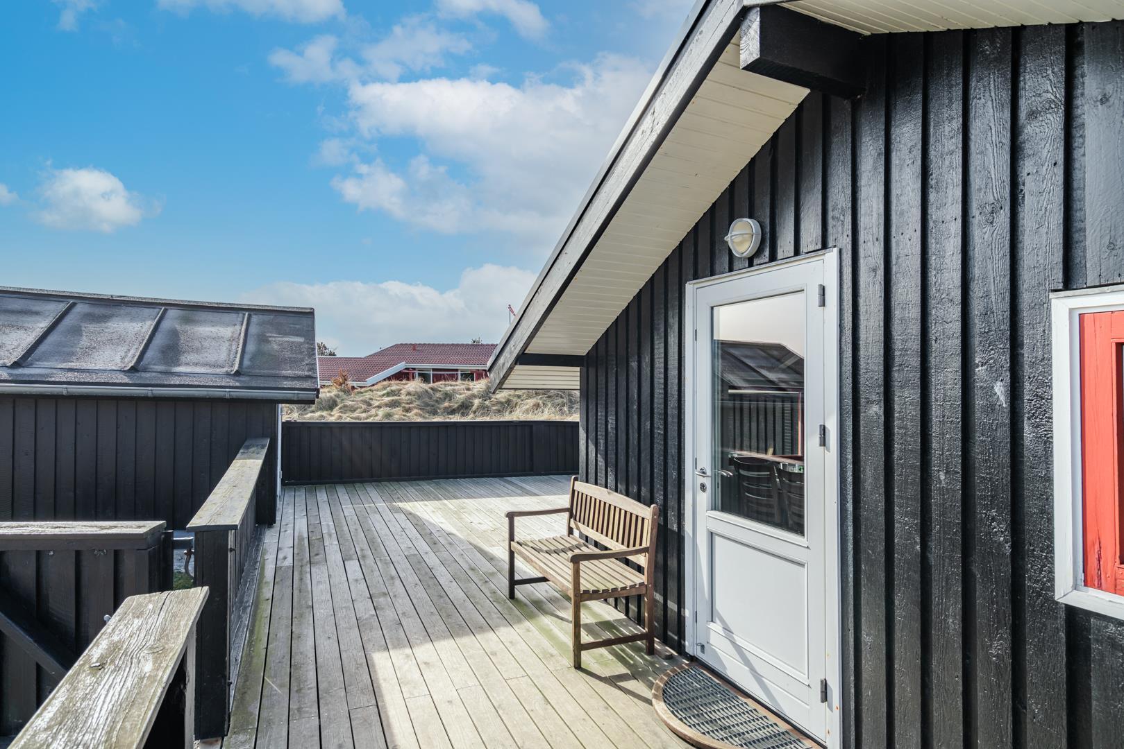 Den store indhegnede træterrasse er perfekt placeret i forhold til solen, så du kan nyde dagen fra morgenkaffen til solnedgangen.